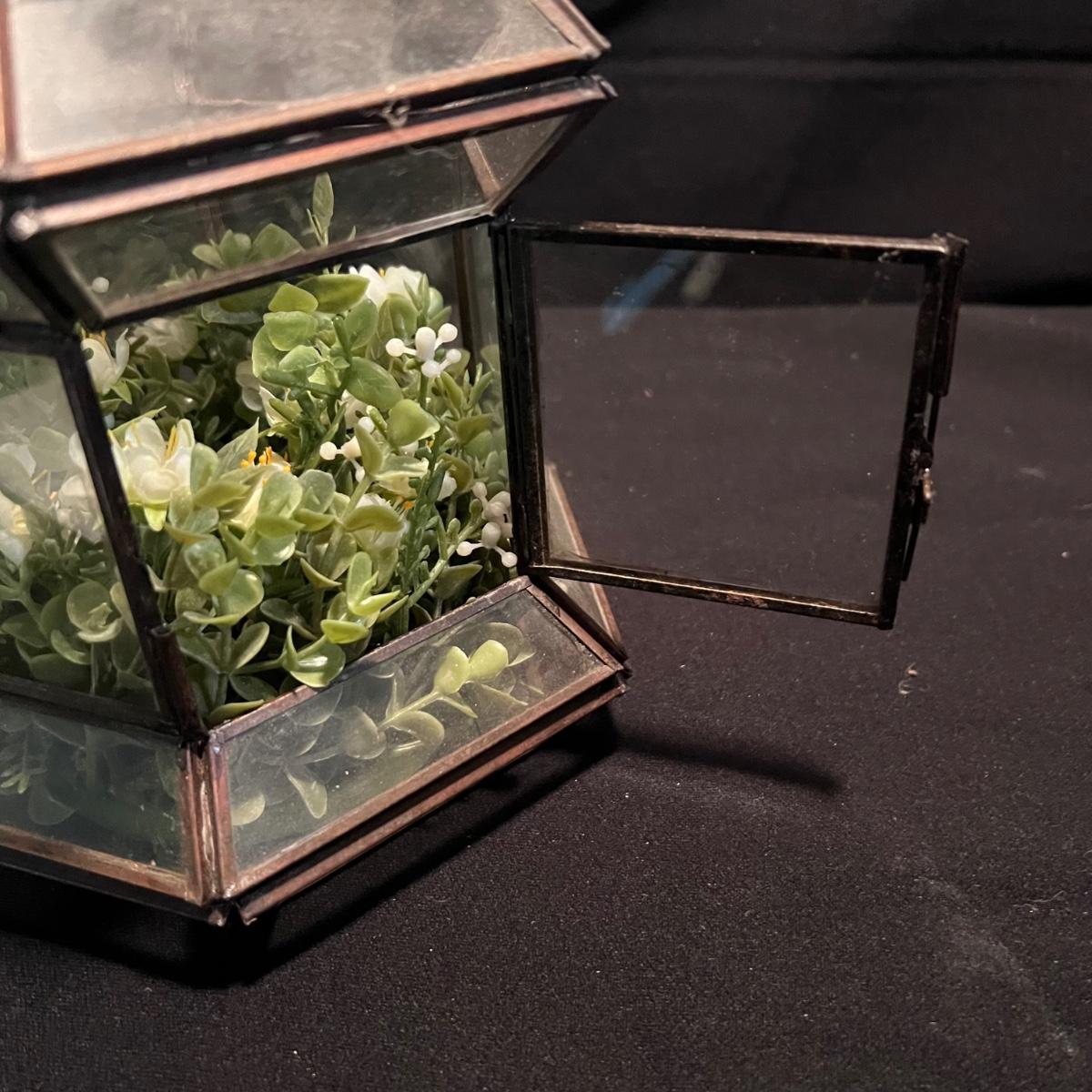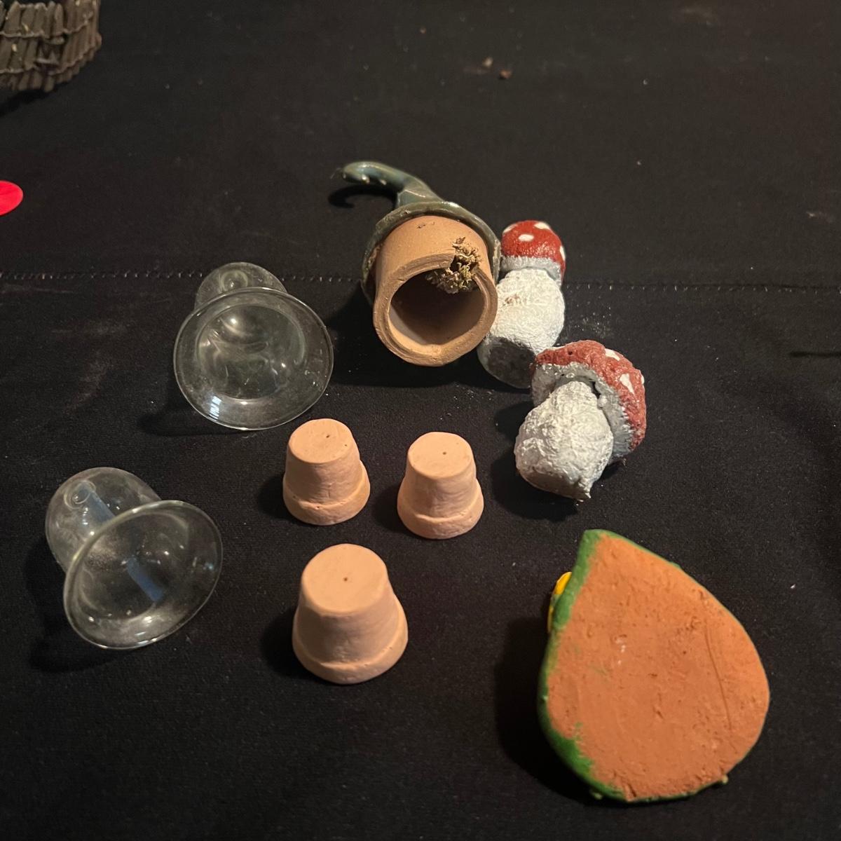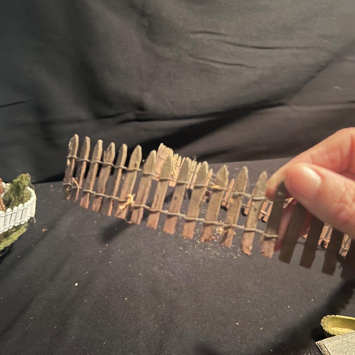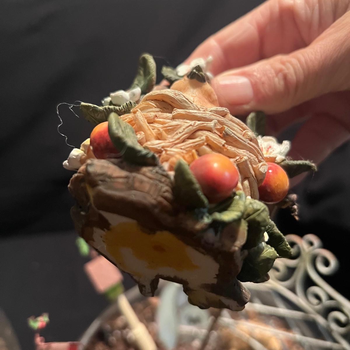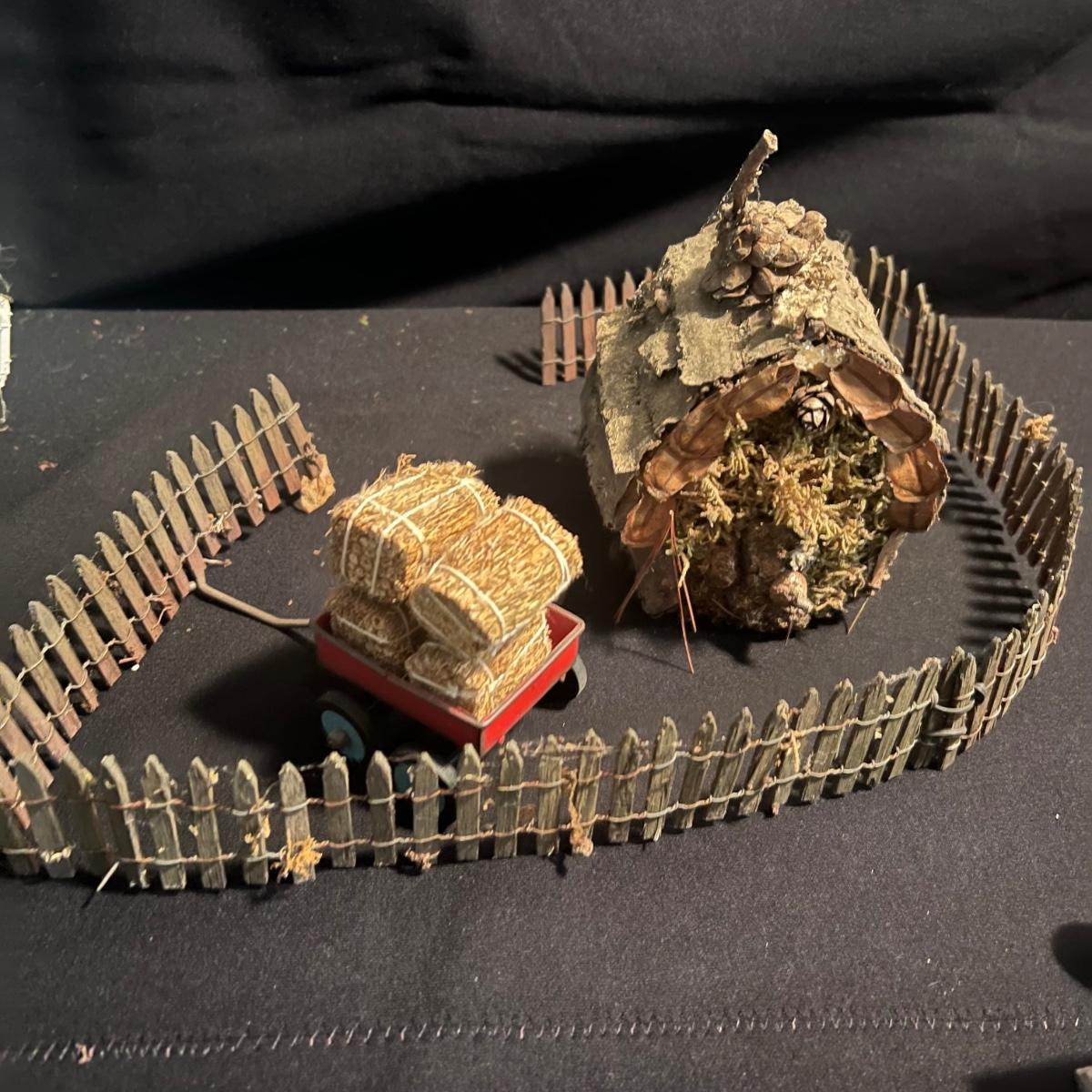 This adorable lot includes four glass terrariums. The tallest one which is the Moroccan style terrarium has faux plants in it; it measures measures 11”D x 12”H. Lots of miniature pieces for future projects such as fairy gardens. A mix of materials, mini patio table, bird cages, watering cans etc are metal. Lots of resin pieces as well and this lot even has straw bales.