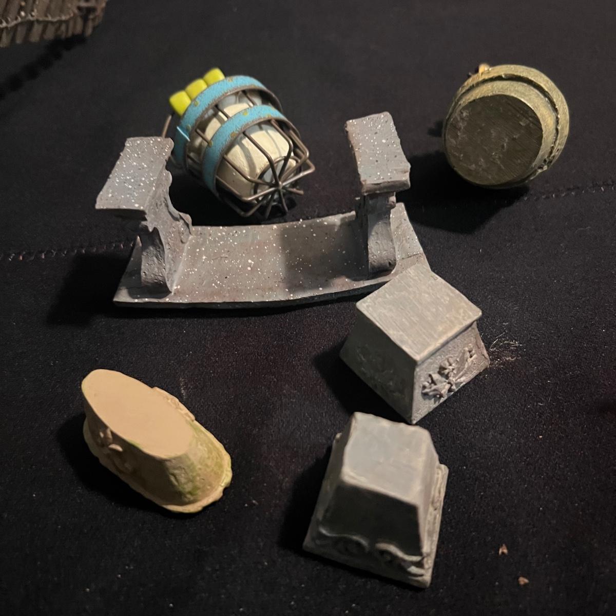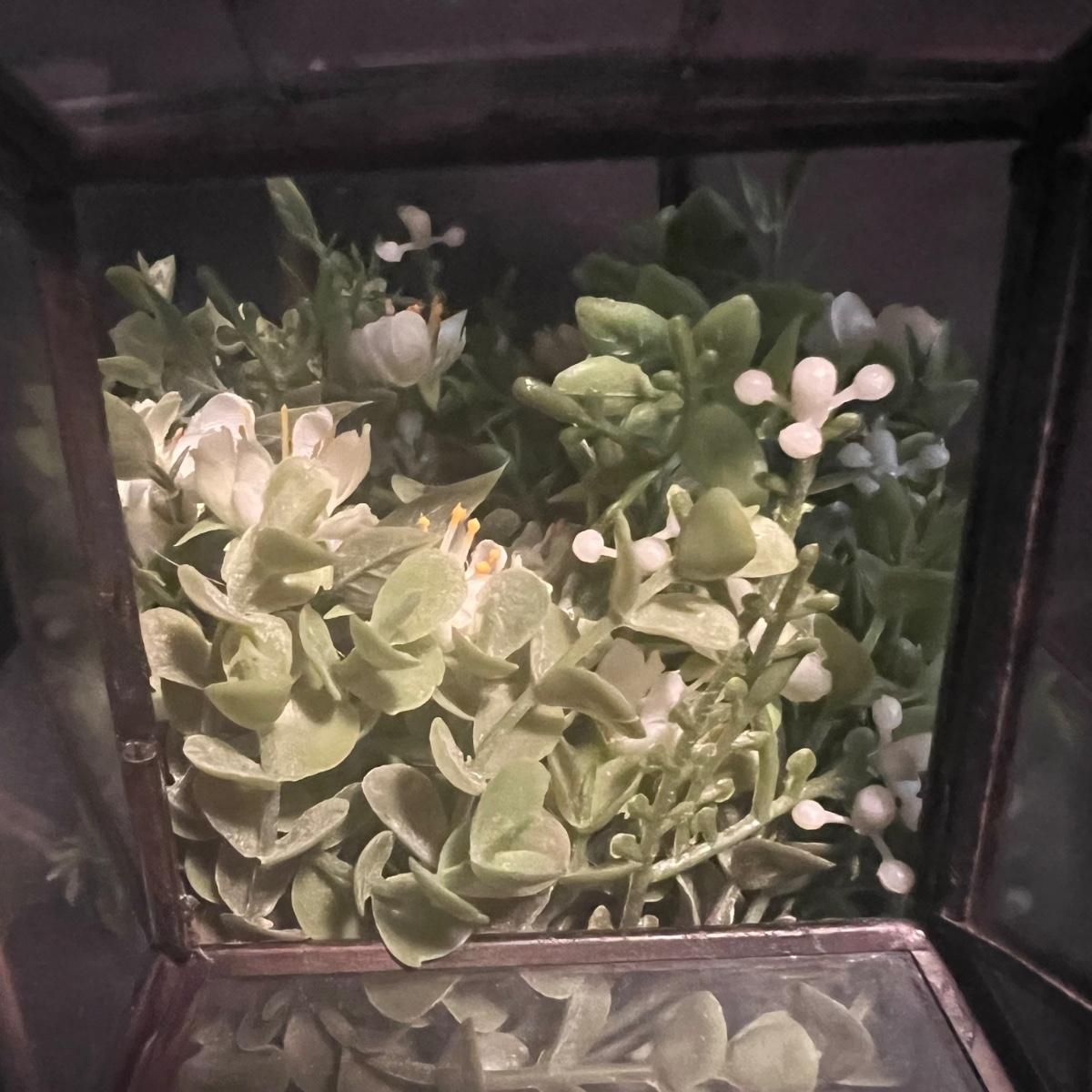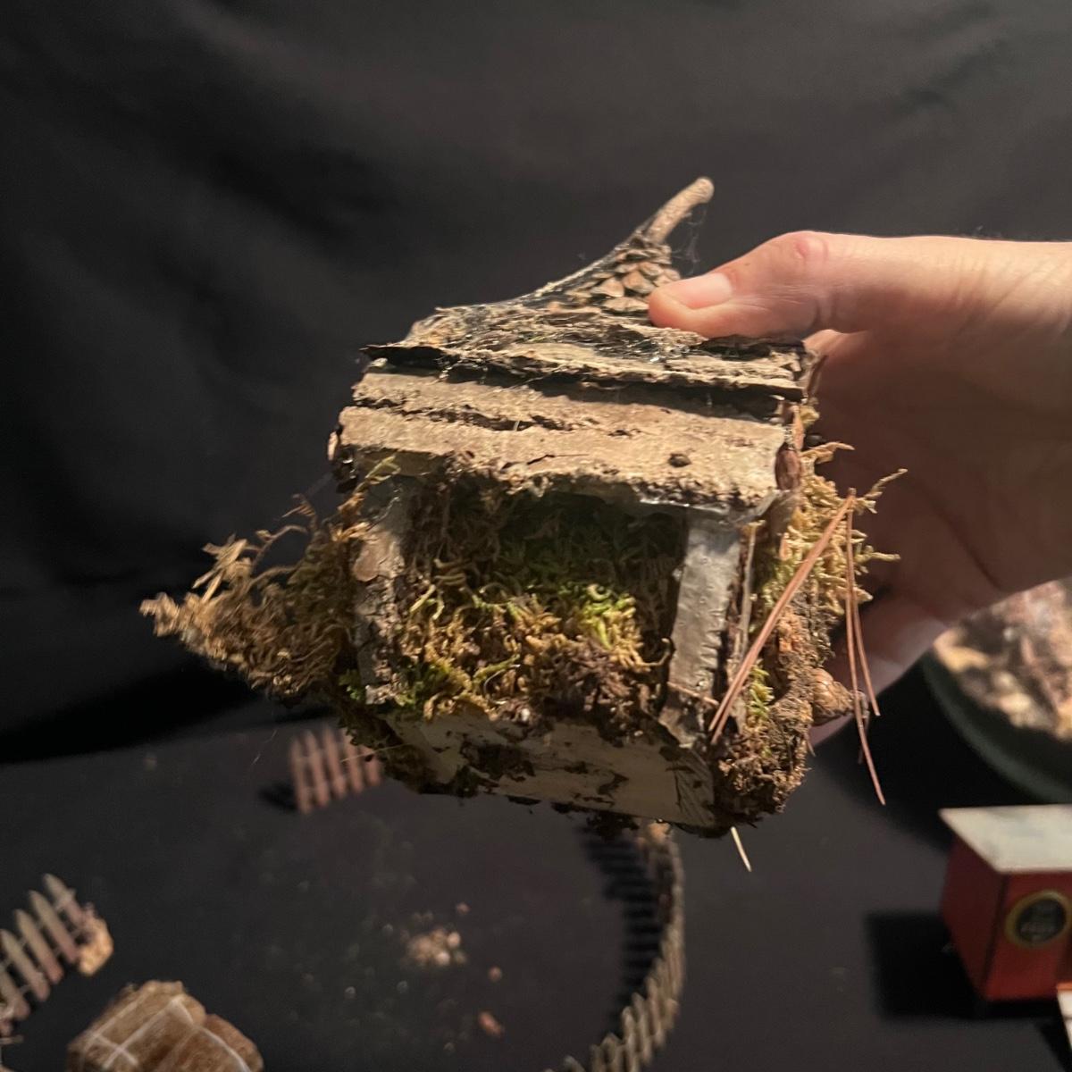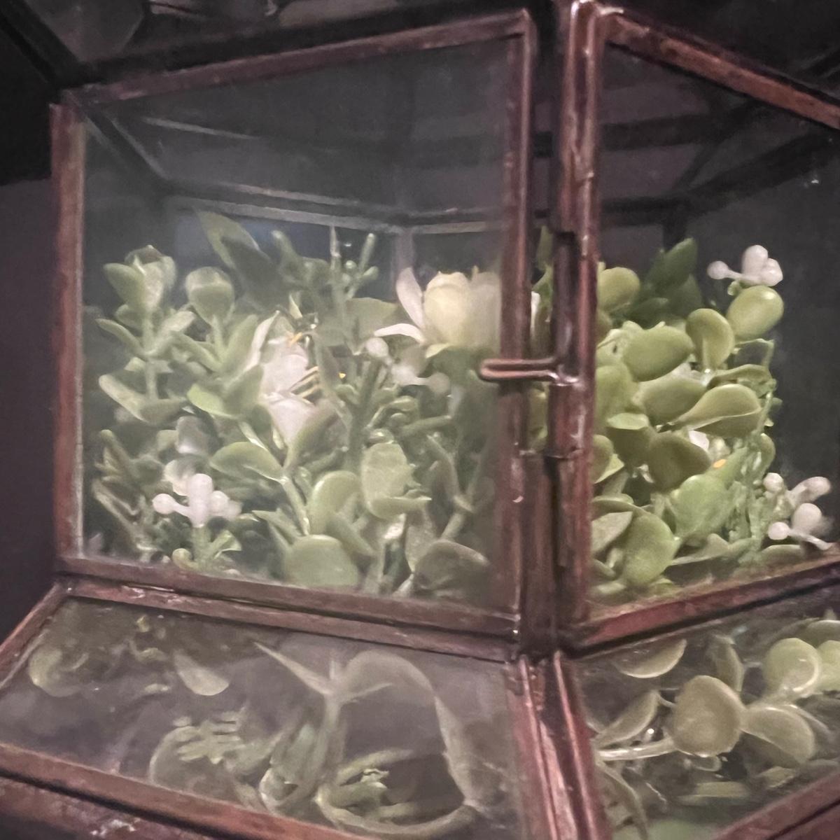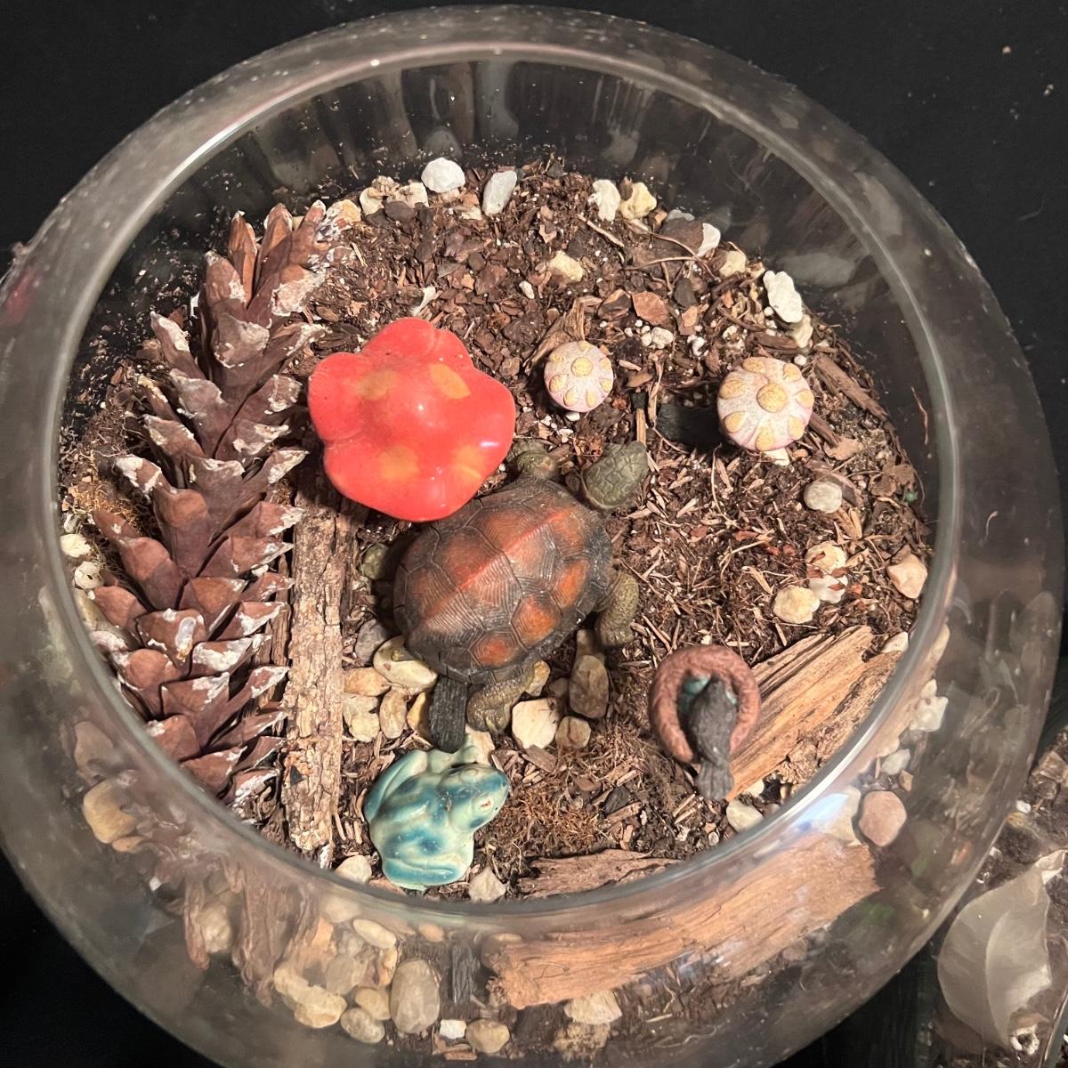 This adorable lot includes four glass terrariums. The tallest one which is the Moroccan style terrarium has faux plants in it; it measures measures 11”D x 12”H. Lots of miniature pieces for future projects such as fairy gardens. A mix of materials, mini patio table, bird cages, watering cans etc are metal. Lots of resin pieces as well and this lot even has straw bales.