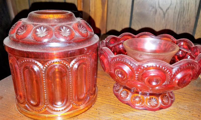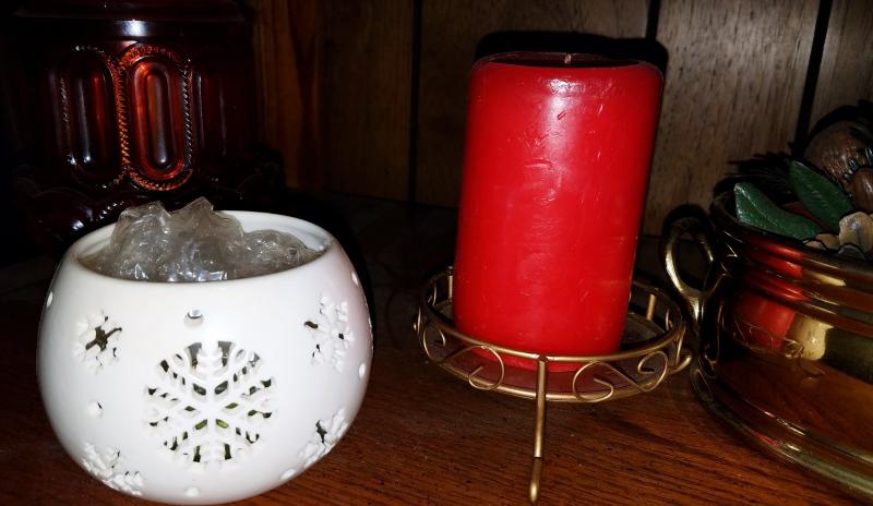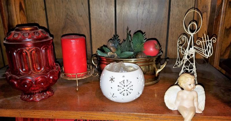 Red colored glass fairy lights resembles Fenton pieces no markings brass, snowflake candle holder other holiday items