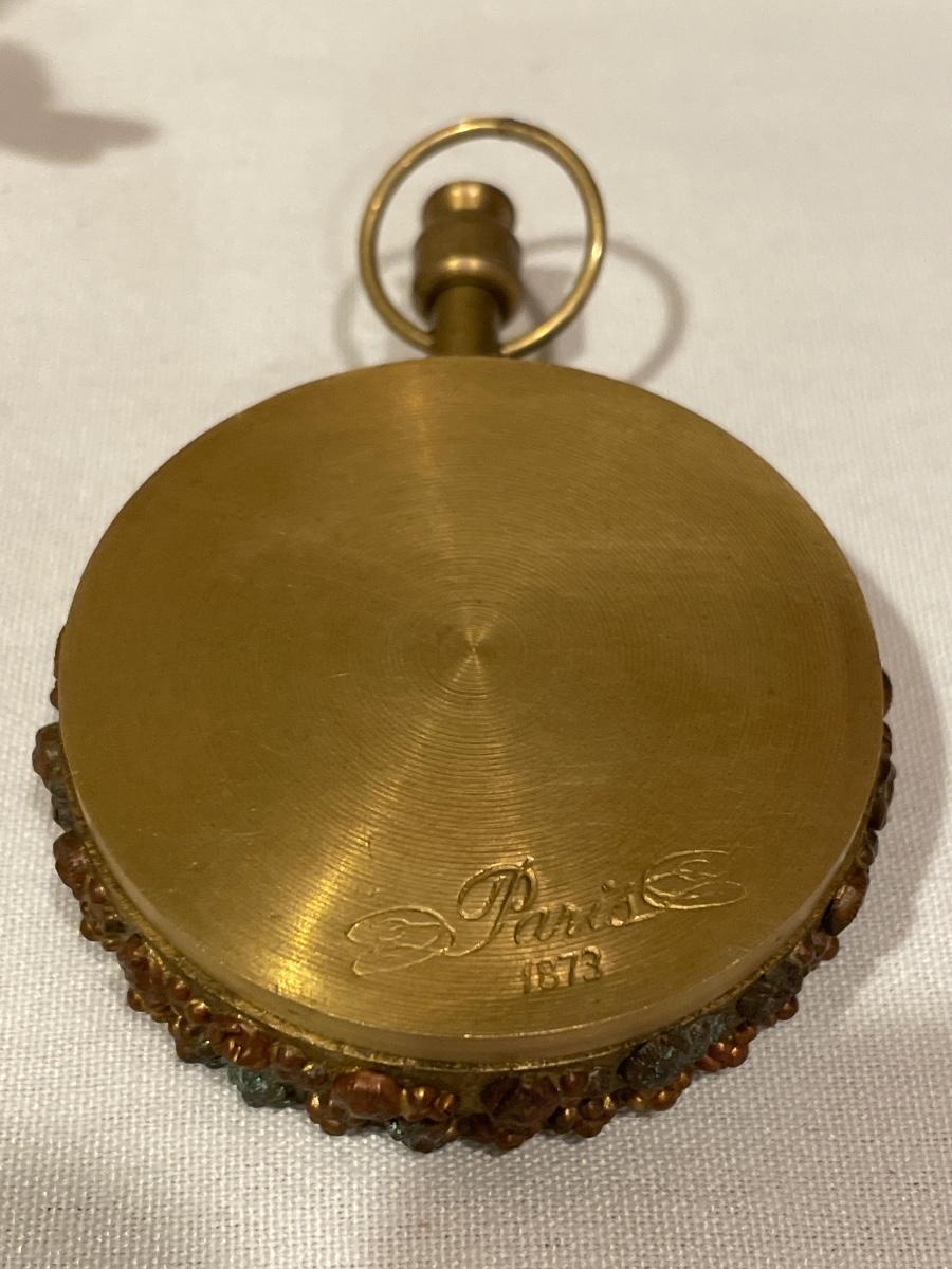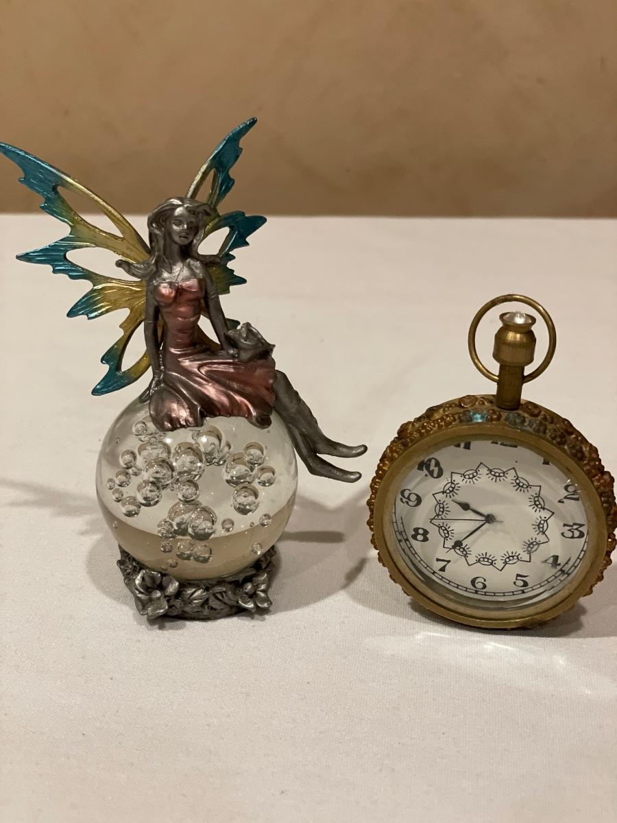 Fairy on glass ball and large pocket watch style clock