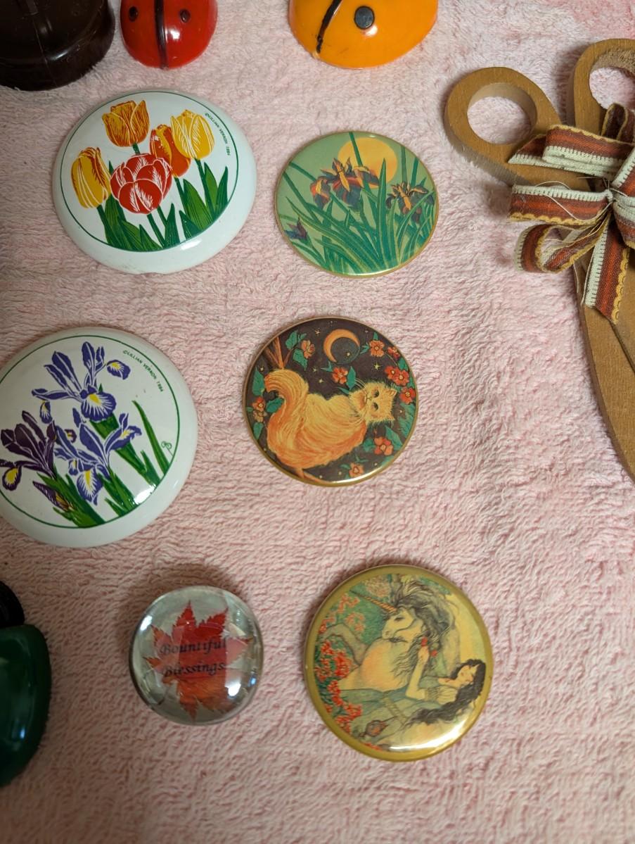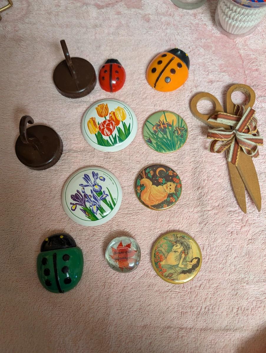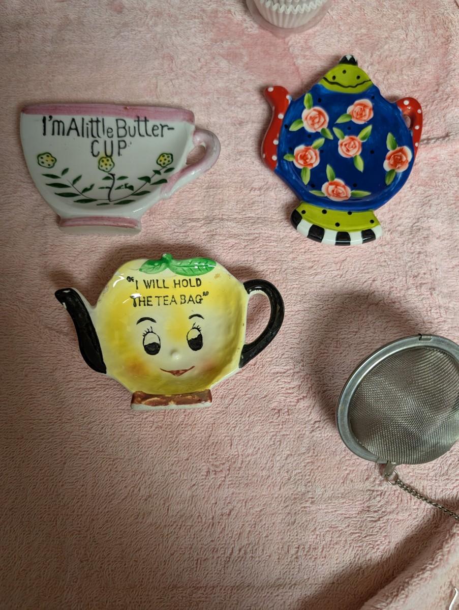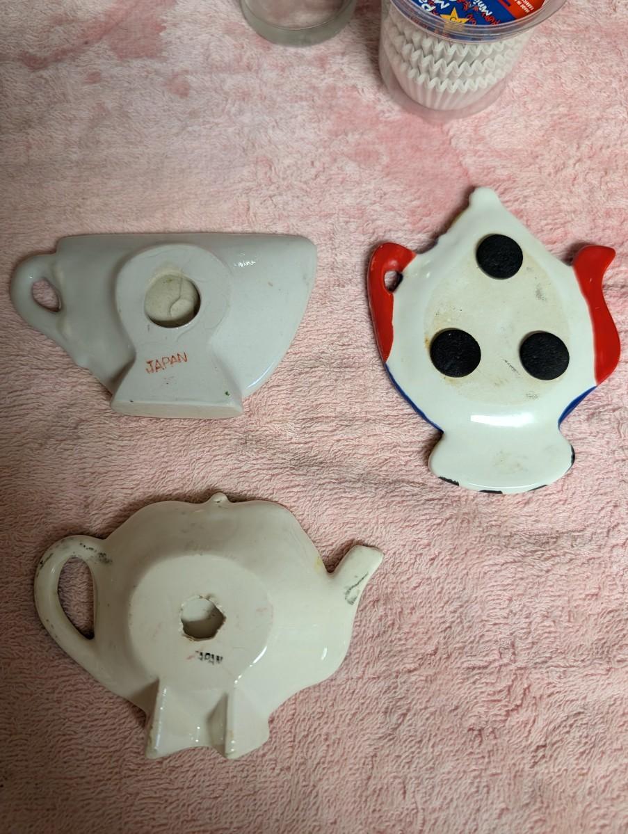 Lot of napkin holders, magnets, salt and pepper shakers, vintage spoon rest, handmade blue spoon rest, vintage tea bag holder, thermometer.