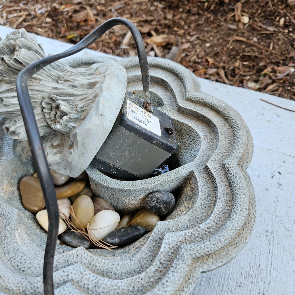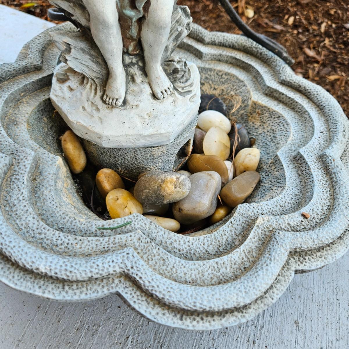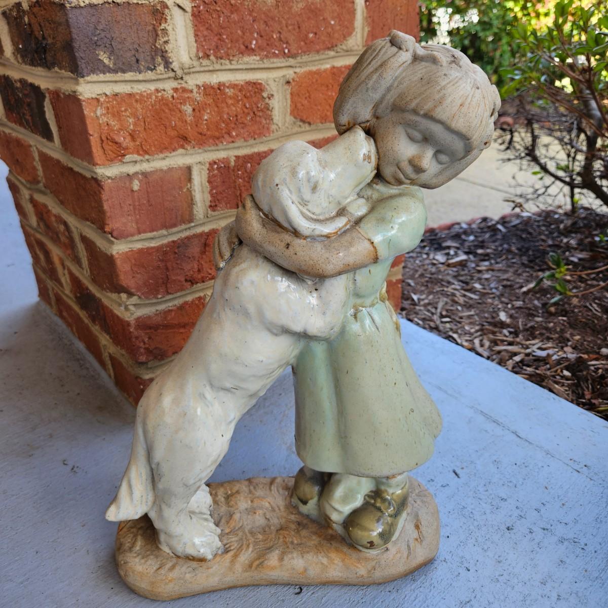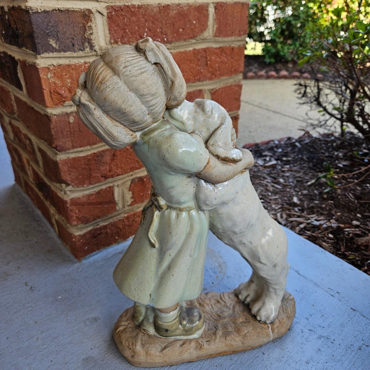 An assortment of approximately 10 outdoor art pieces and topiaries. A majority of the statues are resin cast. The girl and puppy is ceramic. The circle of primitive men appears to be cement and has some damage. The leaf appears to be copper and there is a ceramic plate. The classic fountain powered on when plugged in. The two topiaries measures approximately 9"D x 33"H. Local pickup only