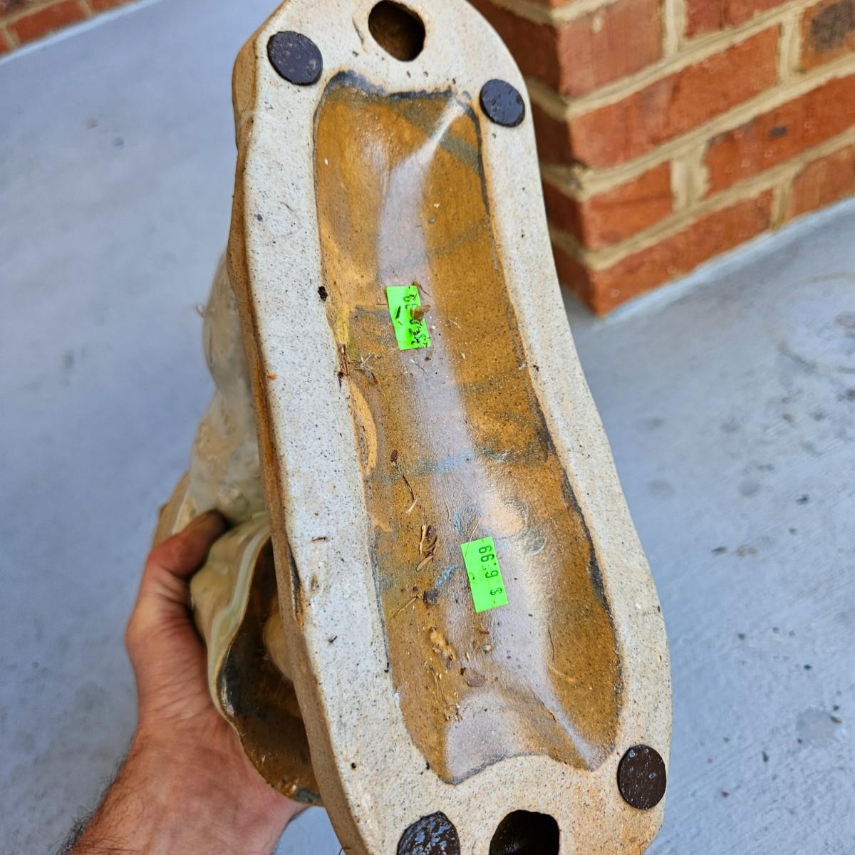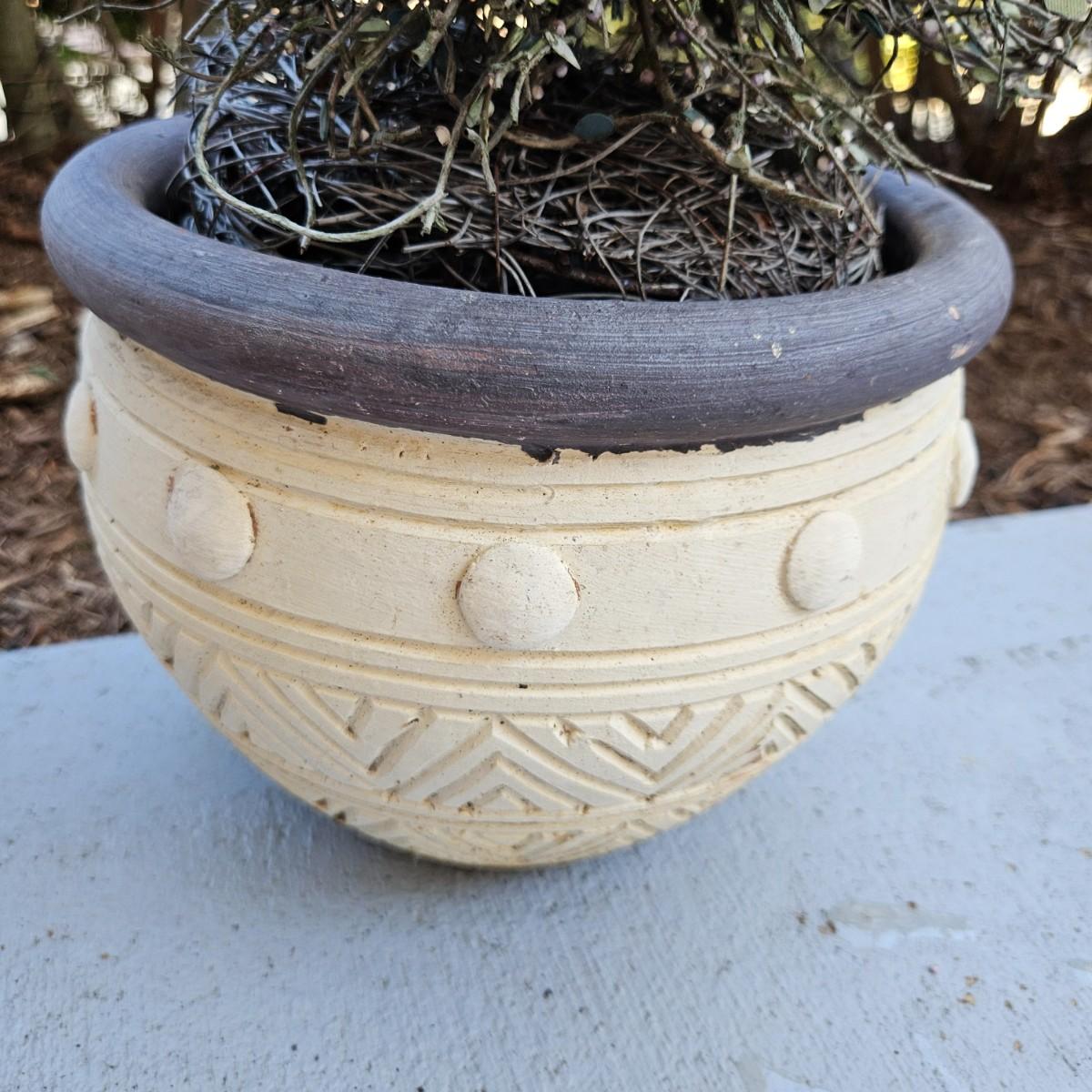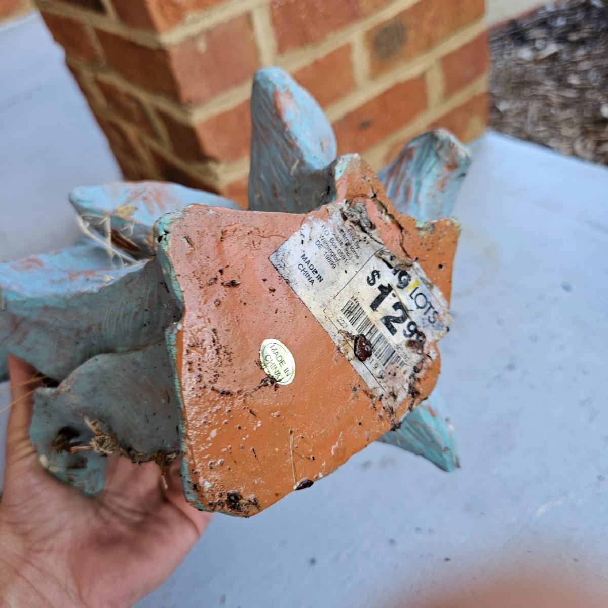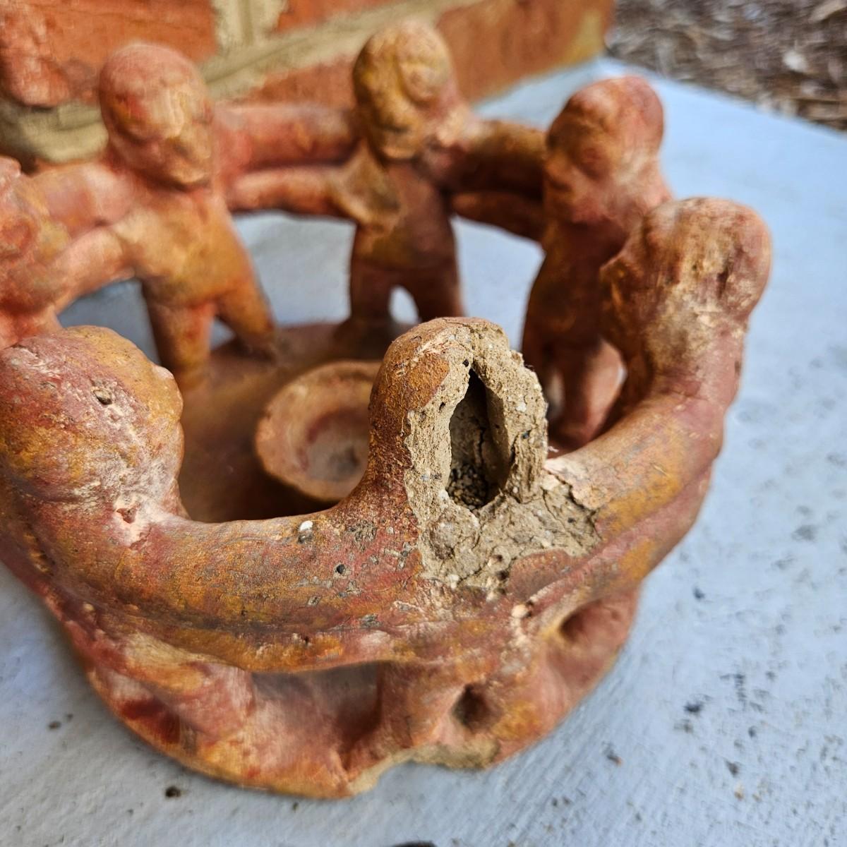An assortment of approximately 10 outdoor art pieces and topiaries. A majority of the statues are resin cast. The girl and puppy is ceramic. The circle of primitive men appears to be cement and has some damage. The leaf appears to be copper and there is a ceramic plate. The classic fountain powered on when plugged in. The two topiaries measures approximately 9"D x 33"H. Local pickup only