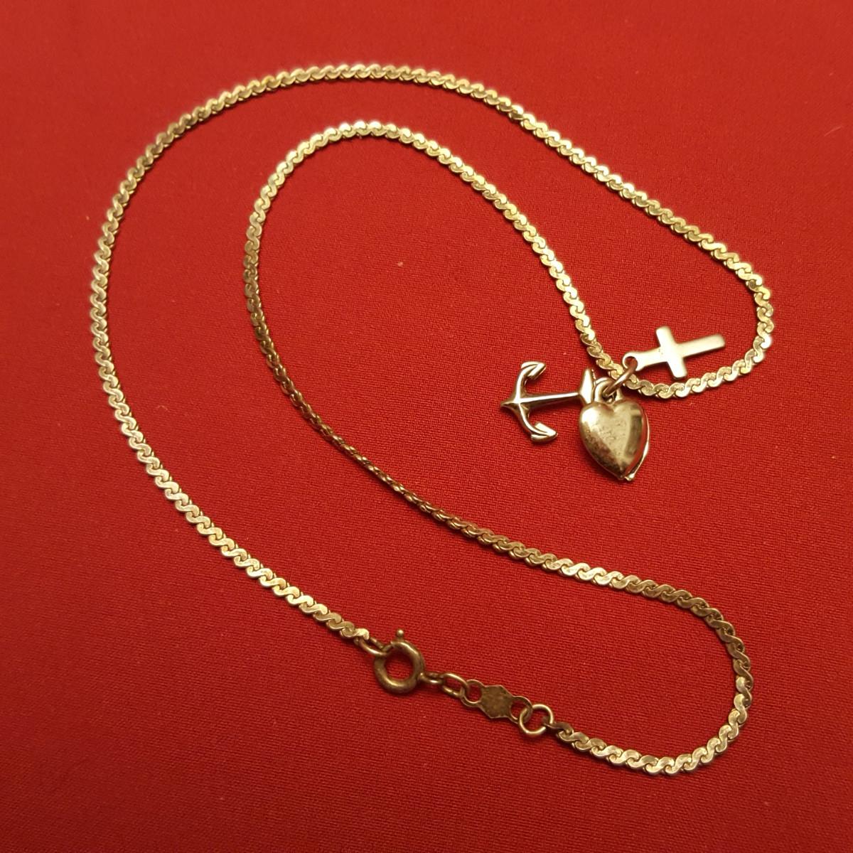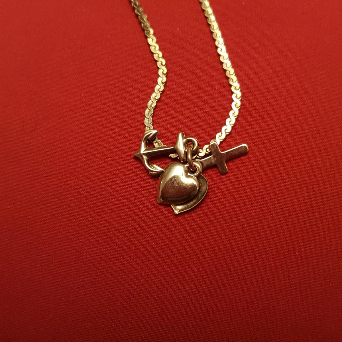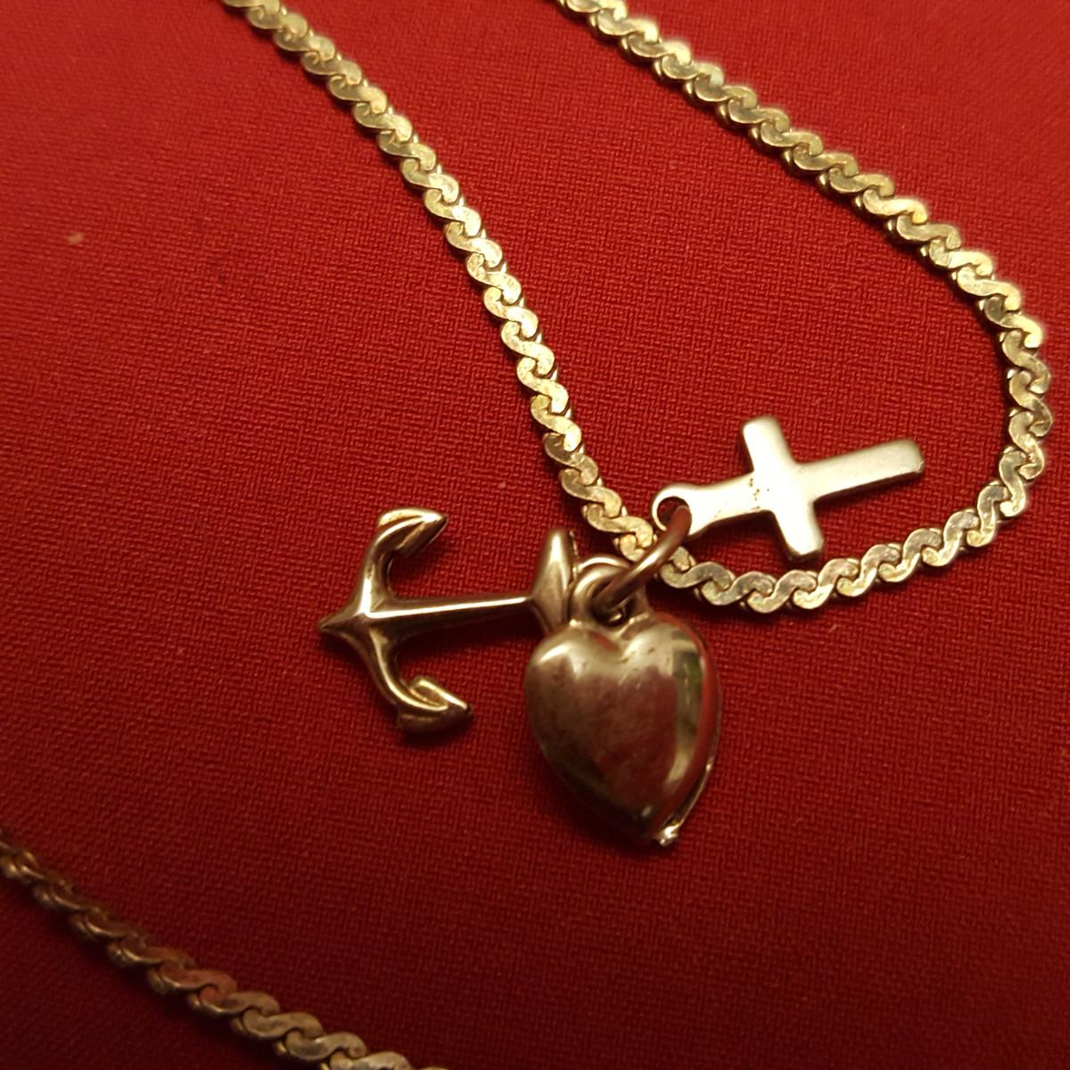 This auction lot is for a Faith, Hope & Charity Sterling Necklace. The necklace is marked Speidel Sterling. The cross of the pendant is marked sterling. The necklace measures about 14-inches long. Note that the heart is in two halves. The photo shows this item in gold color however they appear their actual silver in person. The necklace weighs about ..170ozt.