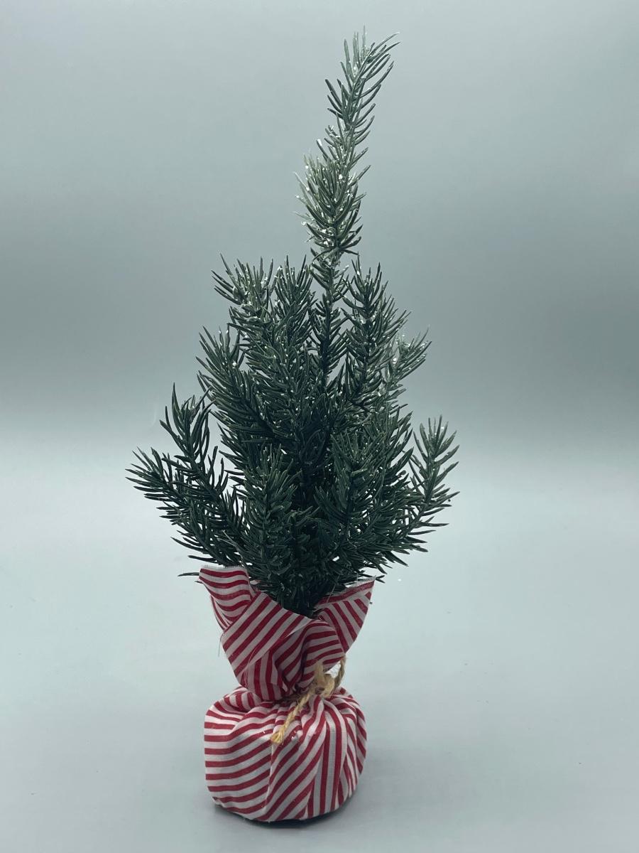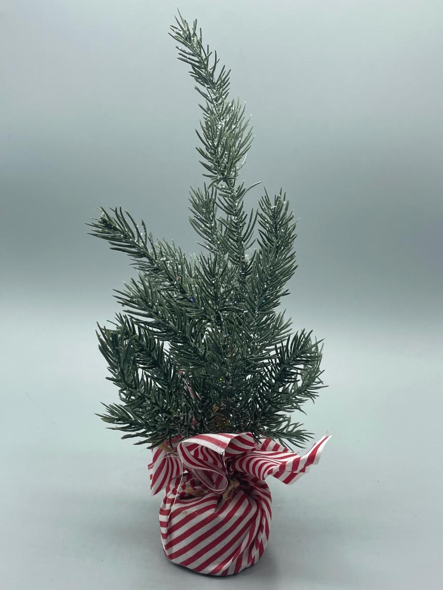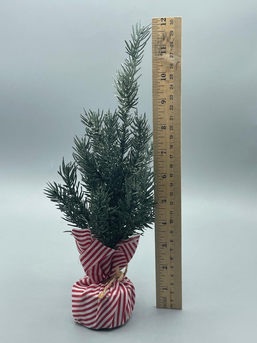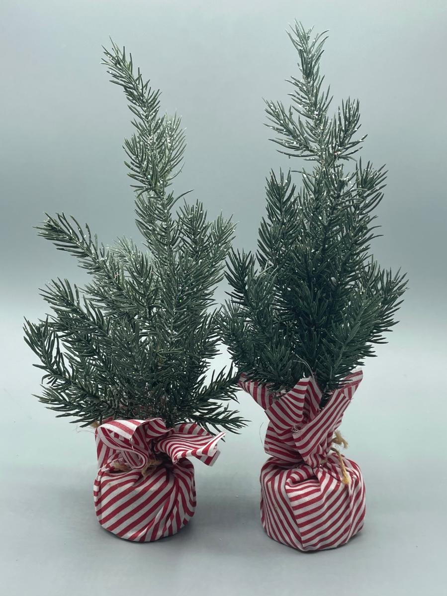 Both trees are in great condition and have no noticeable damages to them. They both has a candy cane fabric wrapped around them as decoration. Both fake trees are approximately 12” tall but they can be adjusted.