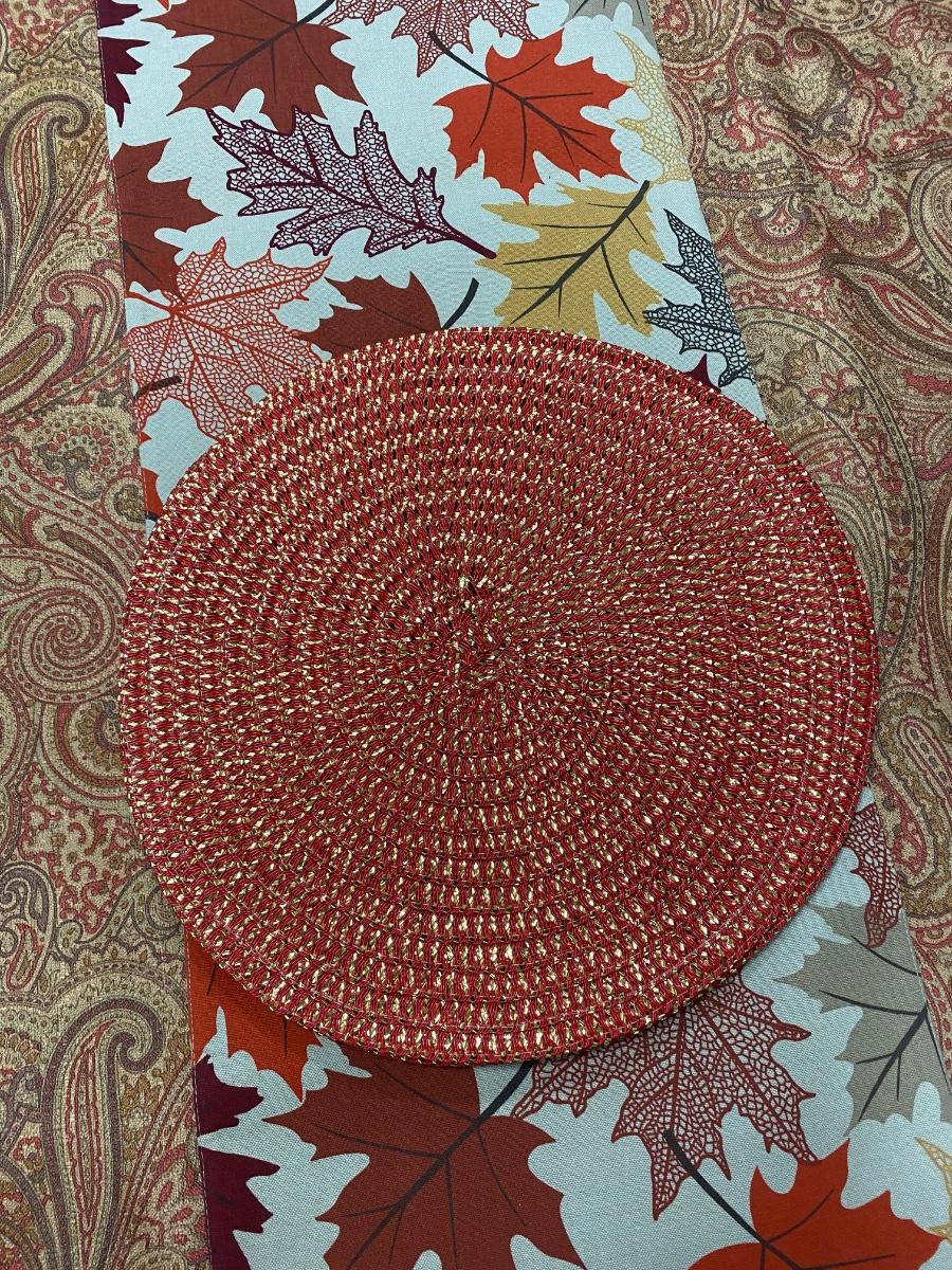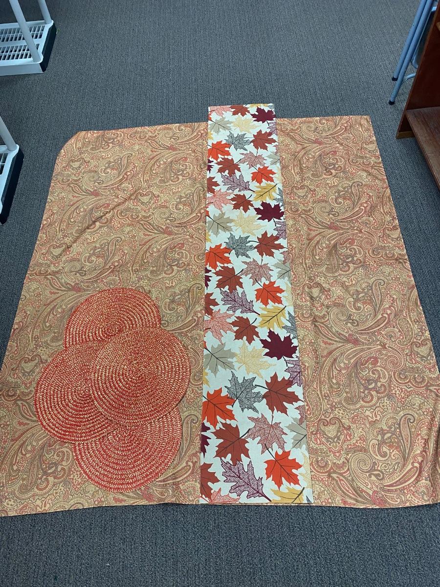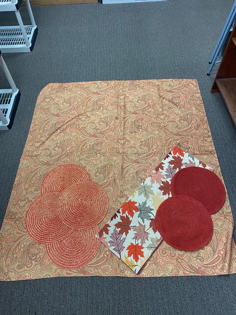 Seasonal Fall table linens. Orange/red paisley tablecloth about 6' size, does have a couple light spots that blend with pattern a little. Multicolor leaf patterned table runner is about 6' length. 6 round straw placemats, 2 solid, 4 have gold foil woven into them.