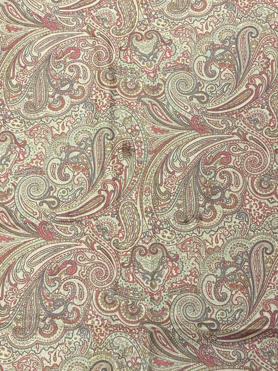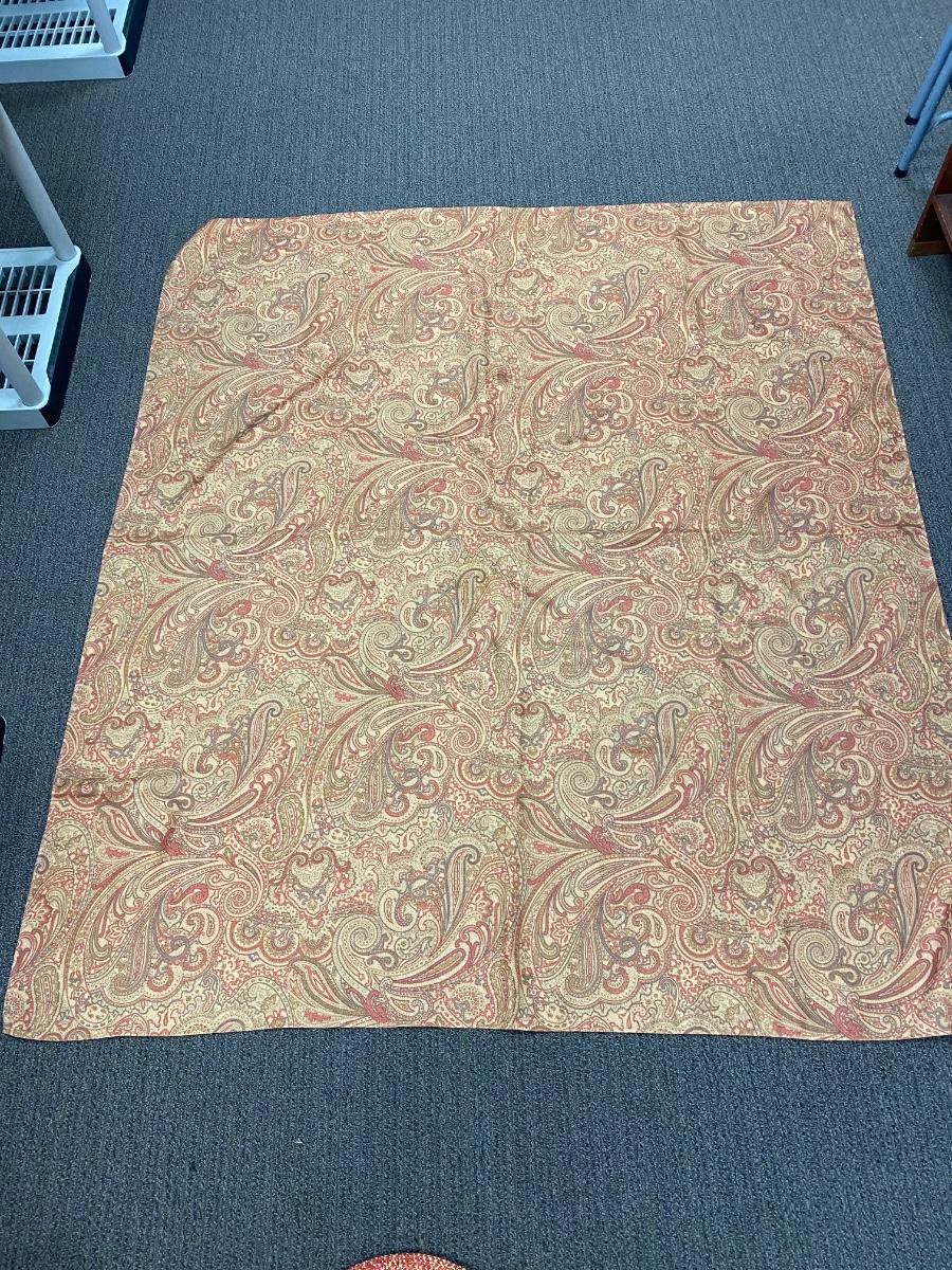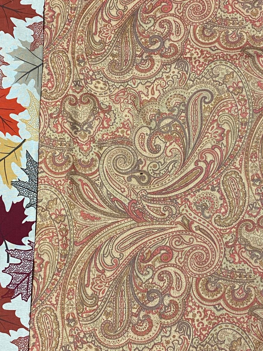 Seasonal Fall table linens. Orange/red paisley tablecloth about 6' size, does have a couple light spots that blend with pattern a little. Multicolor leaf patterned table runner is about 6' length. 6 round straw placemats, 2 solid, 4 have gold foil woven into them.