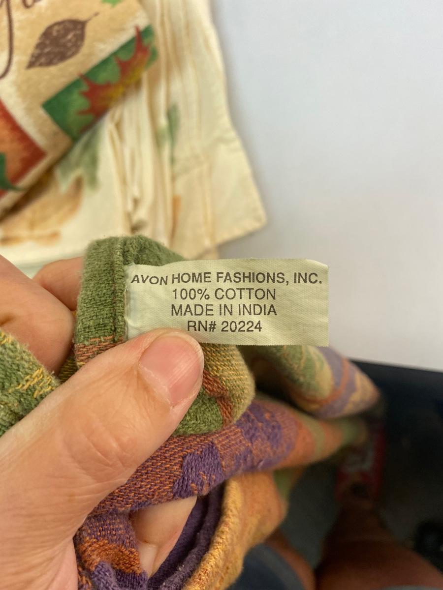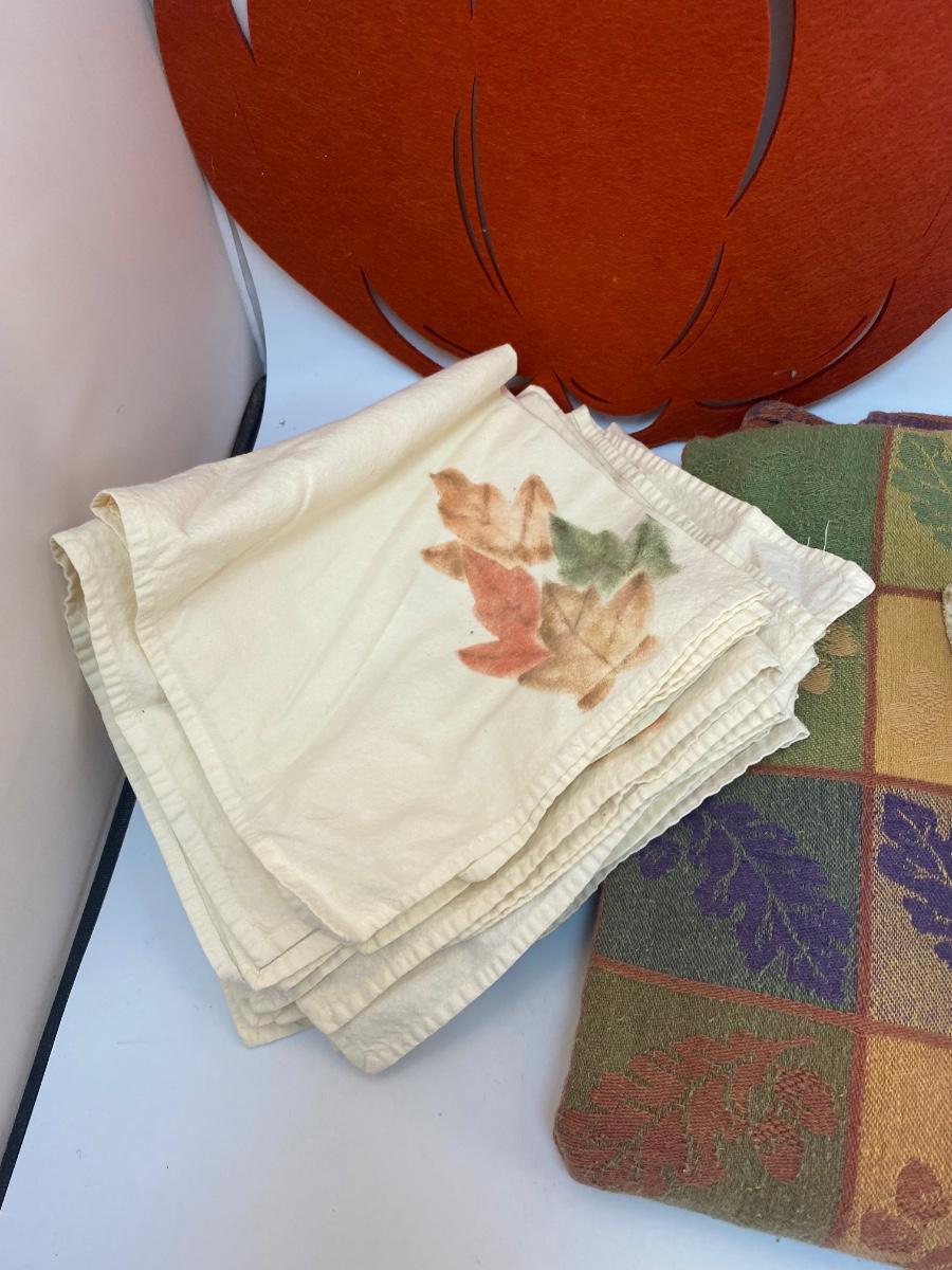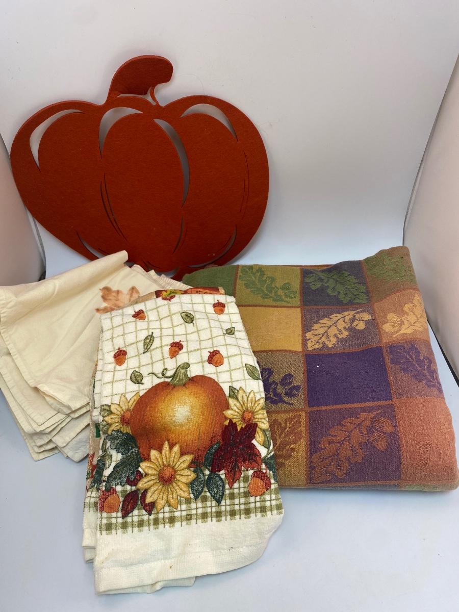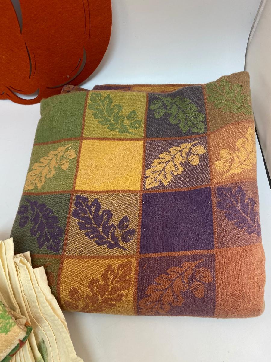 Fall Autumn Themed Table Linens Tablecloth Hand Towels Napkins. Everything in good used condition. Tablecloth is about 4.5'x9' size from AVON. Napkins have a leaf pattern on them, look homemade.