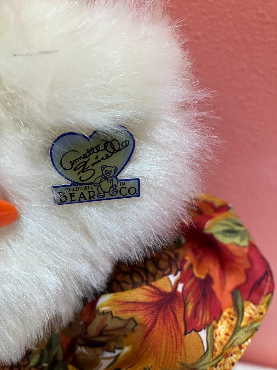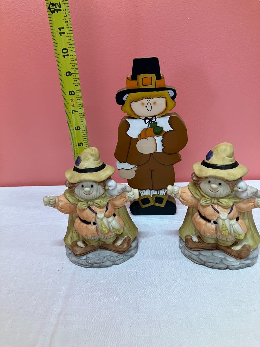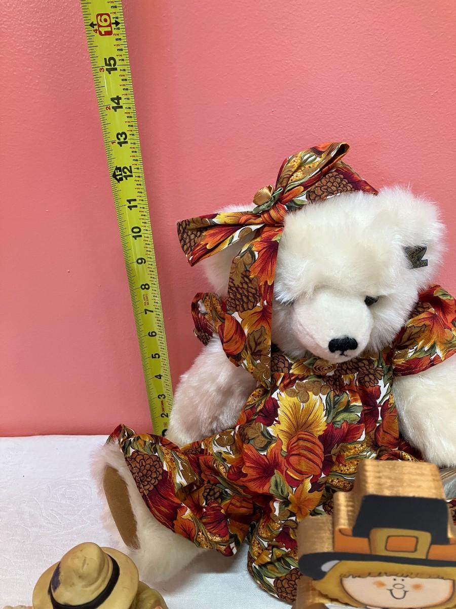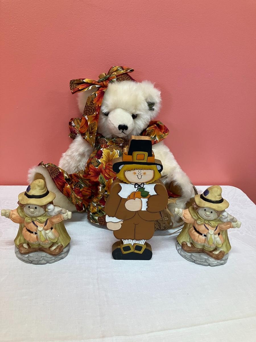 Grouping of fall decor items: 1 large plush bear, 2 ceramic scarecrow votive holders, 1 wooden pilgrim decor