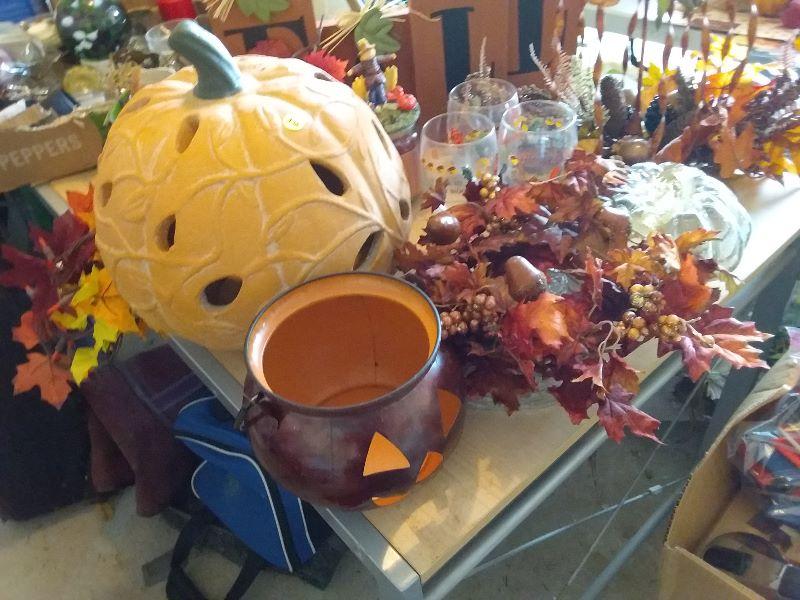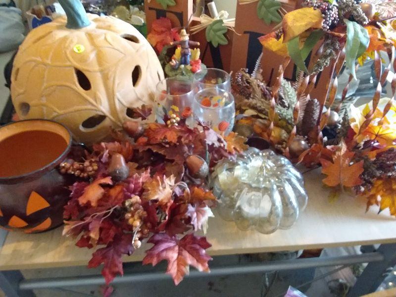 Large pumpkin, metal pumpkin lantern, glass pumpkin, fall sign, candle, glasses, fall leaves and 'metal pumpkin.