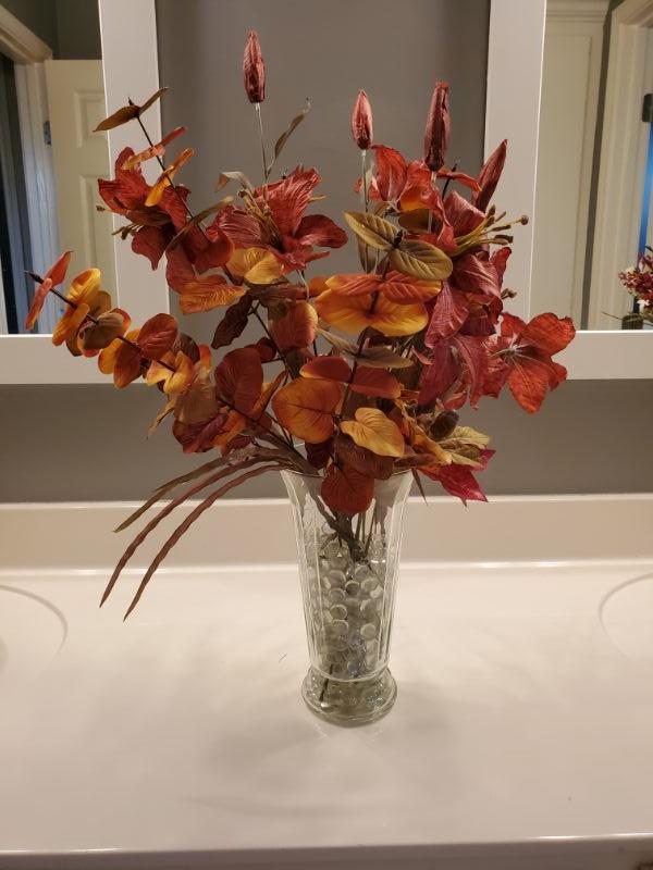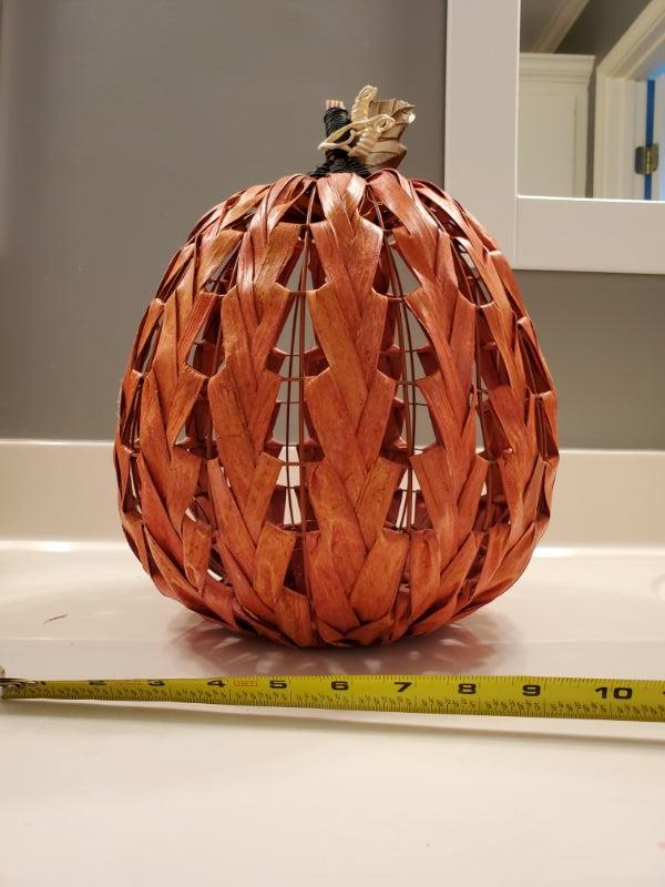 Unusual braided pumpkin decoration along with a fall arrangement.