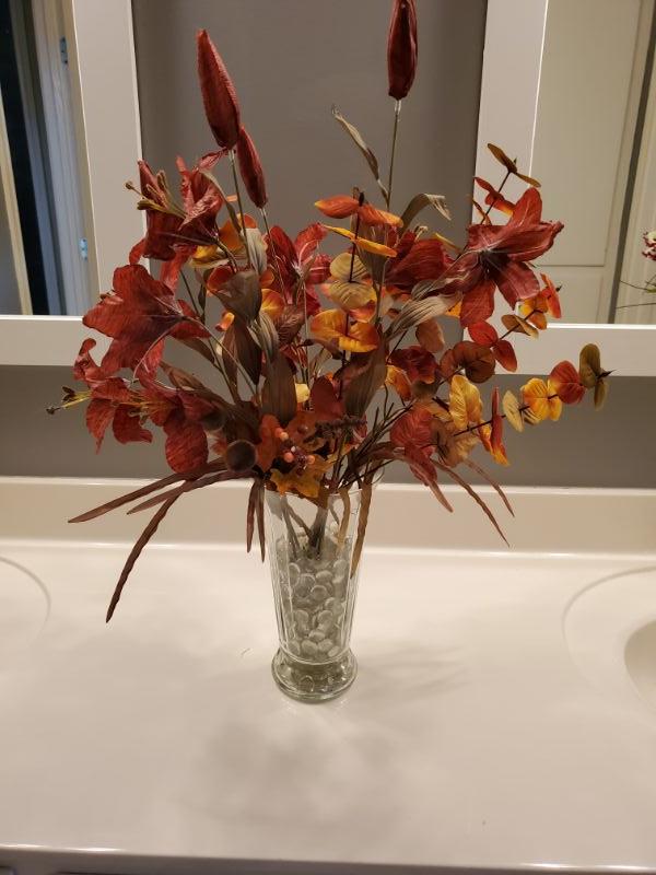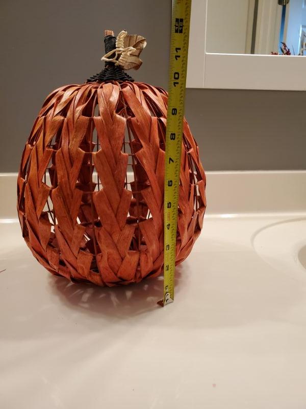 Unusual braided pumpkin decoration along with a fall arrangement.