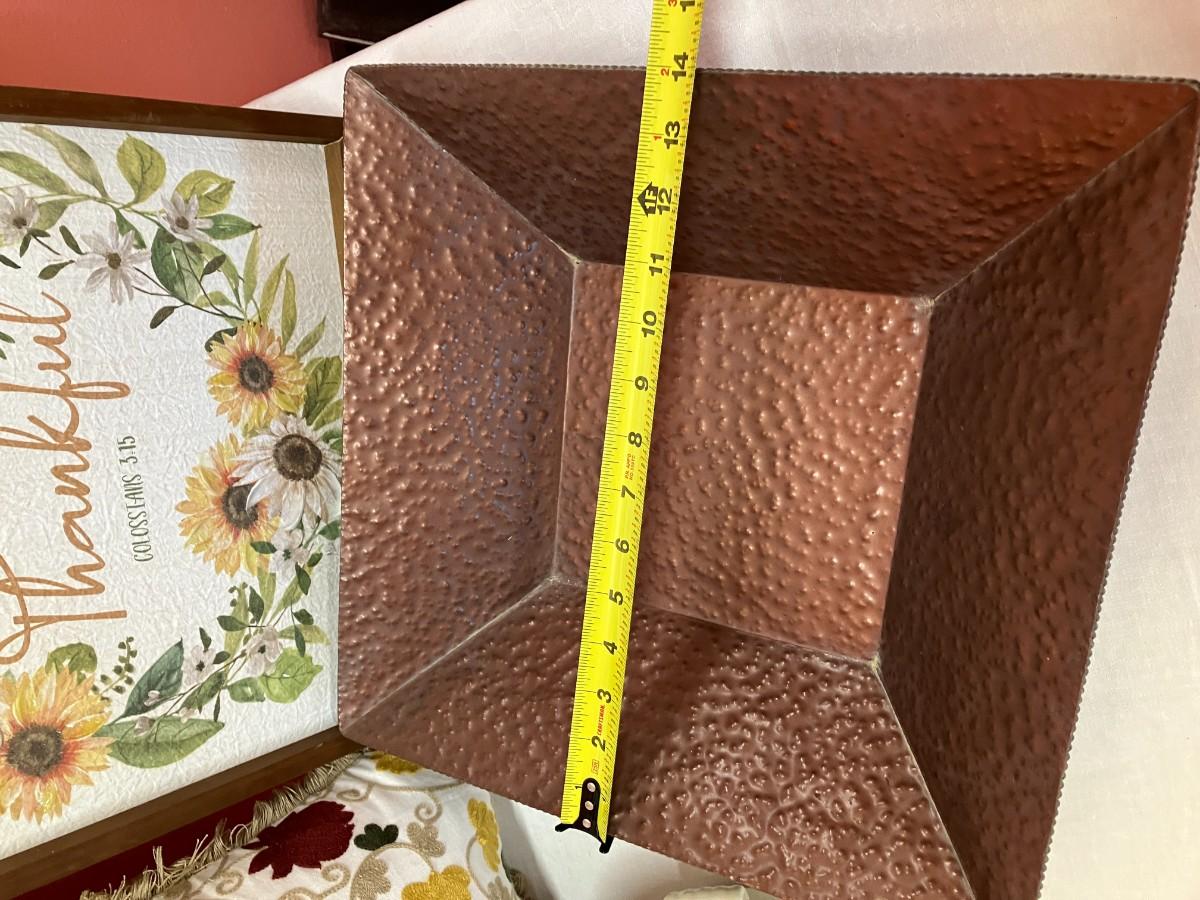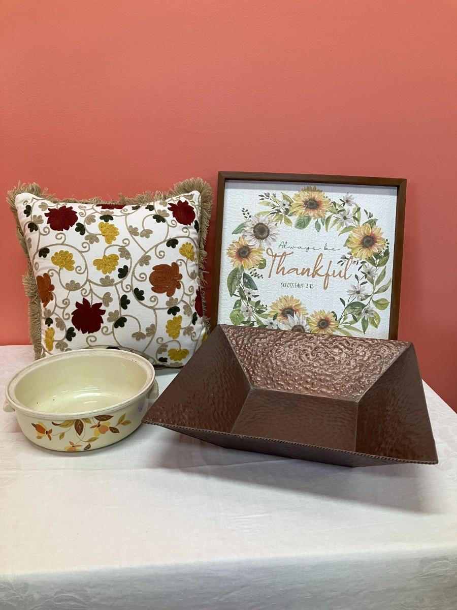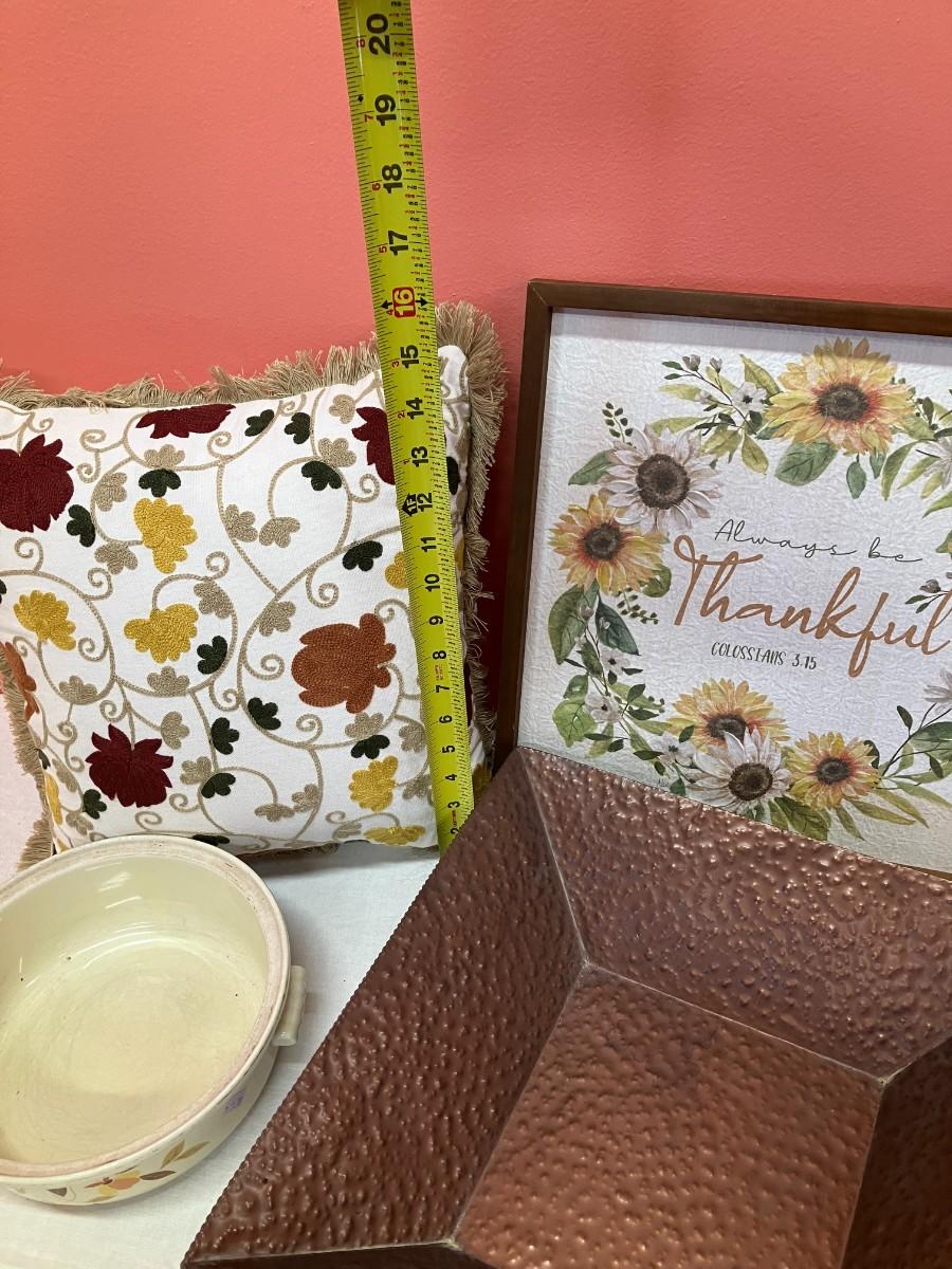 Lot of fall decor items: 1 pillow, 1 wooden sign, 1 ceramic serving bowl, 1 large copper decor bowl