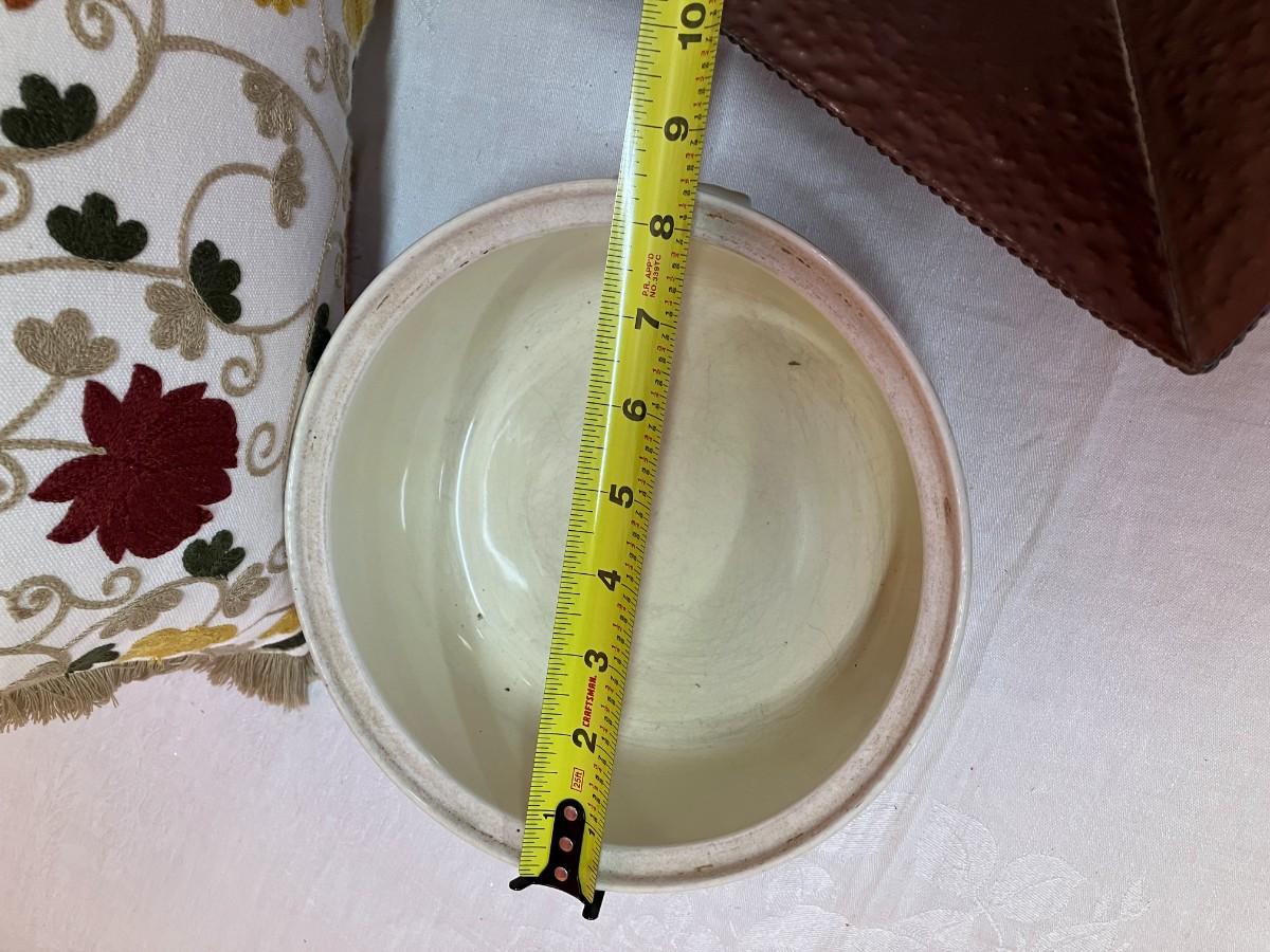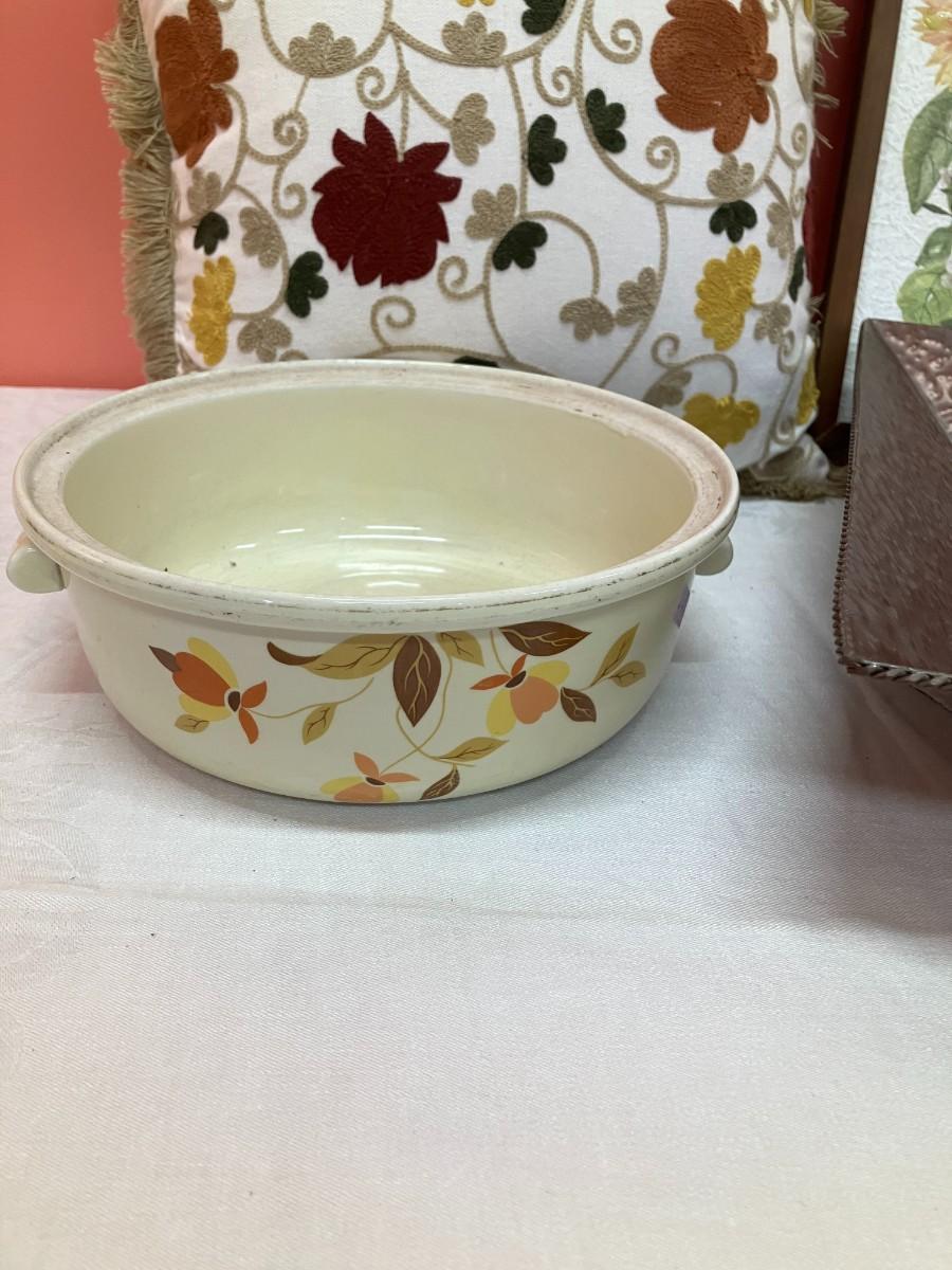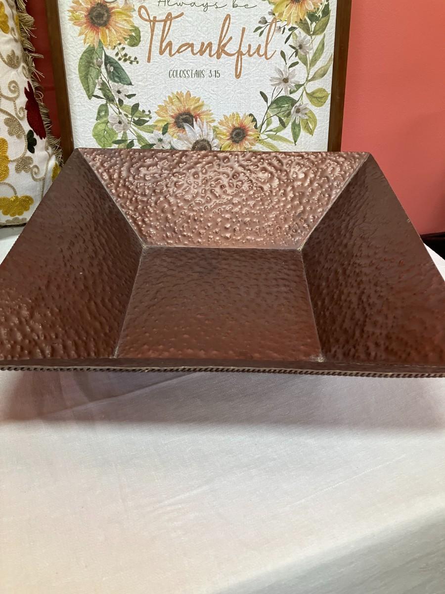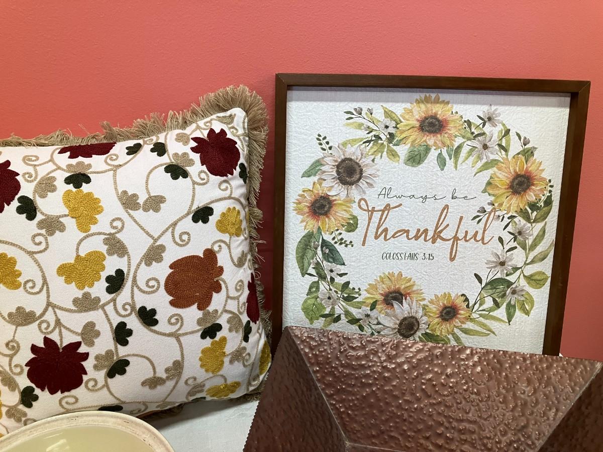 Lot of fall decor items: 1 pillow, 1 wooden sign, 1 ceramic serving bowl, 1 large copper decor bowl