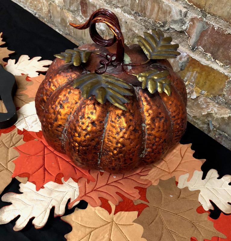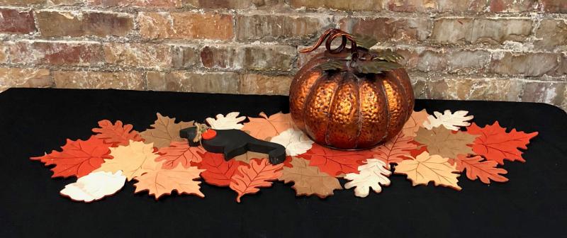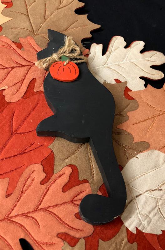 Excellent condition on this Halloween/Fall decor which includes a fall leaf 36" table runner...A Cooper figurine pumppkin 7.5 x 9.5" and .a wooden black cat wall hanging...