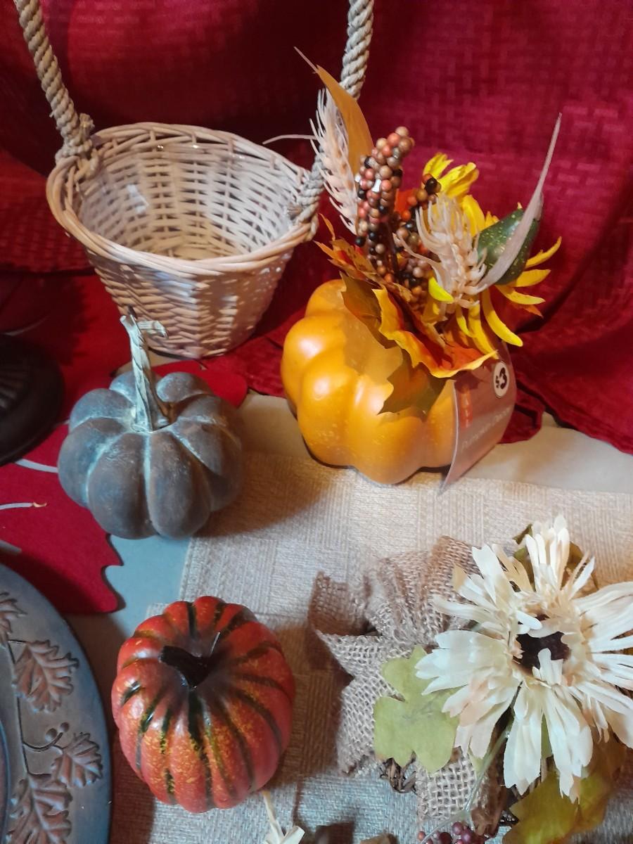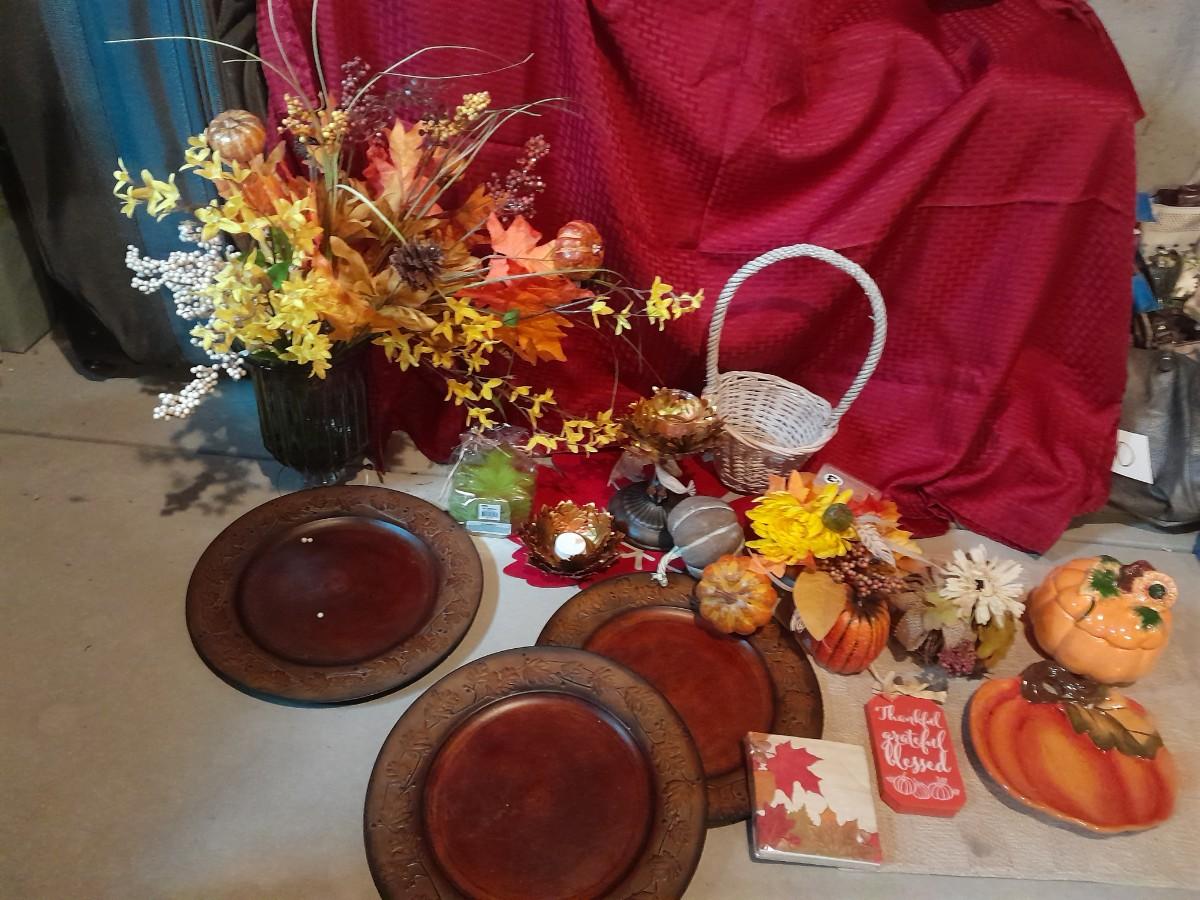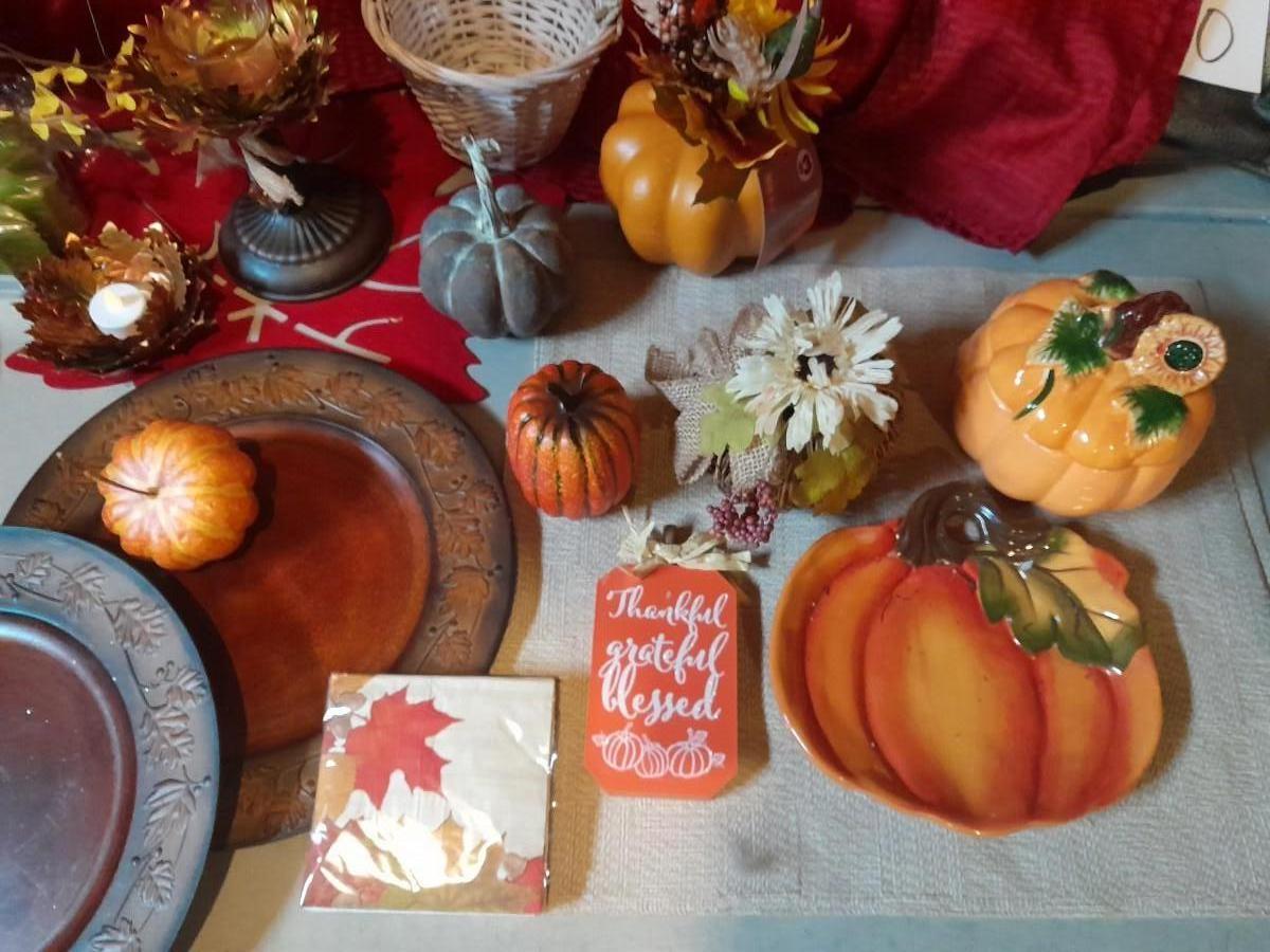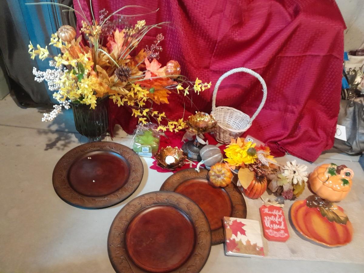 FALL DECORATIONS FOR THANKSGIVING AND HALLOWEEN FAUX FLOWERS, LARGE PLATTERS WITH LEAF TRIM, PUMPKINS, WALL HANGING, TABLECLOTH, AND MORE