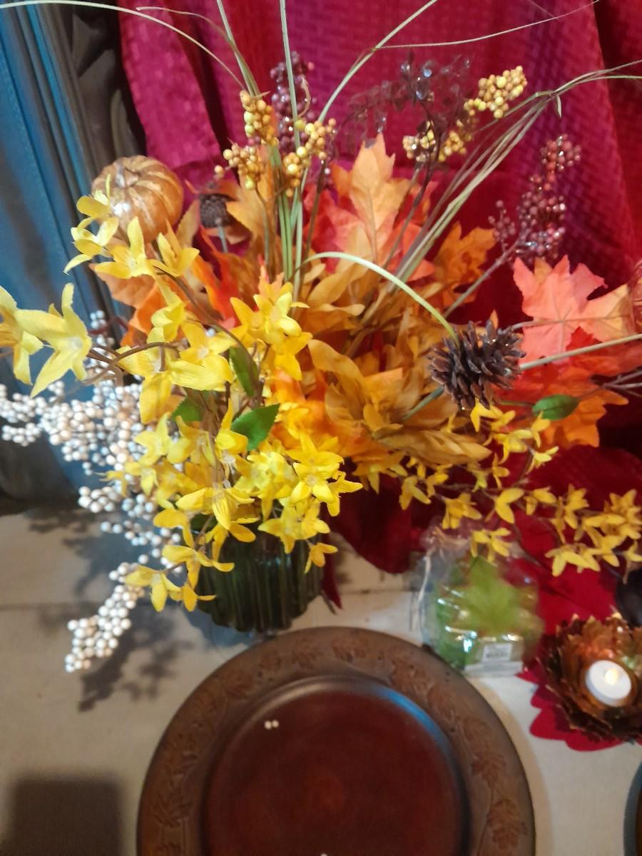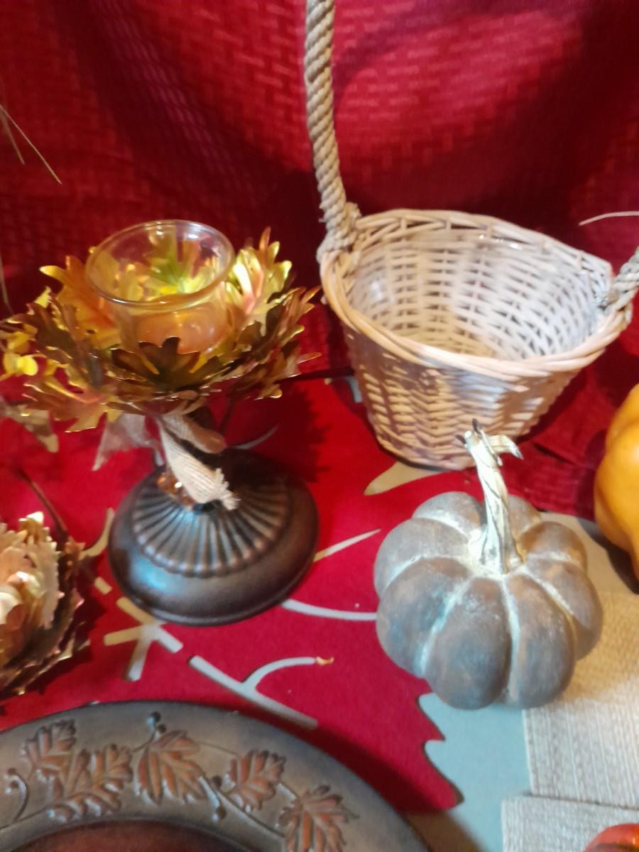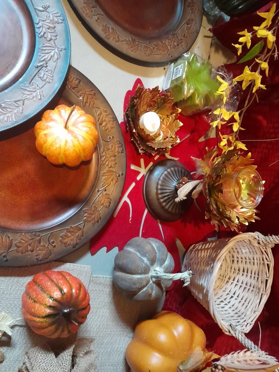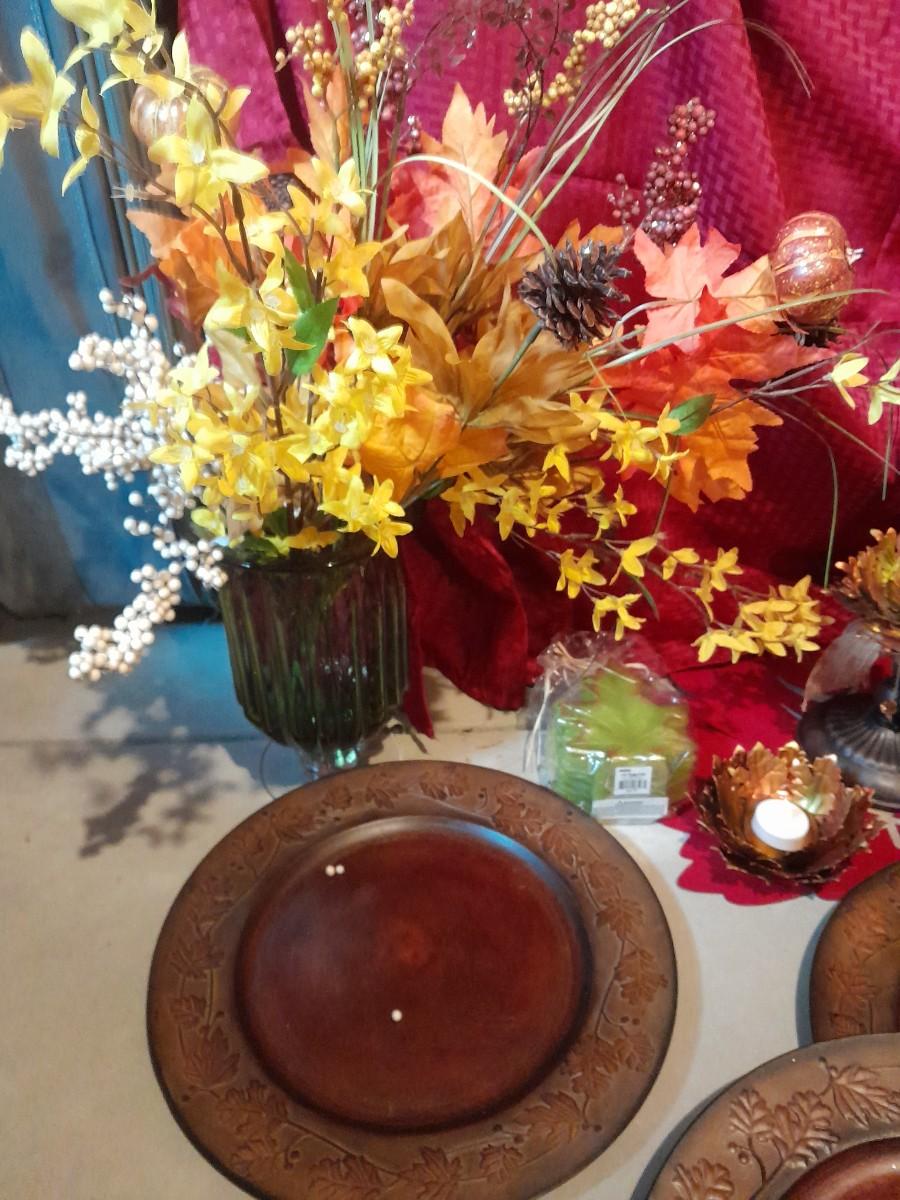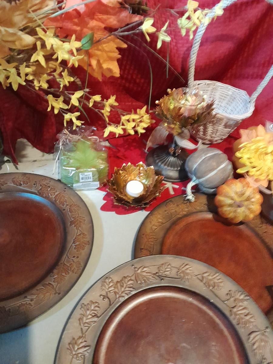 FALL DECORATIONS FOR THANKSGIVING AND HALLOWEEN FAUX FLOWERS, LARGE PLATTERS WITH LEAF TRIM, PUMPKINS, WALL HANGING, TABLECLOTH, AND MORE