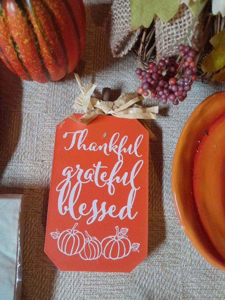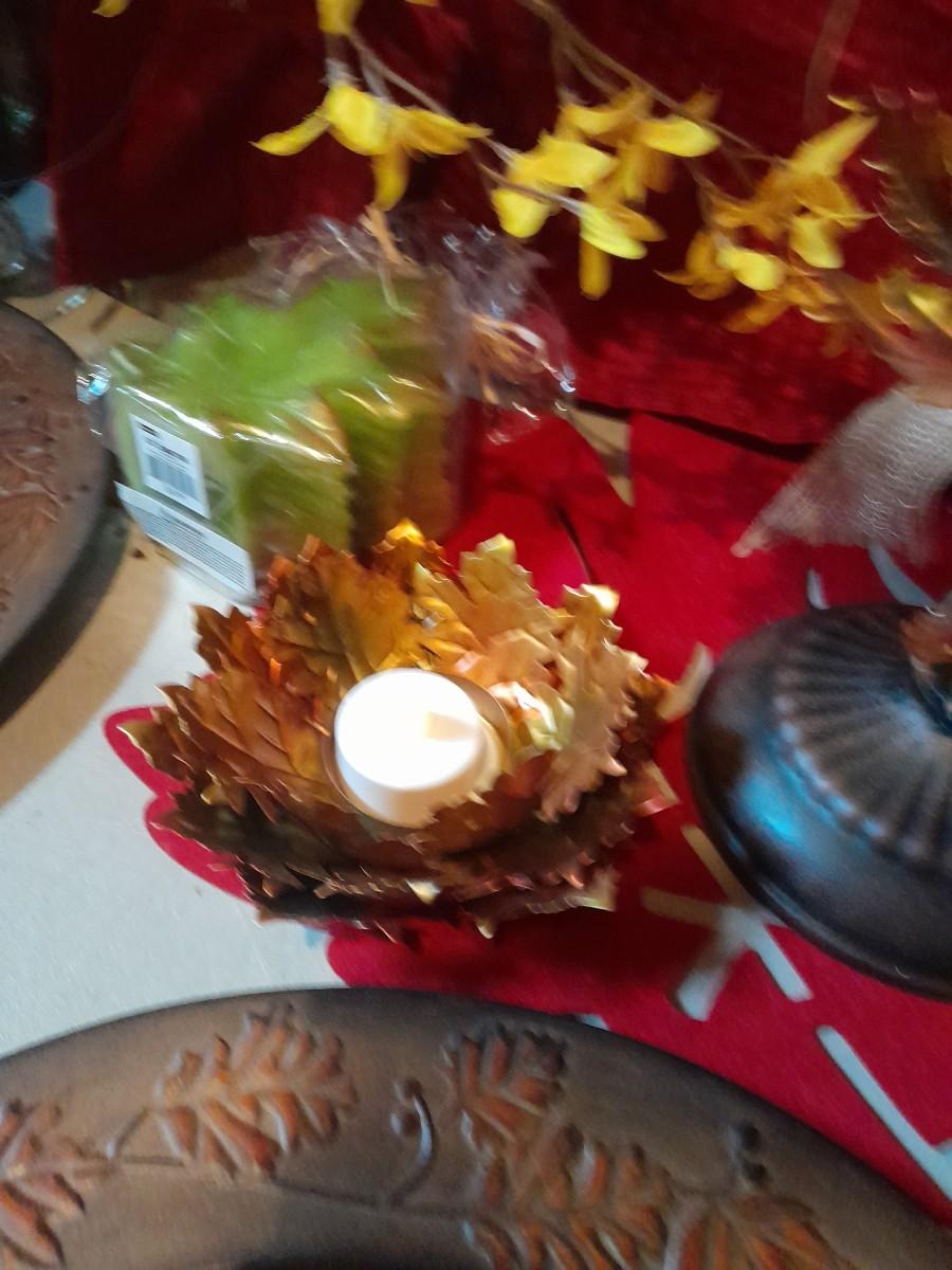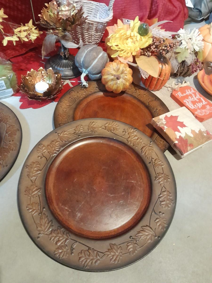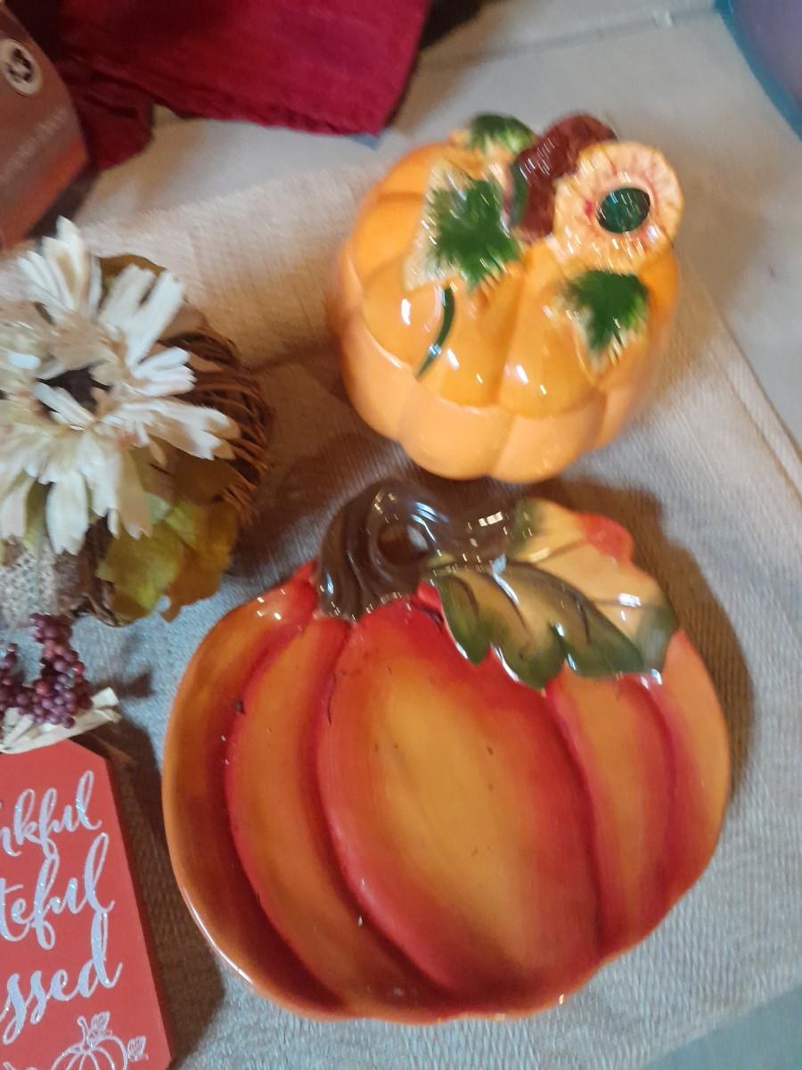 FALL DECORATIONS FOR THANKSGIVING AND HALLOWEEN FAUX FLOWERS, LARGE PLATTERS WITH LEAF TRIM, PUMPKINS, WALL HANGING, TABLECLOTH, AND MORE