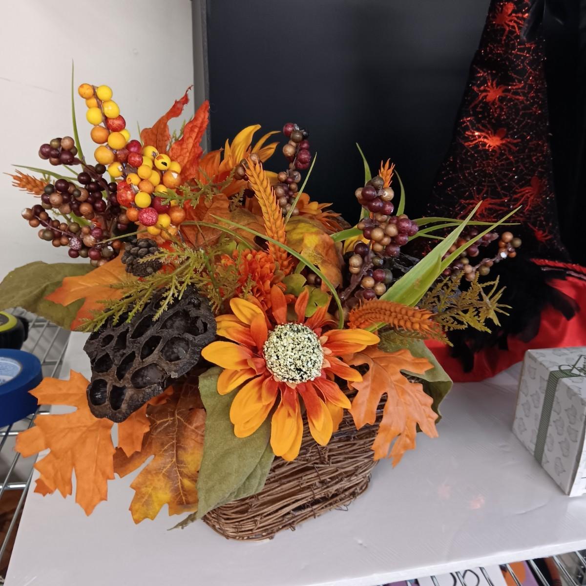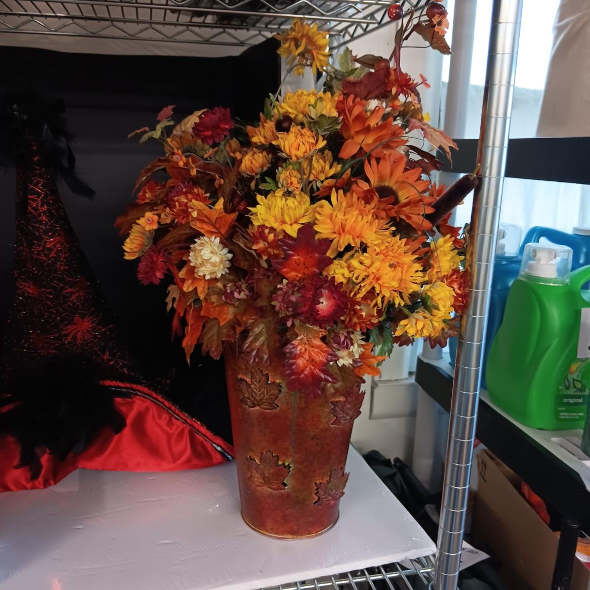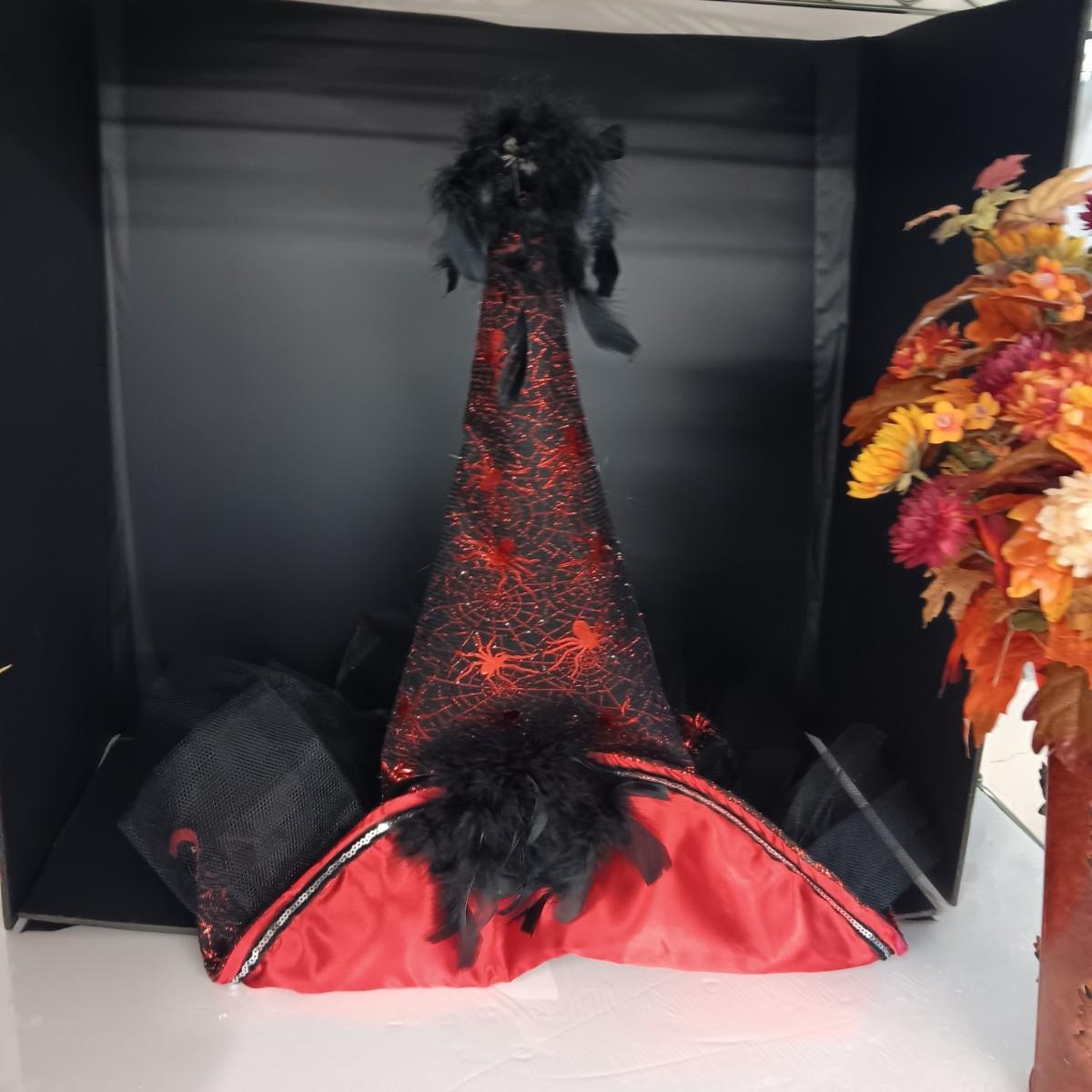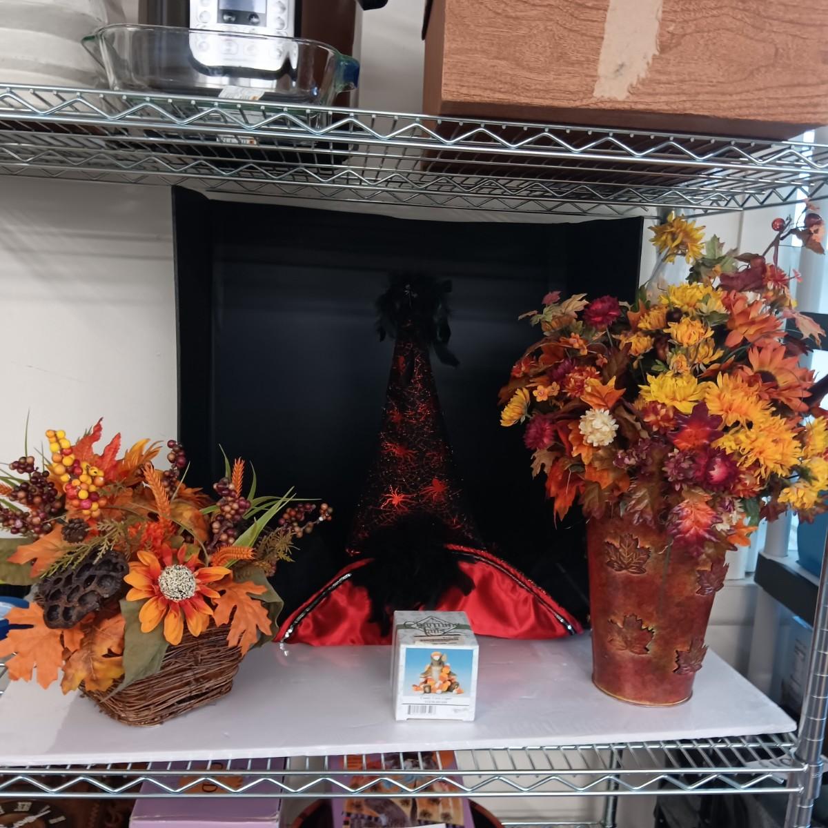 FALL FAUX FLOWERS, A FANCY WITCH HAT AND A CHARMING TAILS FIGURE