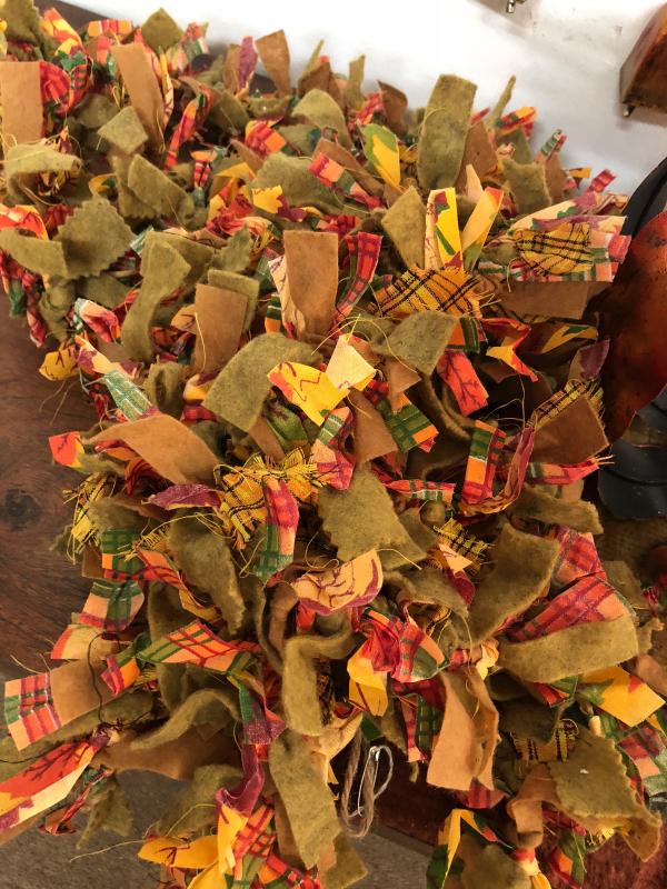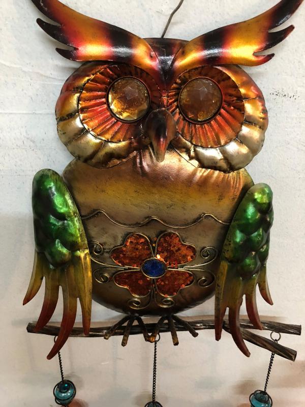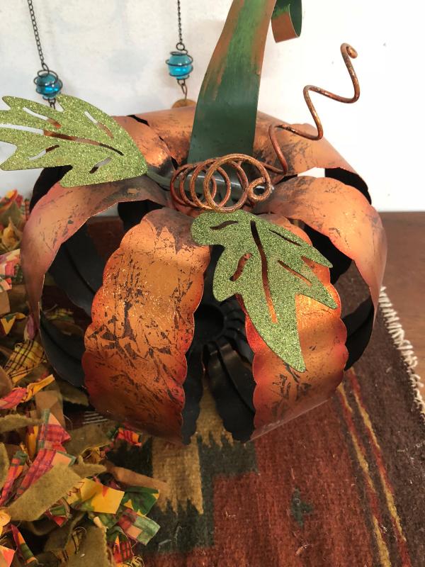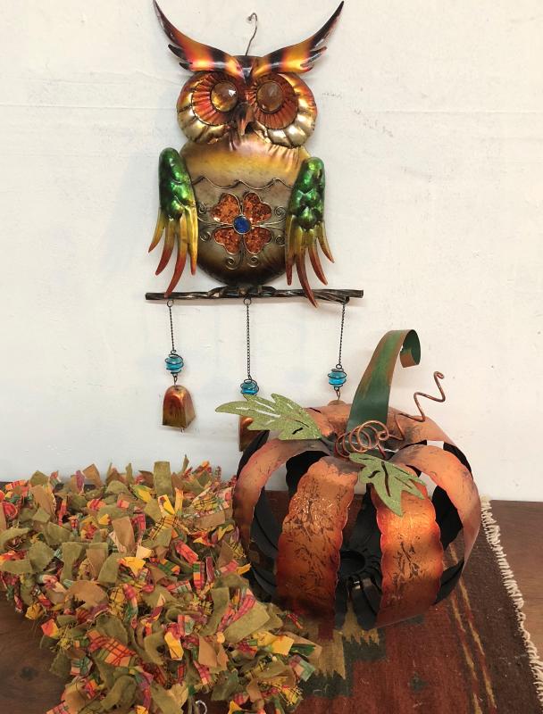 Lot of Fall or Halloween decor, metal owl, metal pumpkin and hand tied fabric garland.