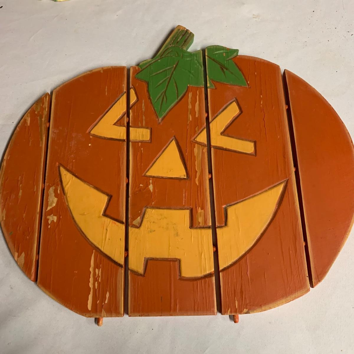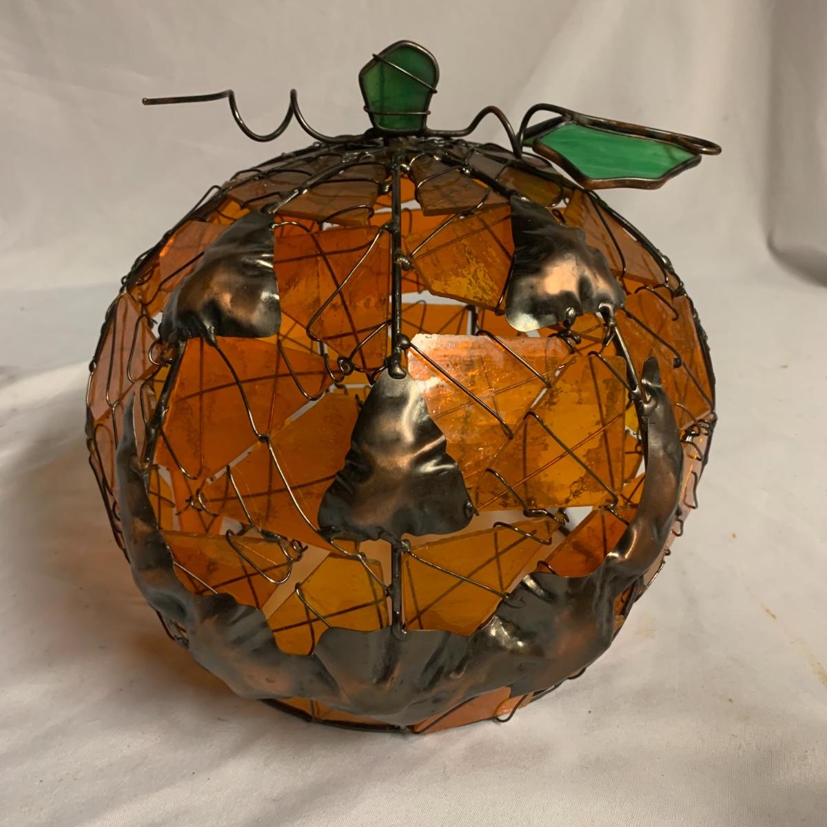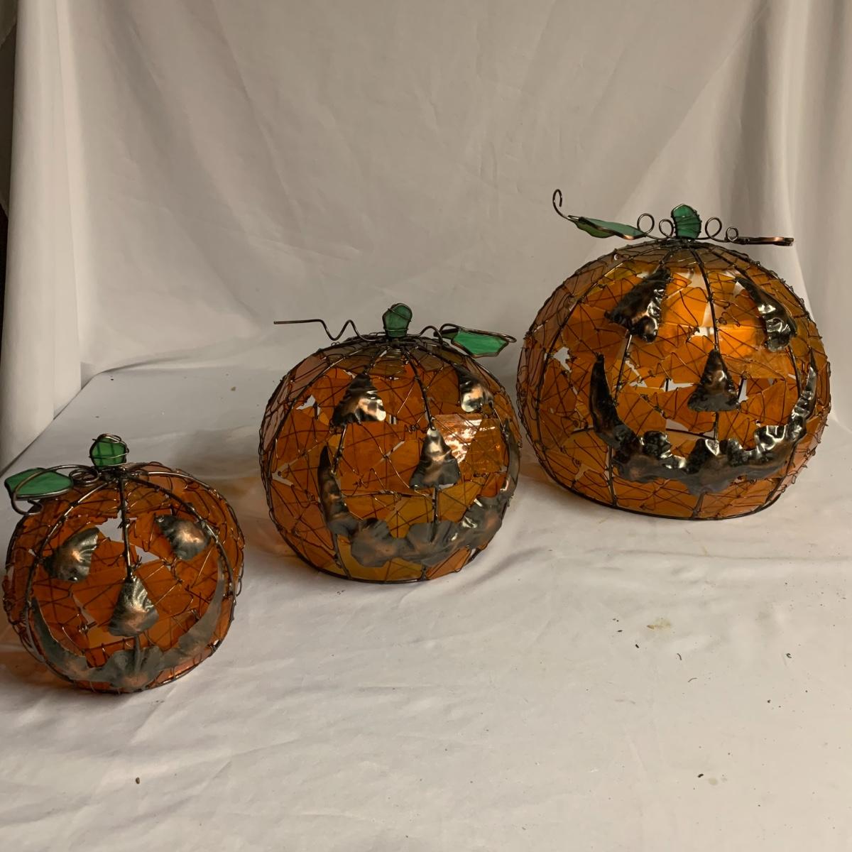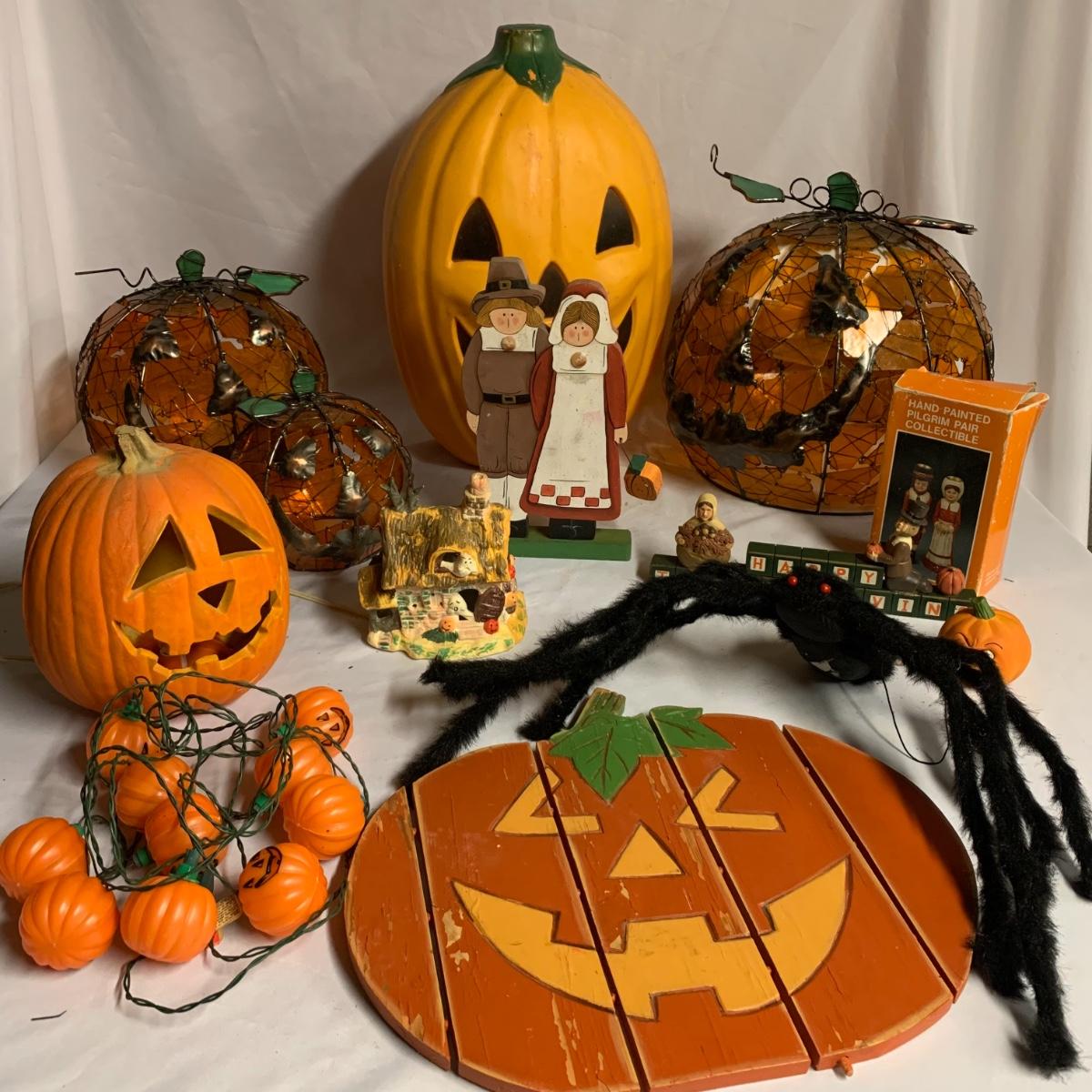 This lot includes an assortment of Halloween, thanksgiving, and fall home decor. The lot also includes a nesting set of mosaic glass pumpkins. The largest pumpkin measures about 20in tall. Local Pickup Only.