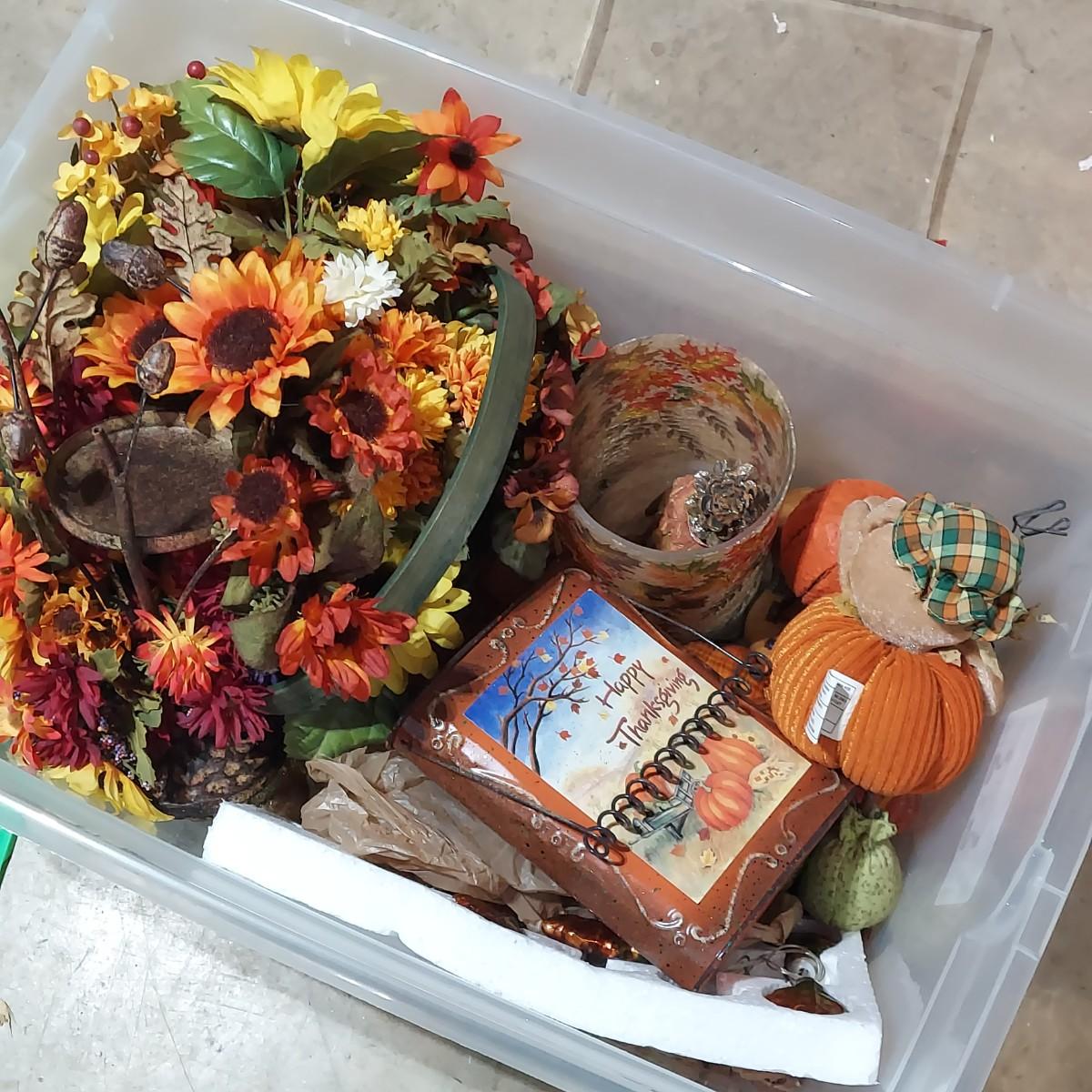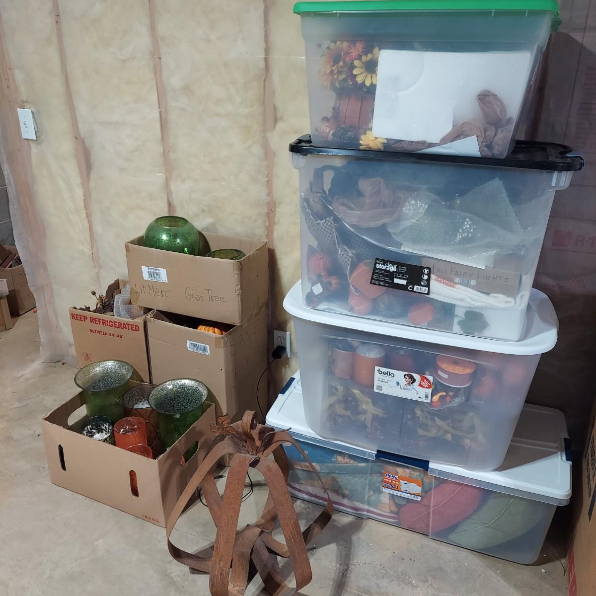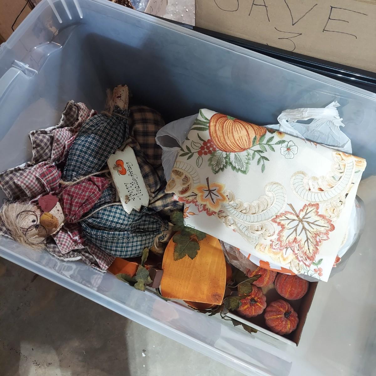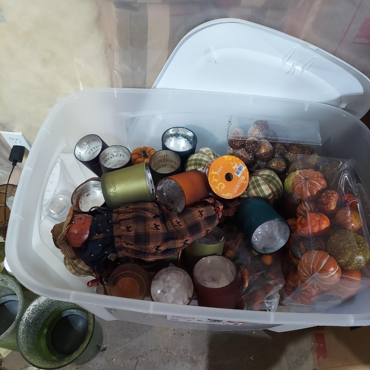 Lot includes four storage bins and several boxes filled with Fall Home Decor. There are glass candle holders, many come with battery operated led flicker packs. Plus blankets, pillows and tablecloths. Also includes several styles of decorative pumpkins and some faux foliage. This is a very large lot. Please plan accordingly for transportation. Please see photos for details. Local Pickup Only