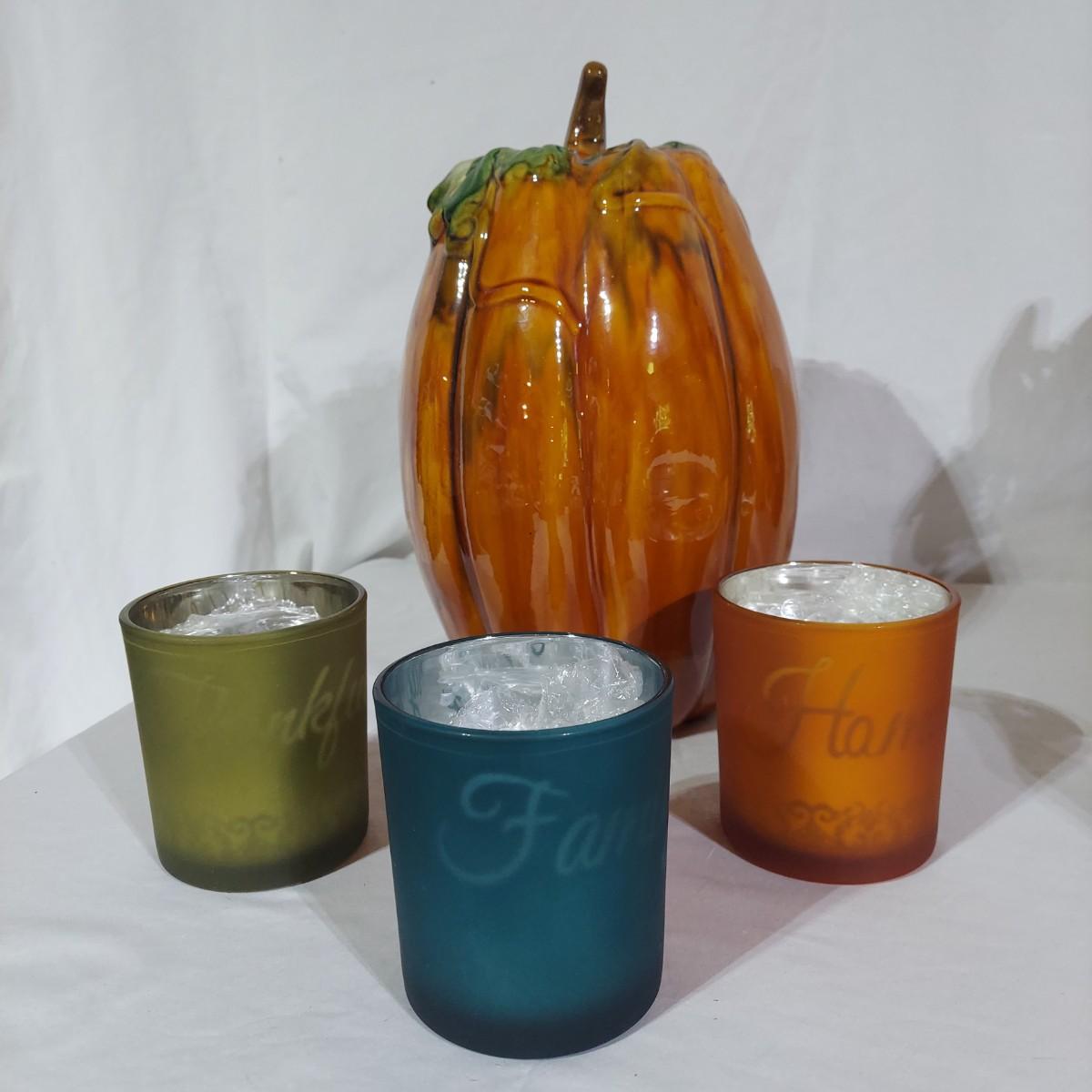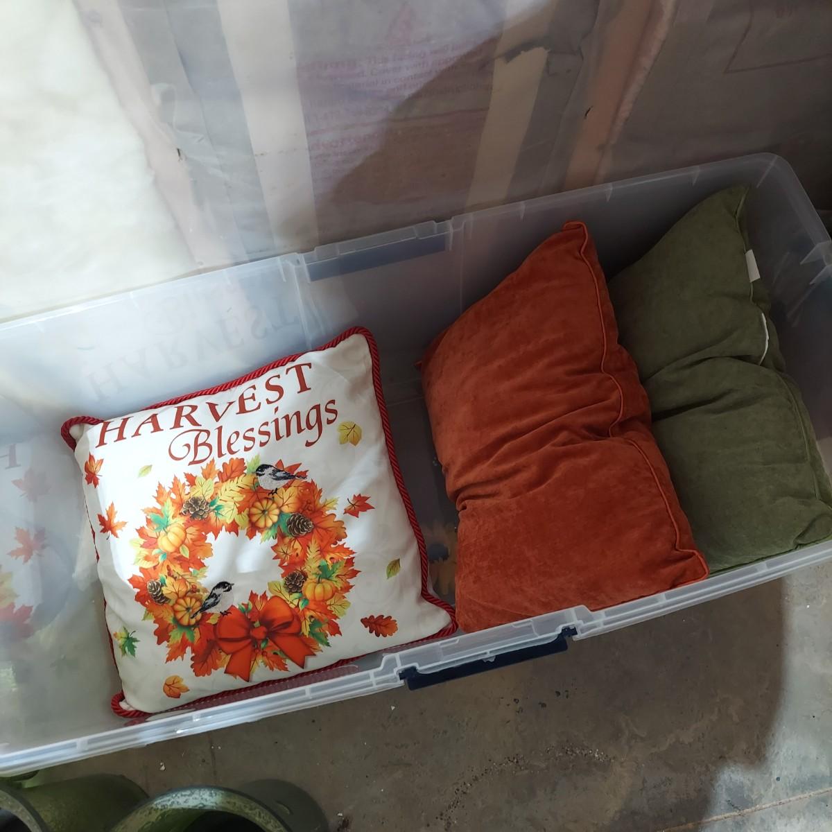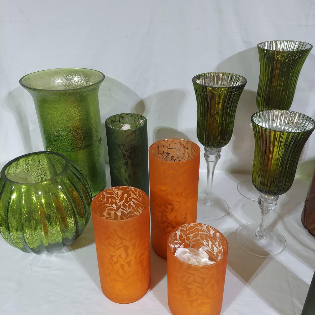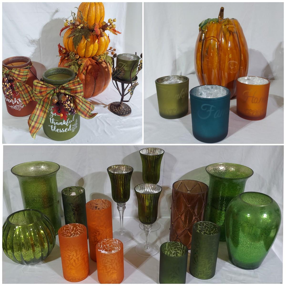 Lot includes four storage bins and several boxes filled with Fall Home Decor. There are glass candle holders, many come with battery operated led flicker packs. Plus blankets, pillows and tablecloths. Also includes several styles of decorative pumpkins and some faux foliage. This is a very large lot. Please plan accordingly for transportation. Please see photos for details. Local Pickup Only