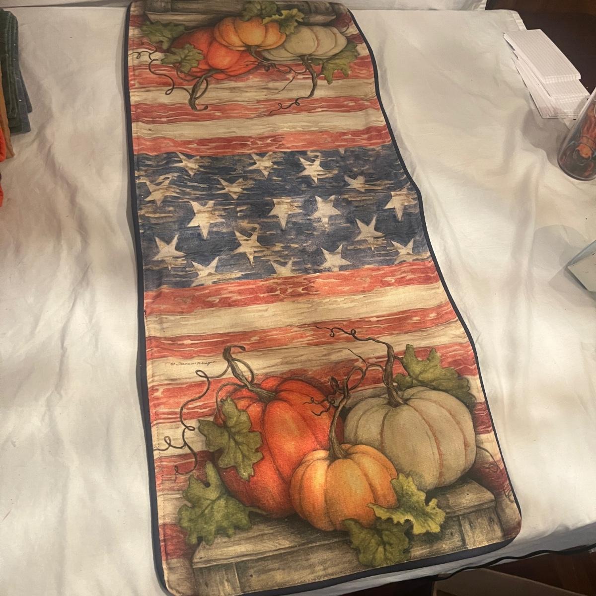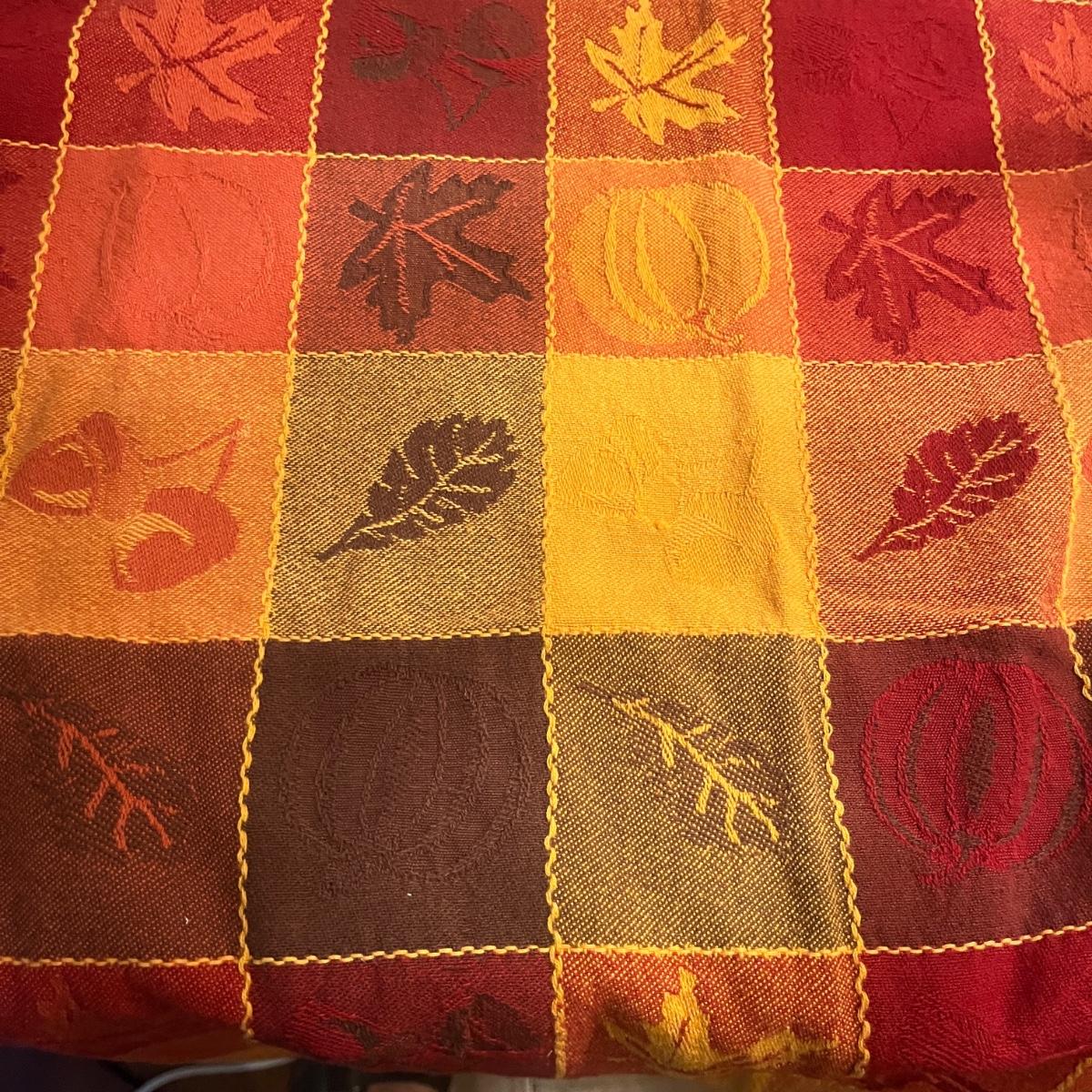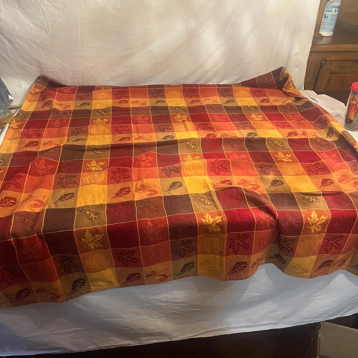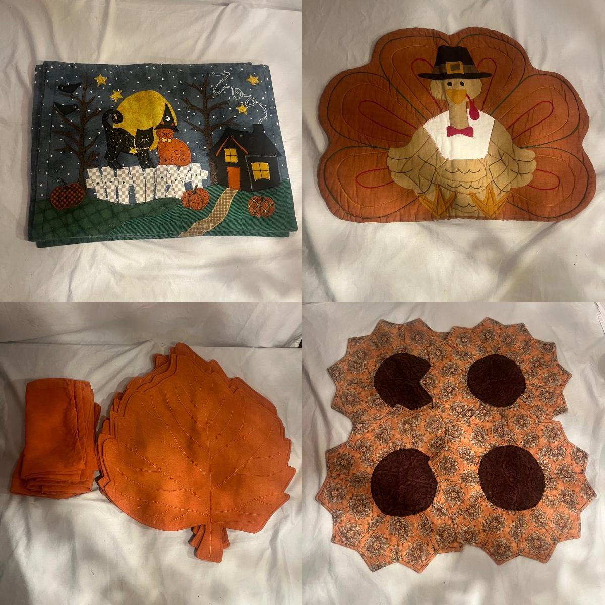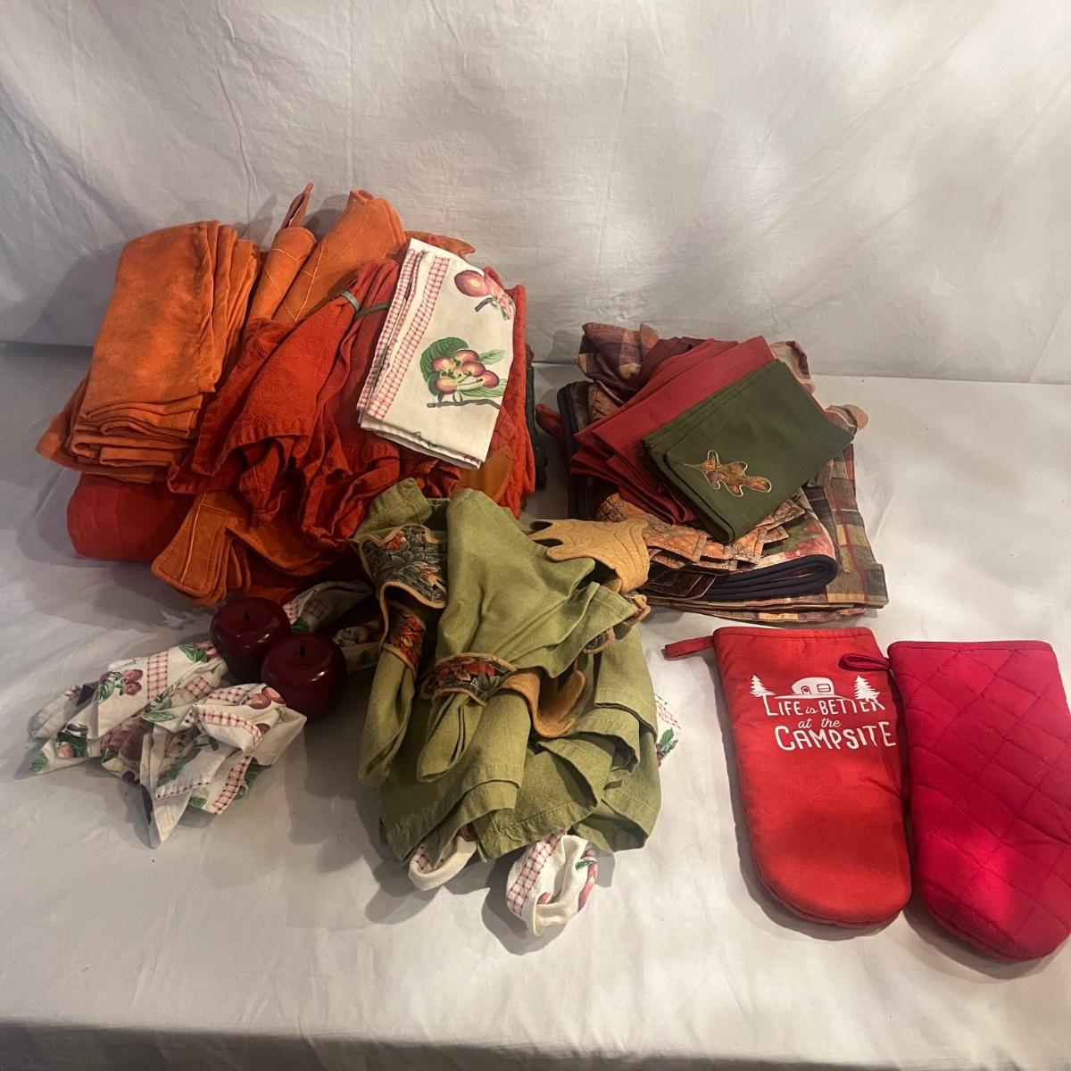 Lot contains a large selection of fall linens, placemats napkin rings, table runners, oven gloves and tablecloths. Largest tablecloth measures 50” x 58”.