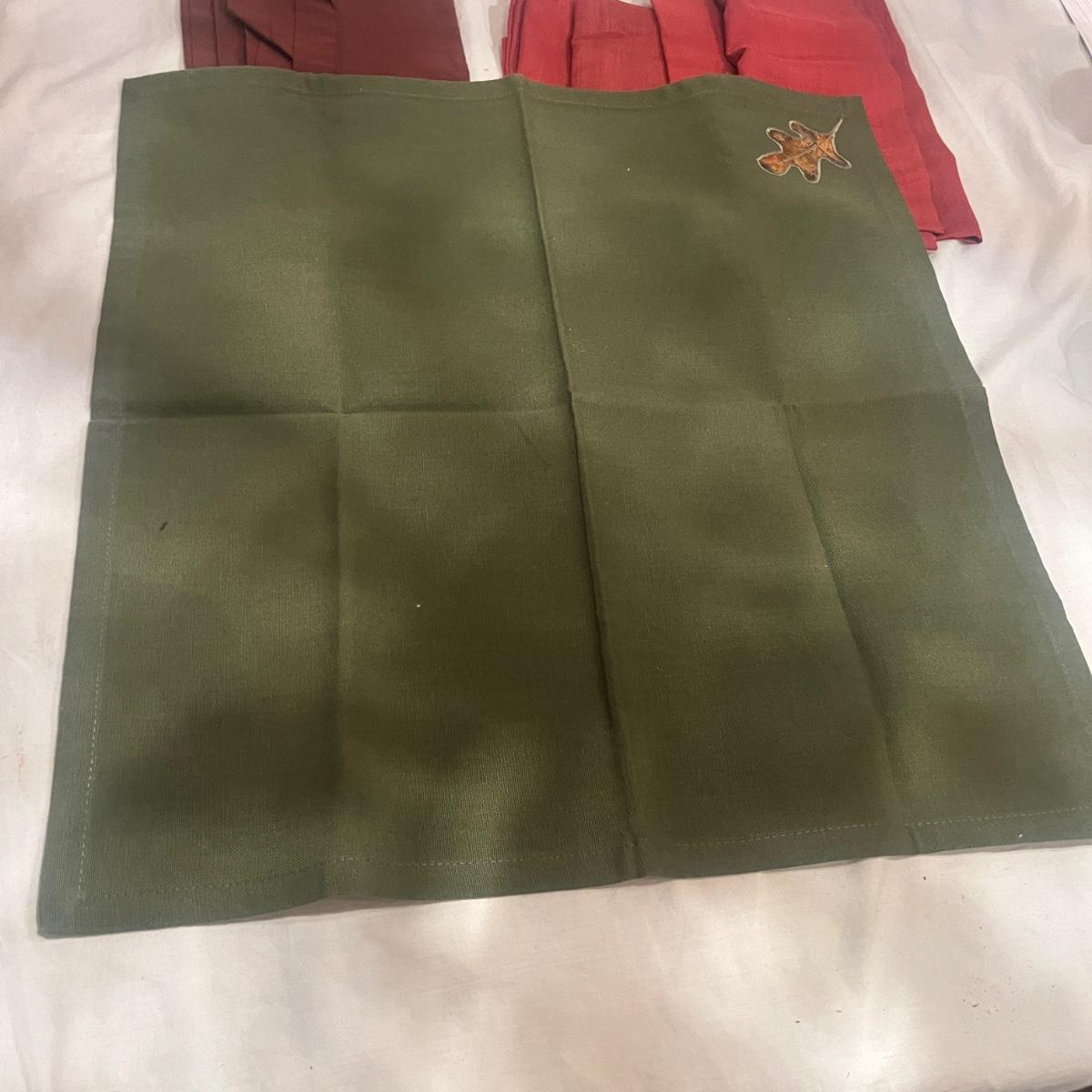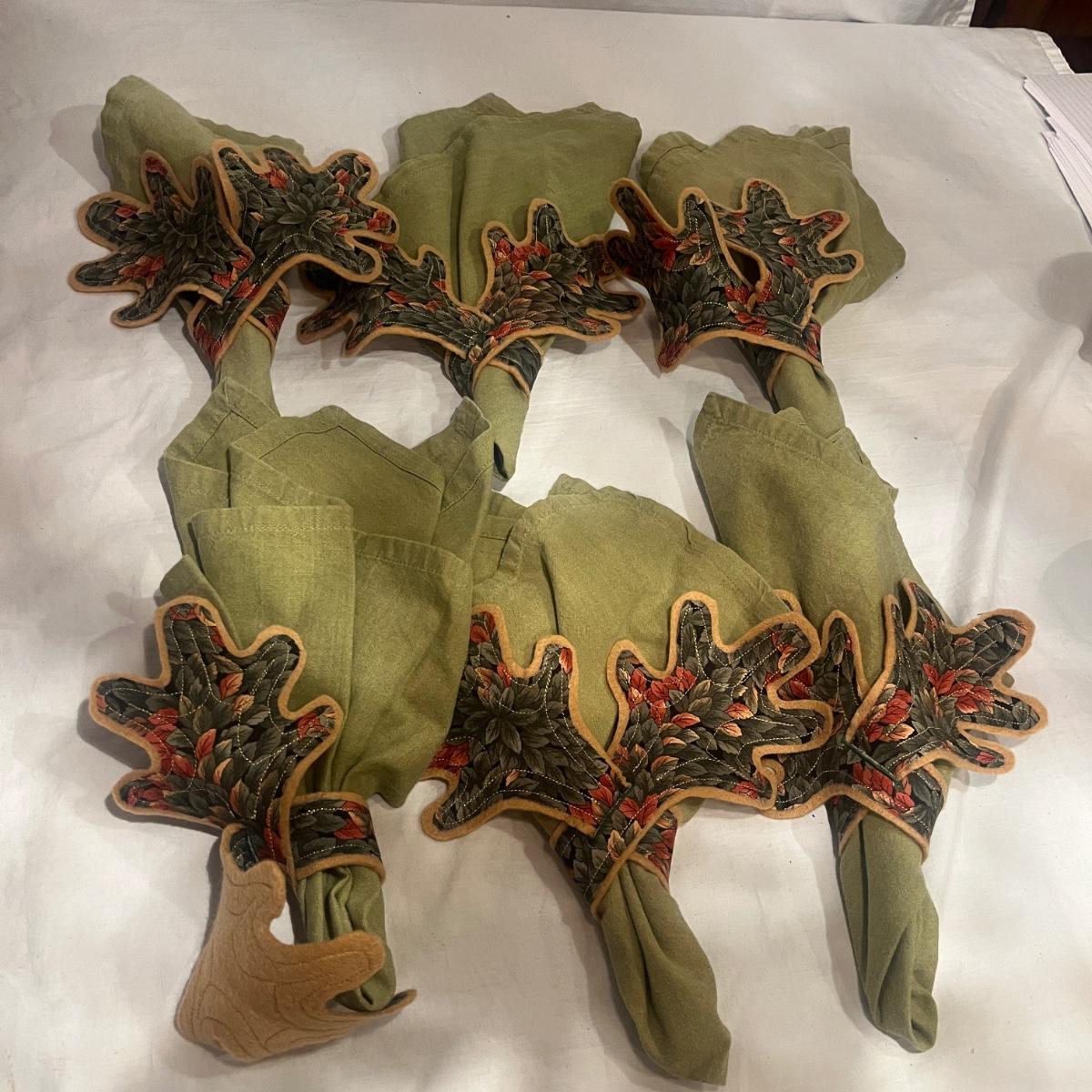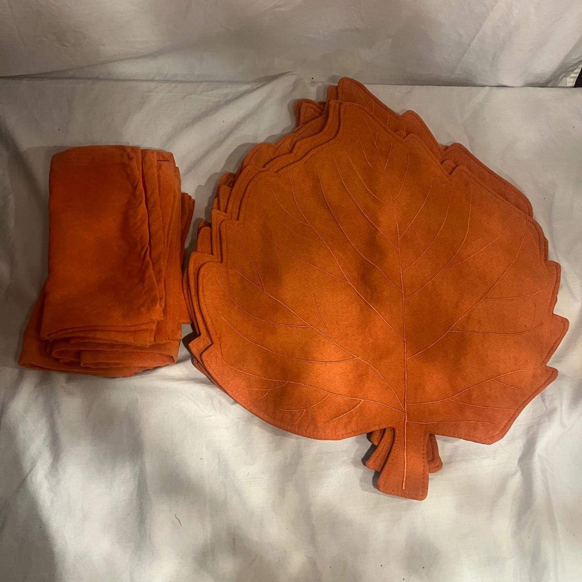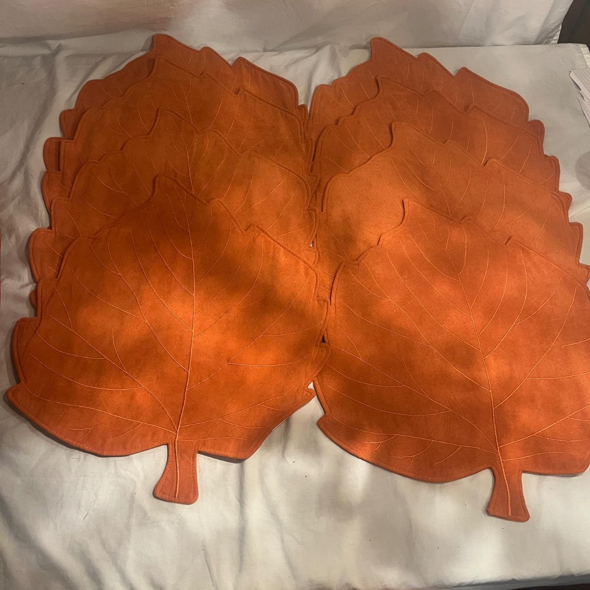 Lot contains a large selection of fall linens, placemats napkin rings, table runners, oven gloves and tablecloths. Largest tablecloth measures 50” x 58”.