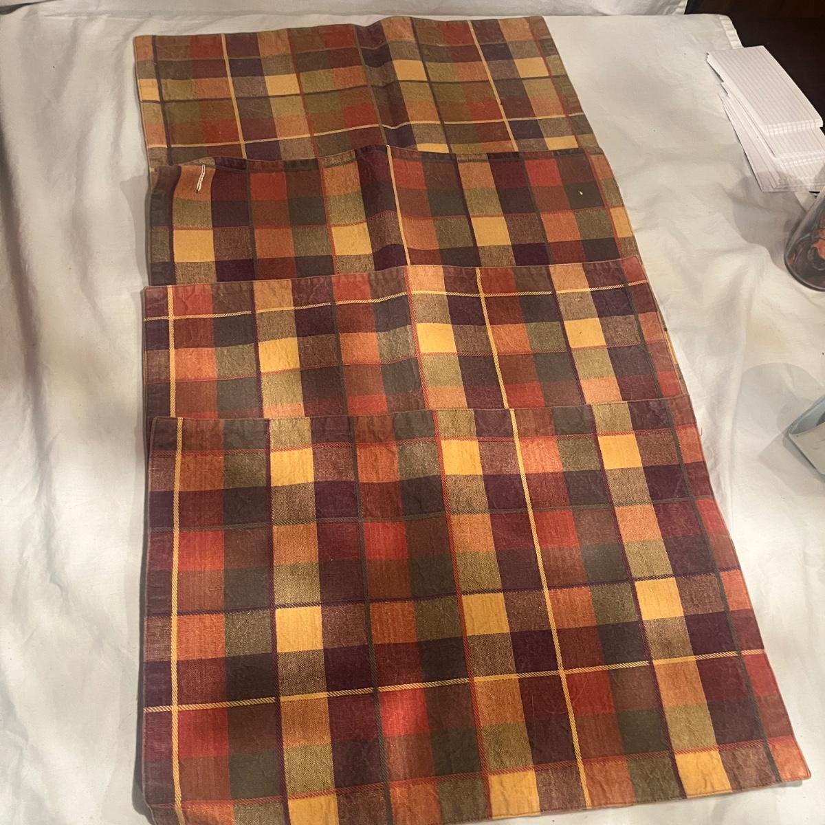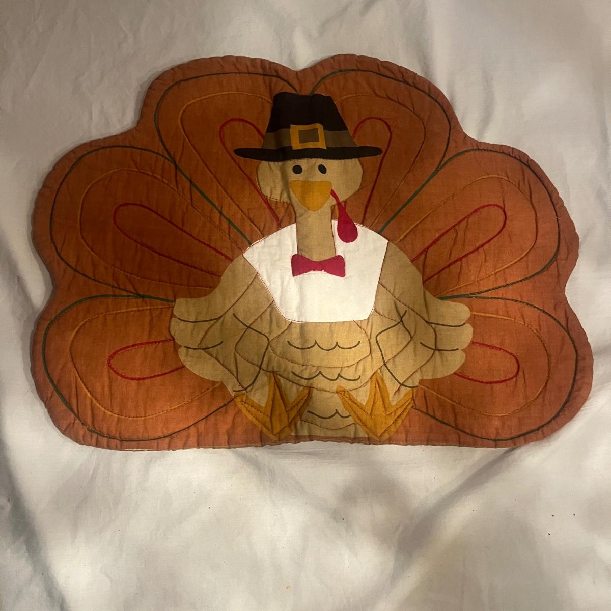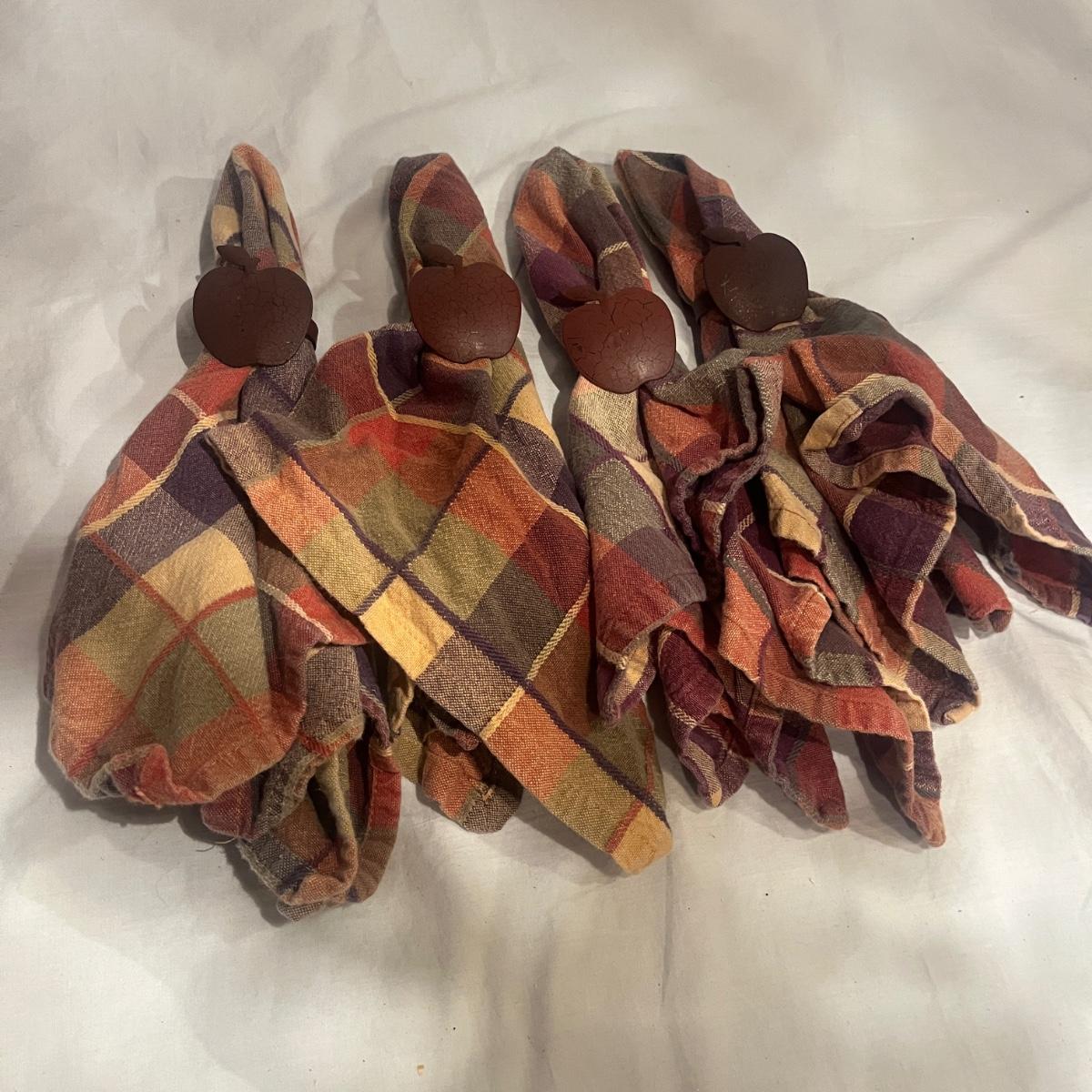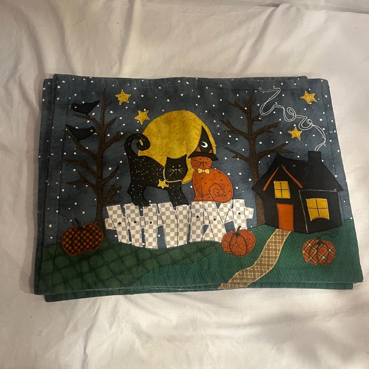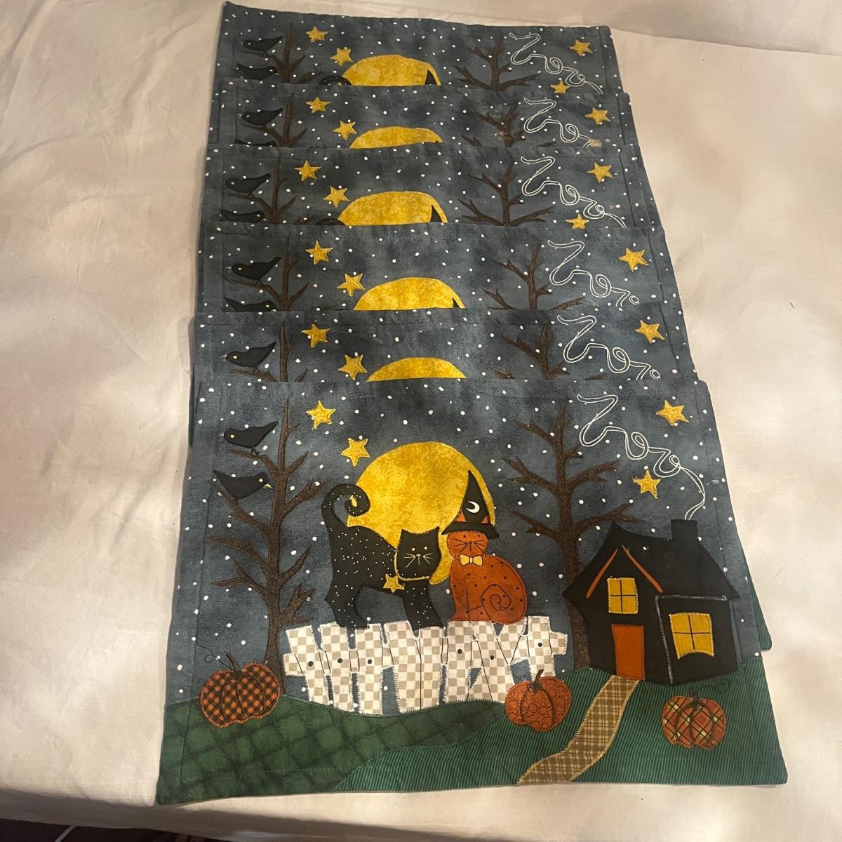 Lot contains a large selection of fall linens, placemats napkin rings, table runners, oven gloves and tablecloths. Largest tablecloth measures 50” x 58”.