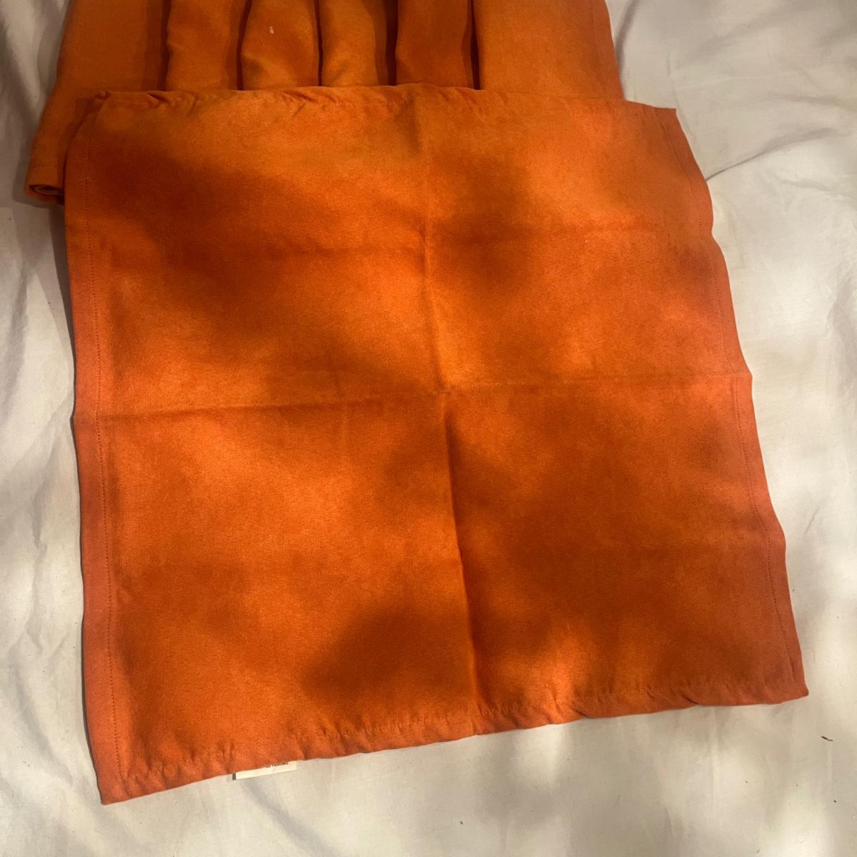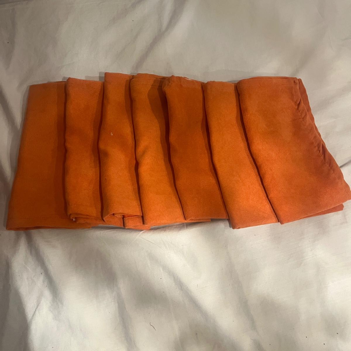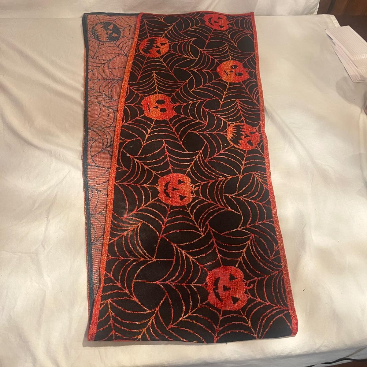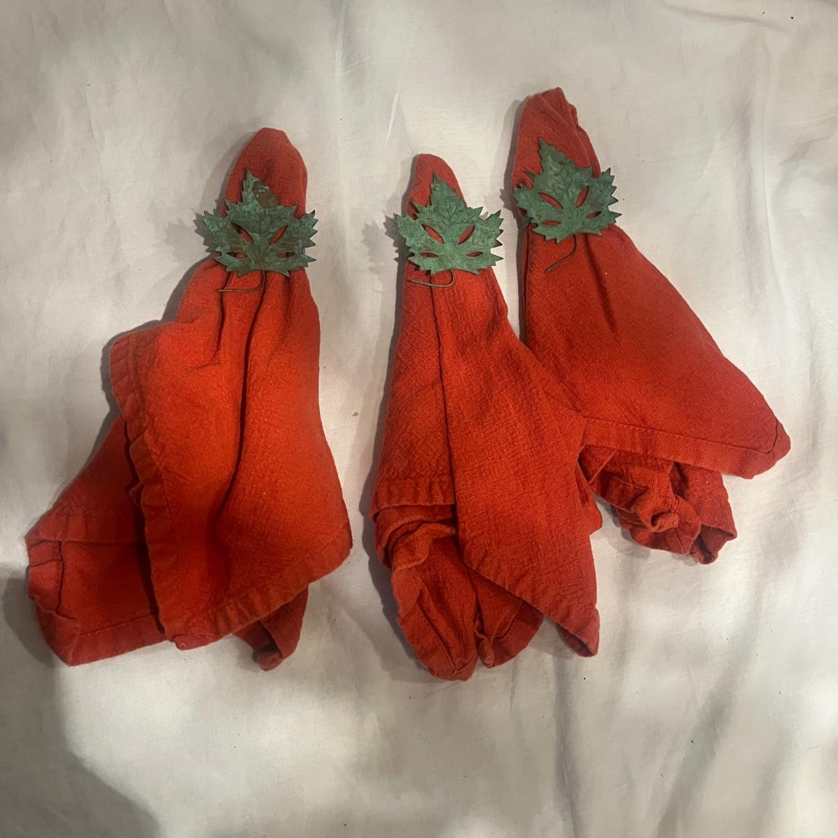 Lot contains a large selection of fall linens, placemats napkin rings, table runners, oven gloves and tablecloths. Largest tablecloth measures 50” x 58”.