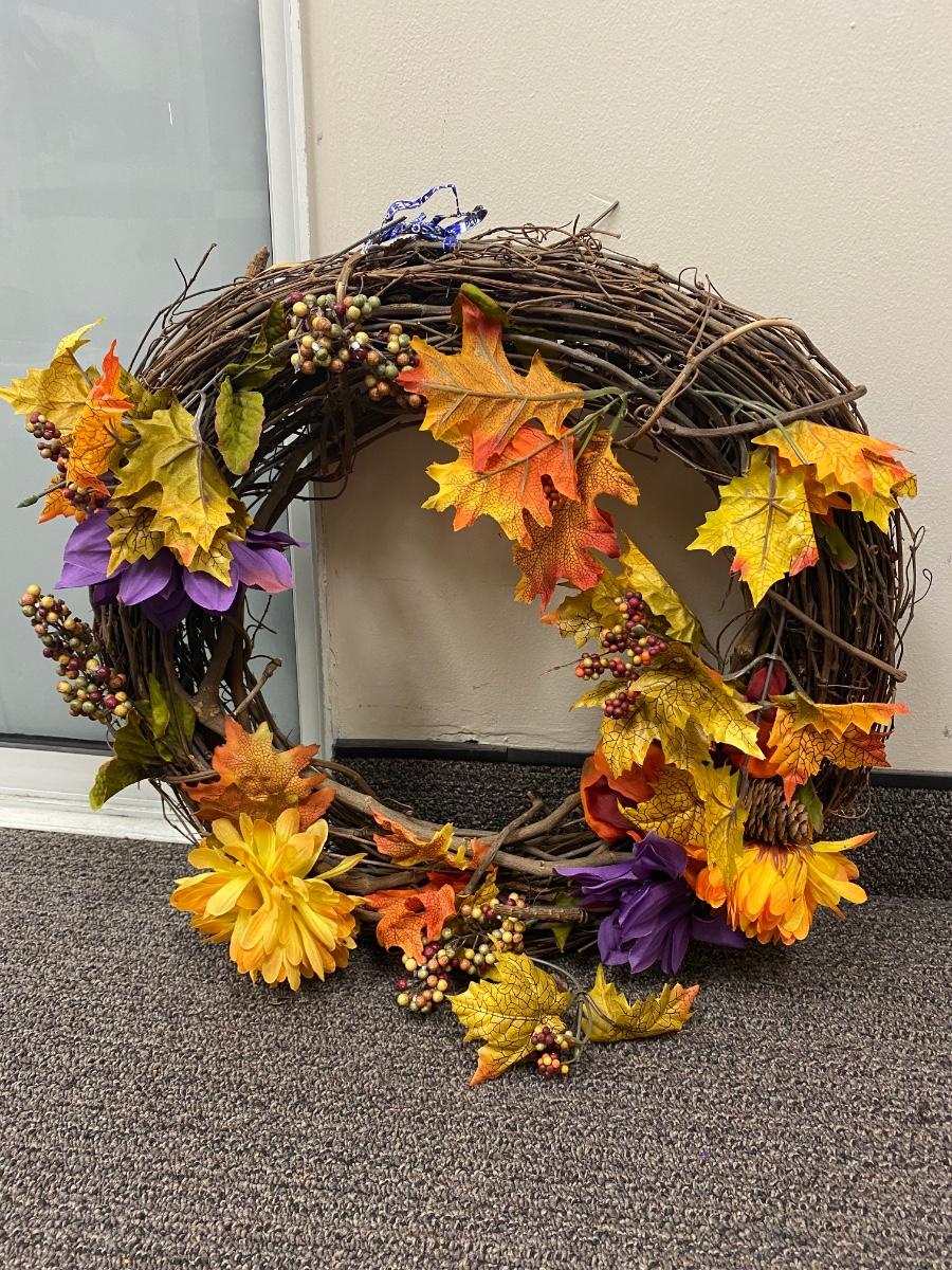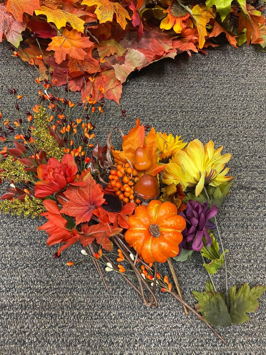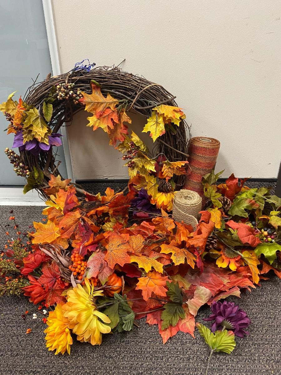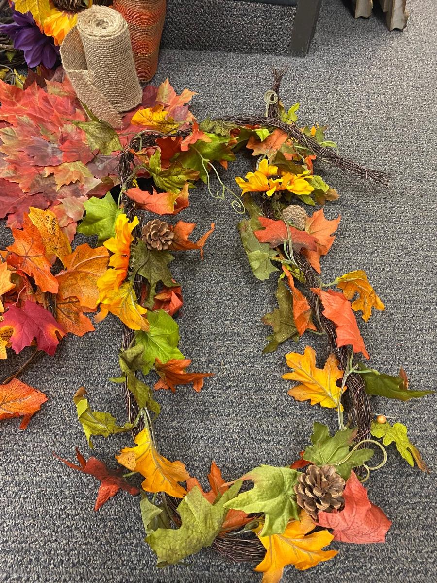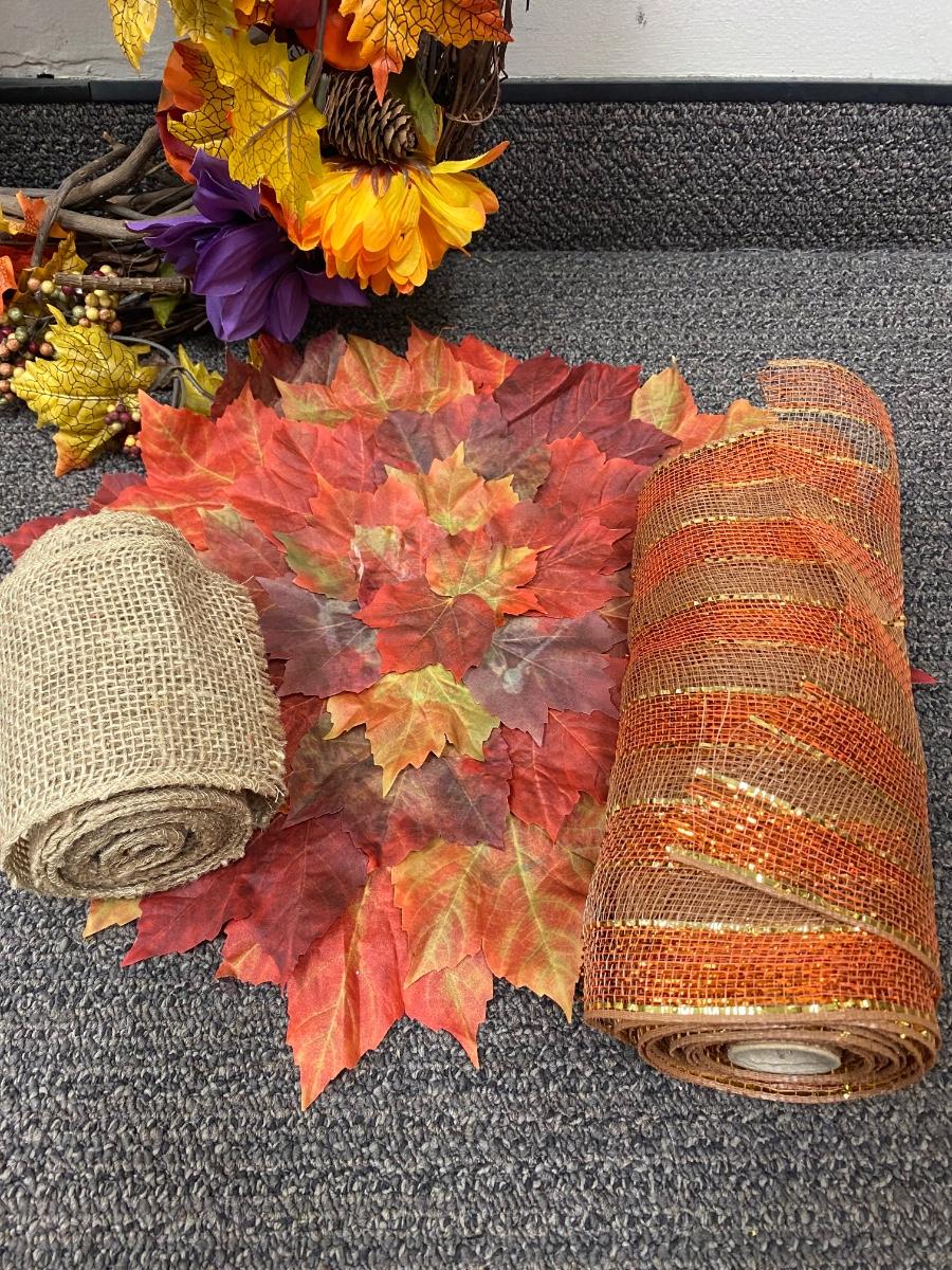 Seasonal Autumn crafting supplies. Rustic wreath, fall leaf garland, artificial floral stems, and two rolls of burlap material.