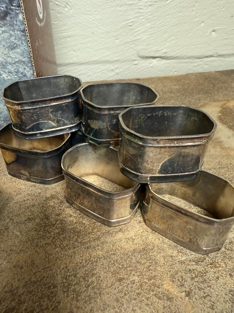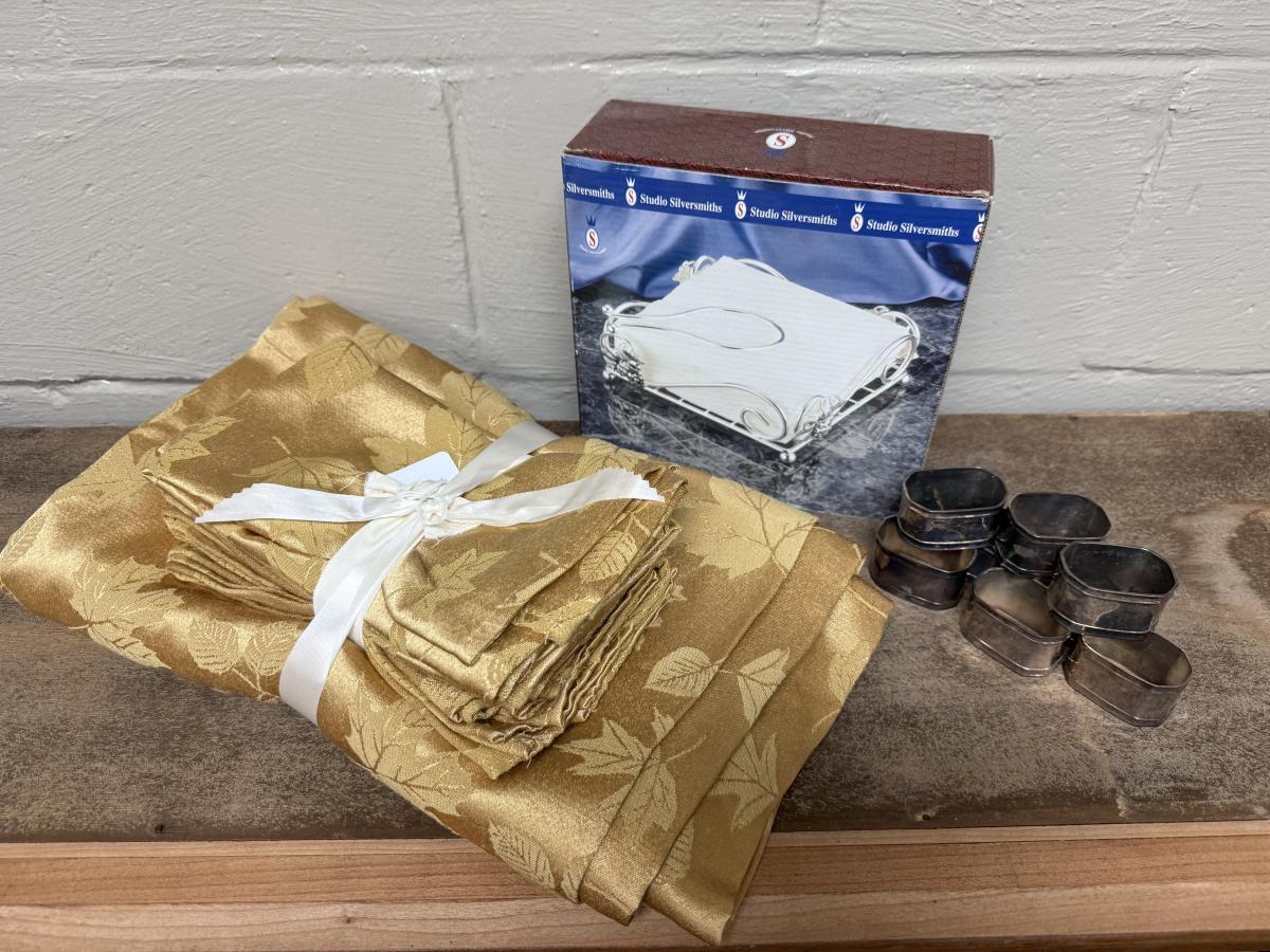 Fall gold table & napkins, silverplate nankins rings (8) & napkin holder