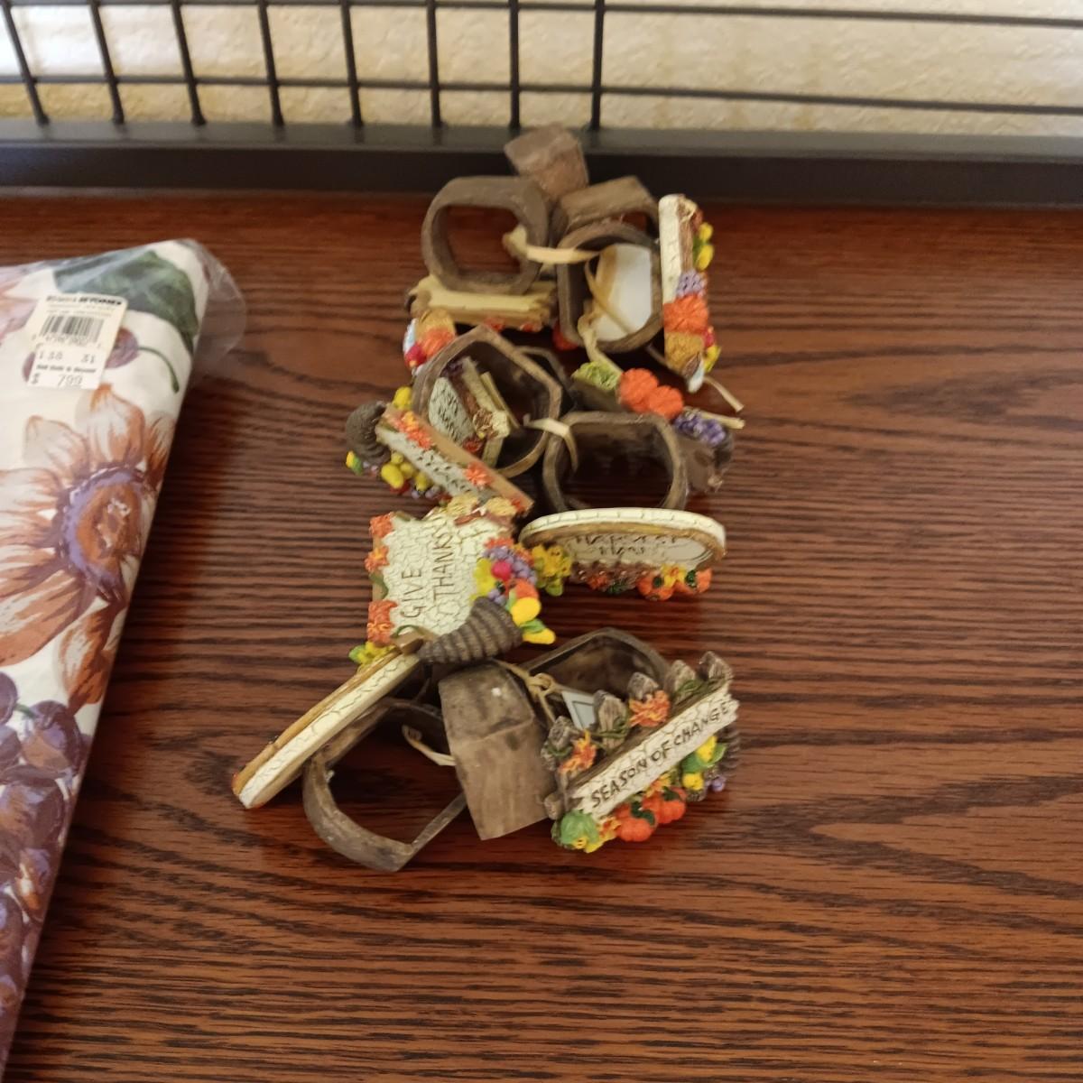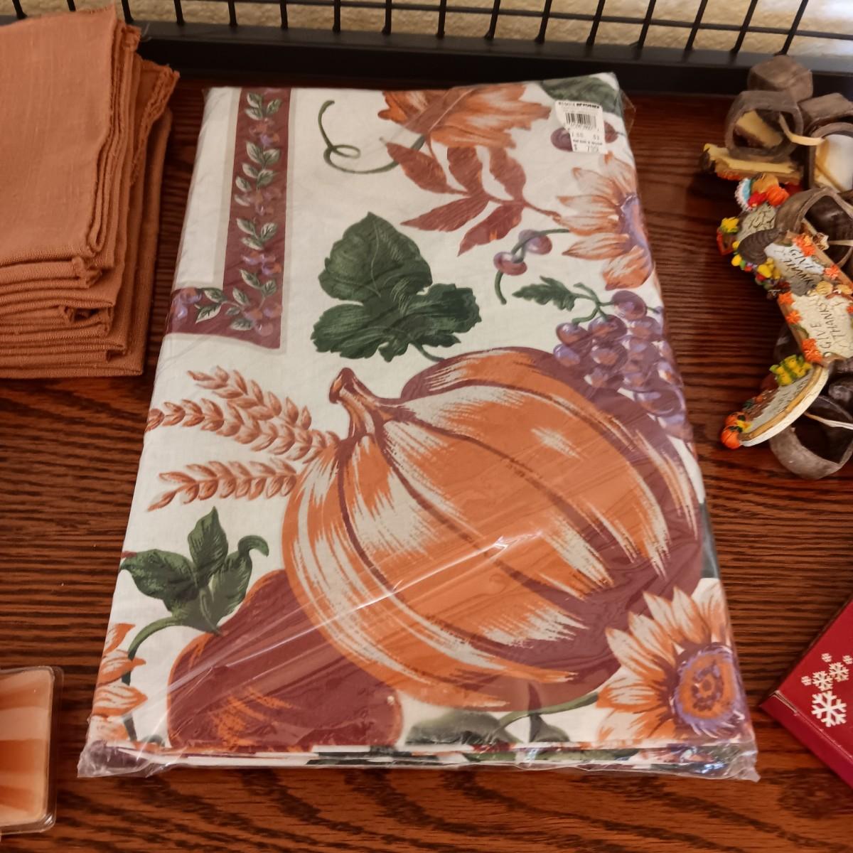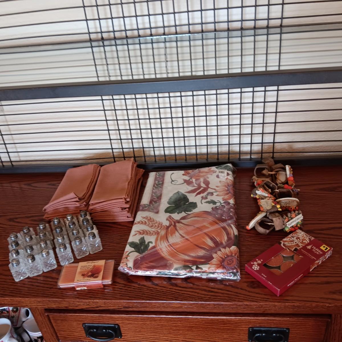 FALL THEMED LINEN TABLECLOTH & NAPKINS PLUS SHAKERS AND NAPKIN RINGS FOR 12