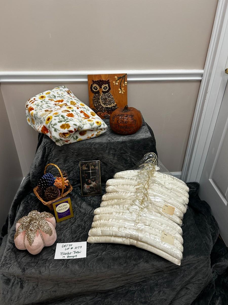 Plush soft throw with woodland florals and animals theme, owl art made with beans, Give Thanks pumpkin, three packs of soft hangers, basket of painted pinecones, sequined pumpkin, and miscellaneous other small items in this great lot.