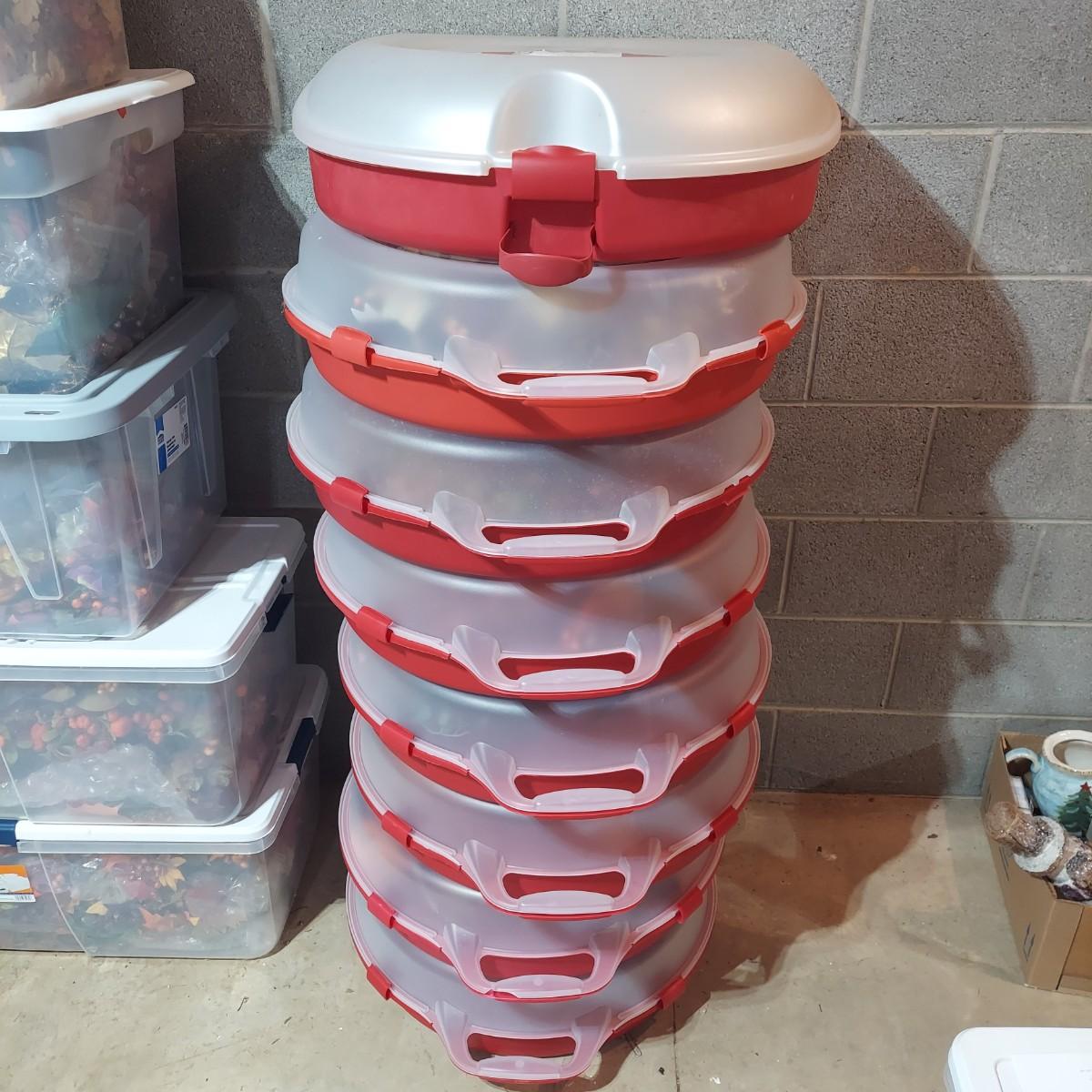 Nine Fall wreaths made from faux foliage with eight plastic containers for storing wreaths. Containers measure approximately 22"D across. Wreaths average 14-24"D across. A few clips are broken on some of the storage containers. Please see photos for details. Local Pickup Only
