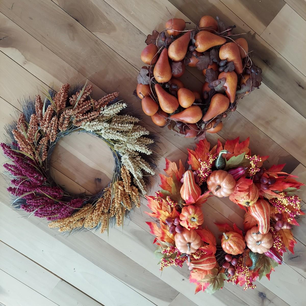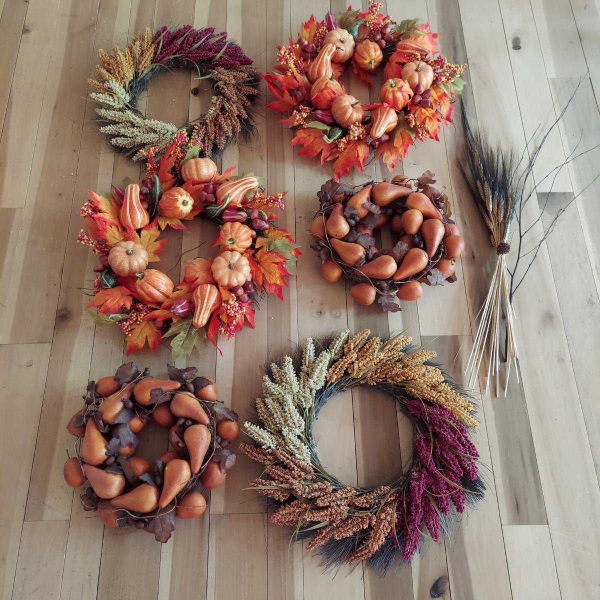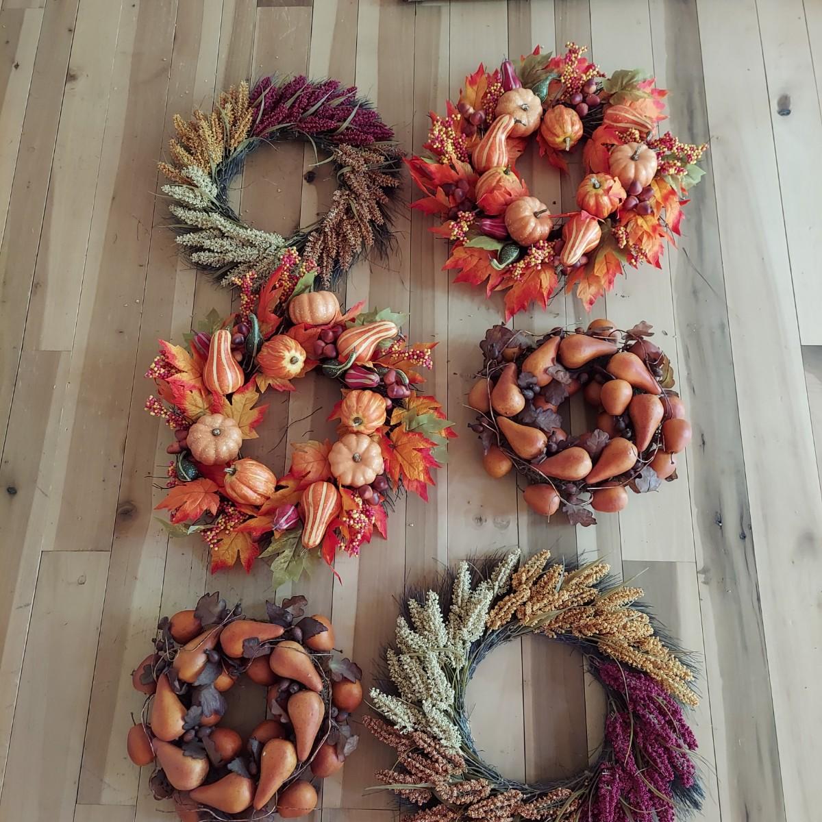 There are 6 wreaths and a handful of dried decorative bits. There are two matching wreaths of each style. There are made from faux materials. They are approximately 15-22" diameter. Shipping available. Shipping certain items can be costly. We suggest contacting our preferred local shipping provider, Postage Express, with dimensions and getting an estimate before bidding: (828) 670-5501 or postageexpress@yahoo.com.