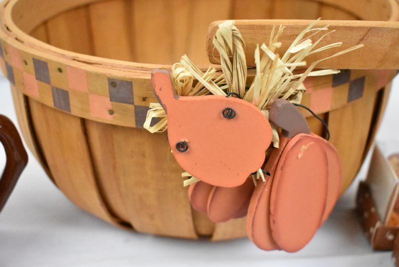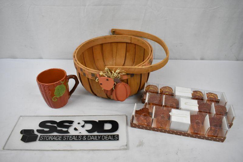 Fall/Autumn/Thanksgiving Items: 12 Glass Turkey Candle Holders, 1 Basket, 1 Mug
