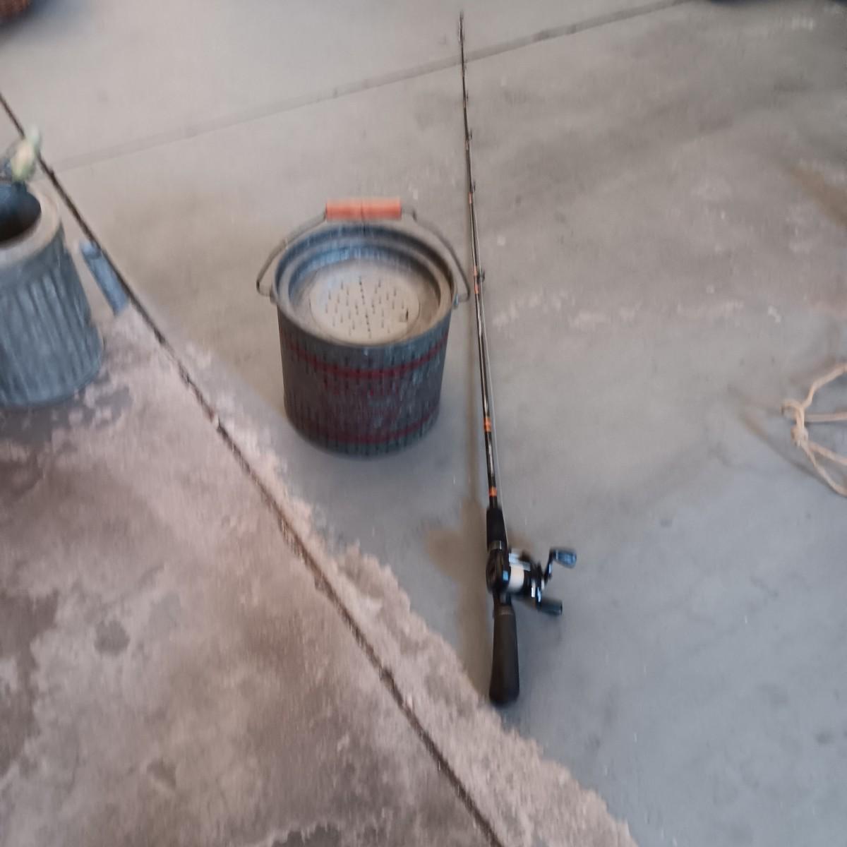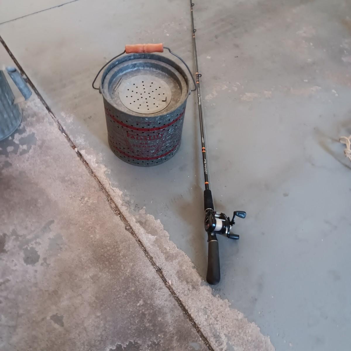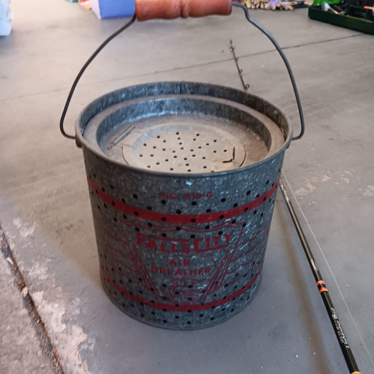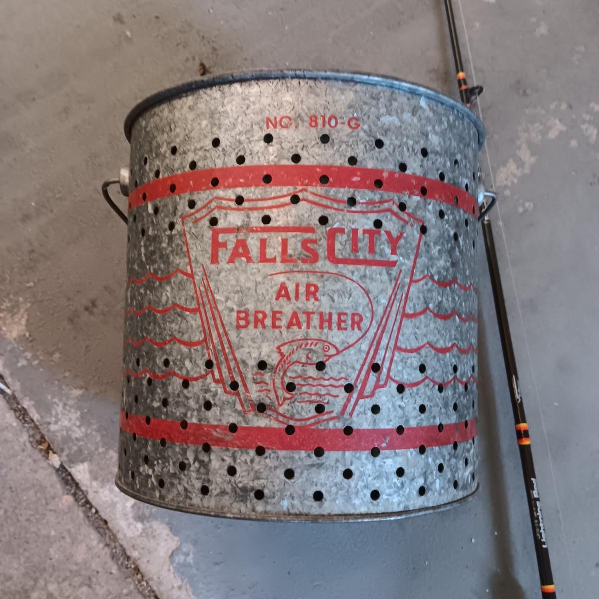 FALLS CITY GALVANIZED MINNOW PAIL AND A BERKLEY FISHING POLE W/REEL