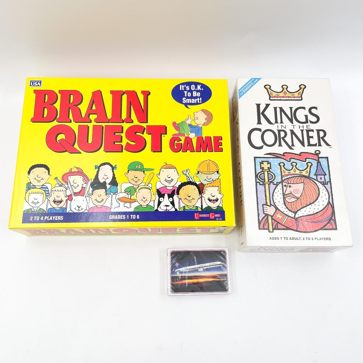 Brain Quest, Kings In The Corner, and an unopened deck of playing cards. All in good condition, all pieces appear to be present.