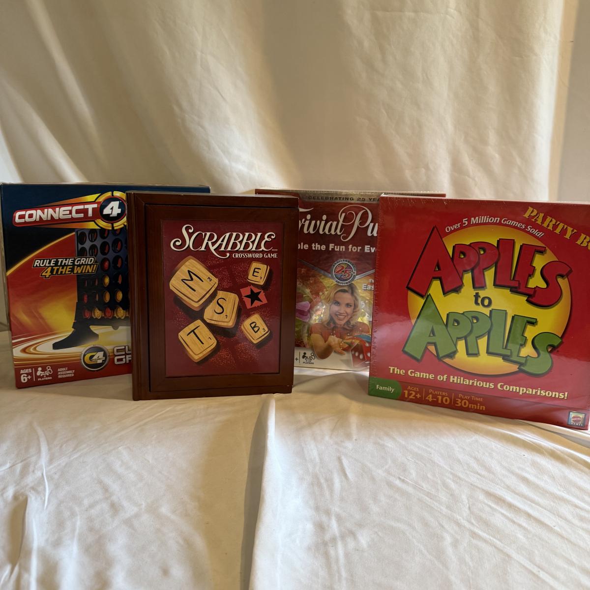 This lot contains four classic games for a good time with the family. Included is Scrabble, Connect Four, a NIB Trivial Pursuit, and a NIB Apples to Apples. See pictures for details. Shipping available.