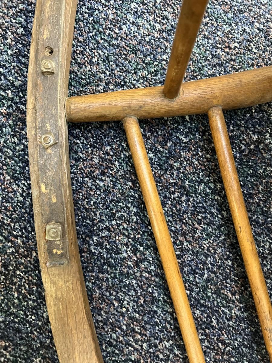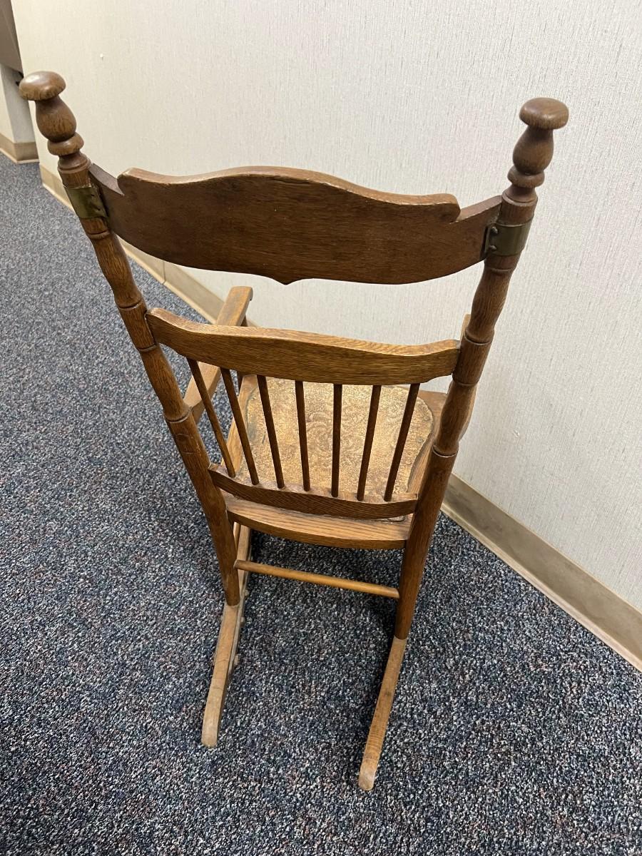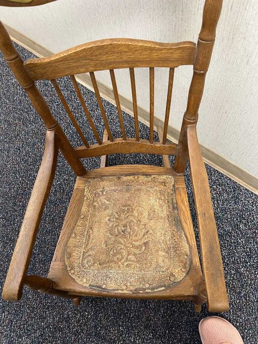 Child or Junior Oak and brass rocking chair. Leather seat.