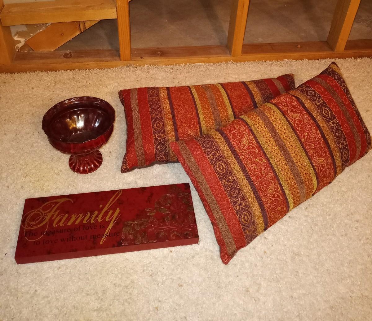 FAMILY METAL SIGN-TWO THROW PILLOWS AND METAL BOWL/VASE