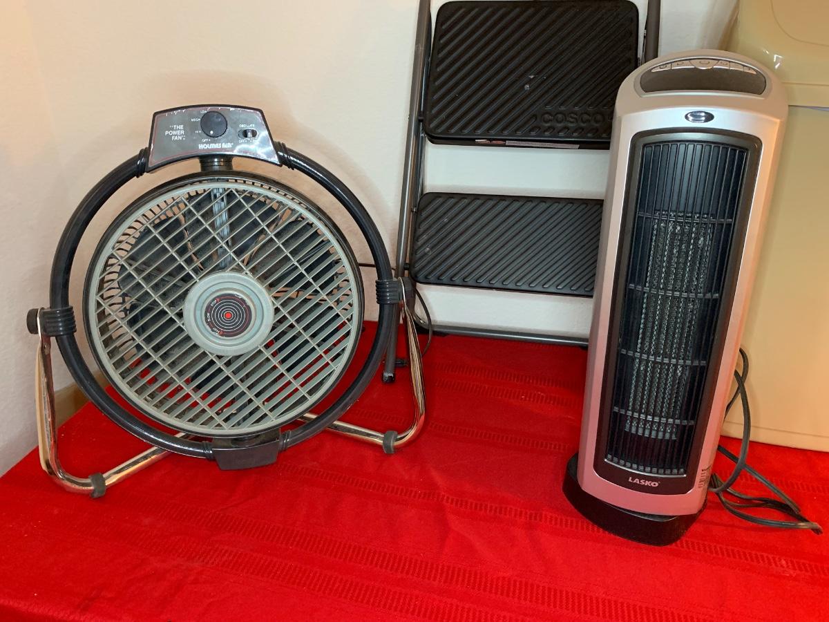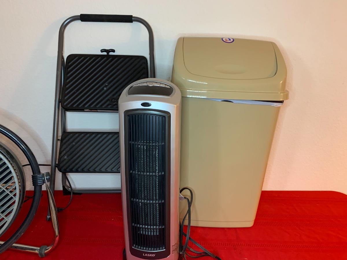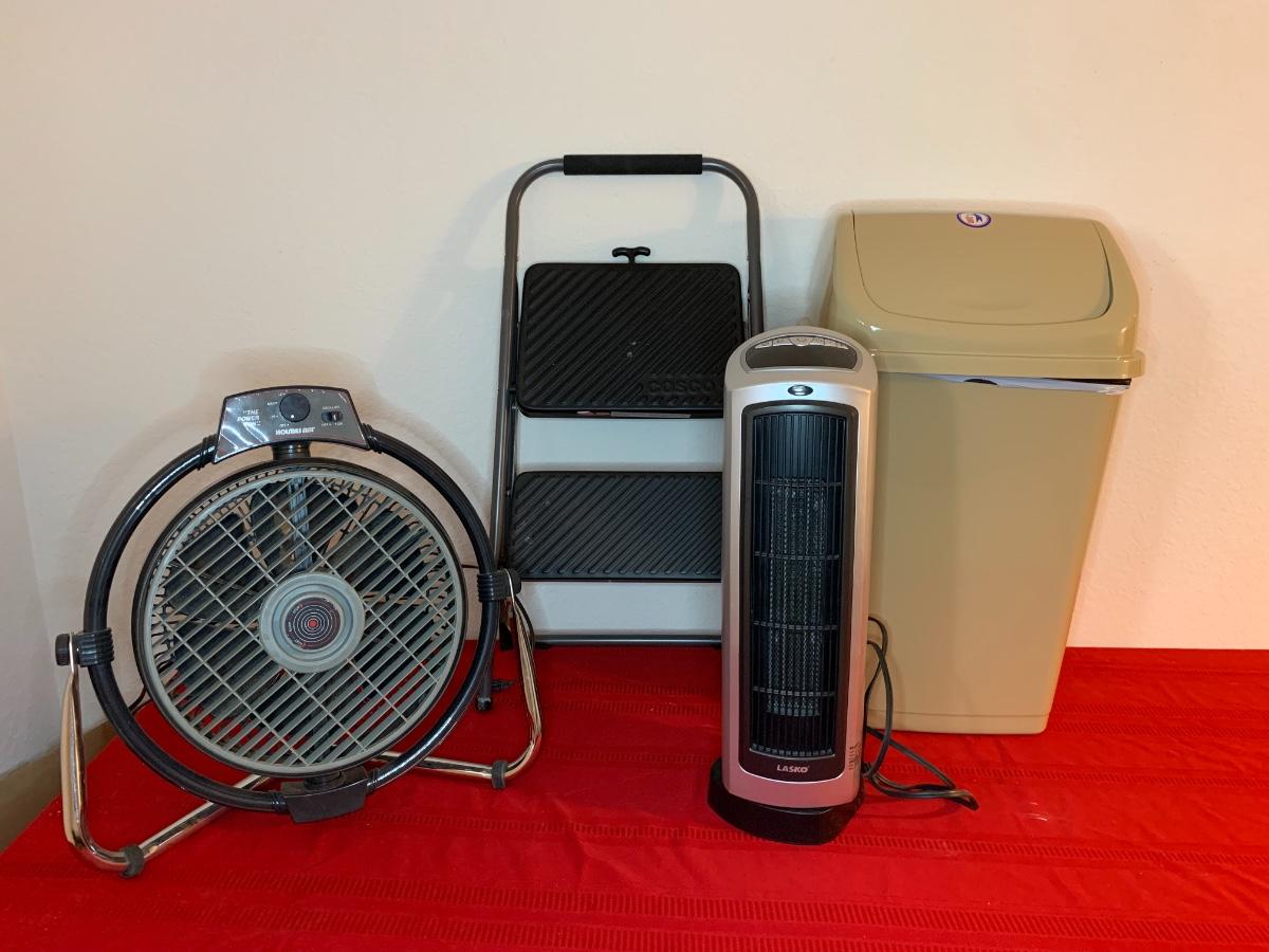 Lot includes two fans, a Lasko Tower fan and room heater and a Holmes Air Power Fan - both tested and work. Also includes a Cosco step stool and a like new Palm Luxe Collection trash can with swing lid. All in good condition.