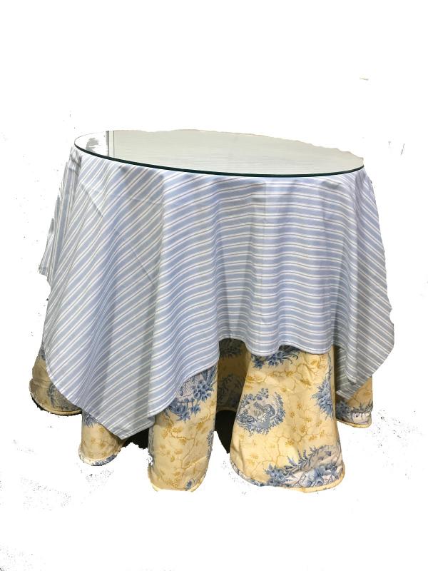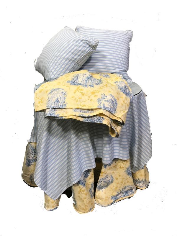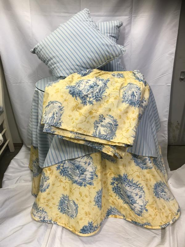 Up for Auction is a Custom Made Queen Yellow and Blue Toile Bedskirt. This skirt comes with a matching Toile Table skirt that measures 86" round and a striped handkerchief measuring 53"x 53". There are two striped pillows that measure 20"x 20" (foam filling).