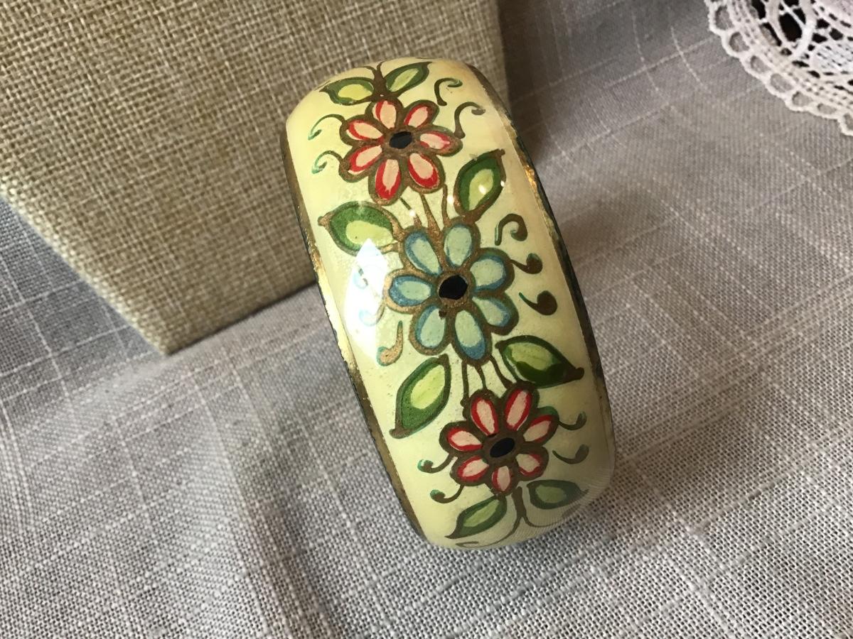 Fancy Bold Floral painted brass bold wide bangle bracelet retro costume jewelry