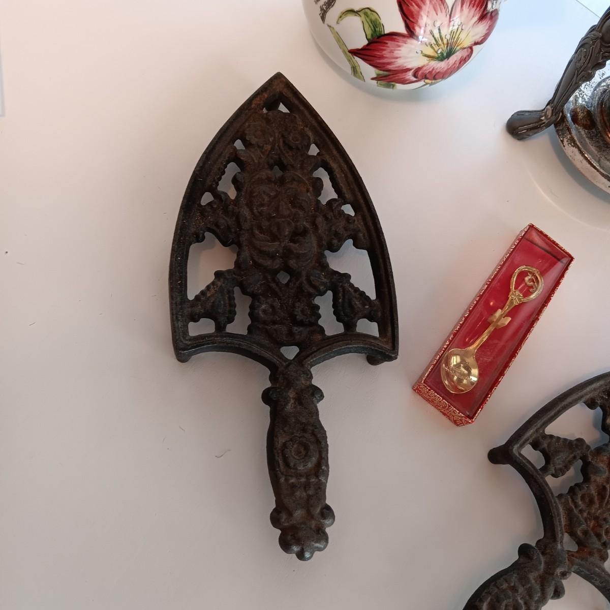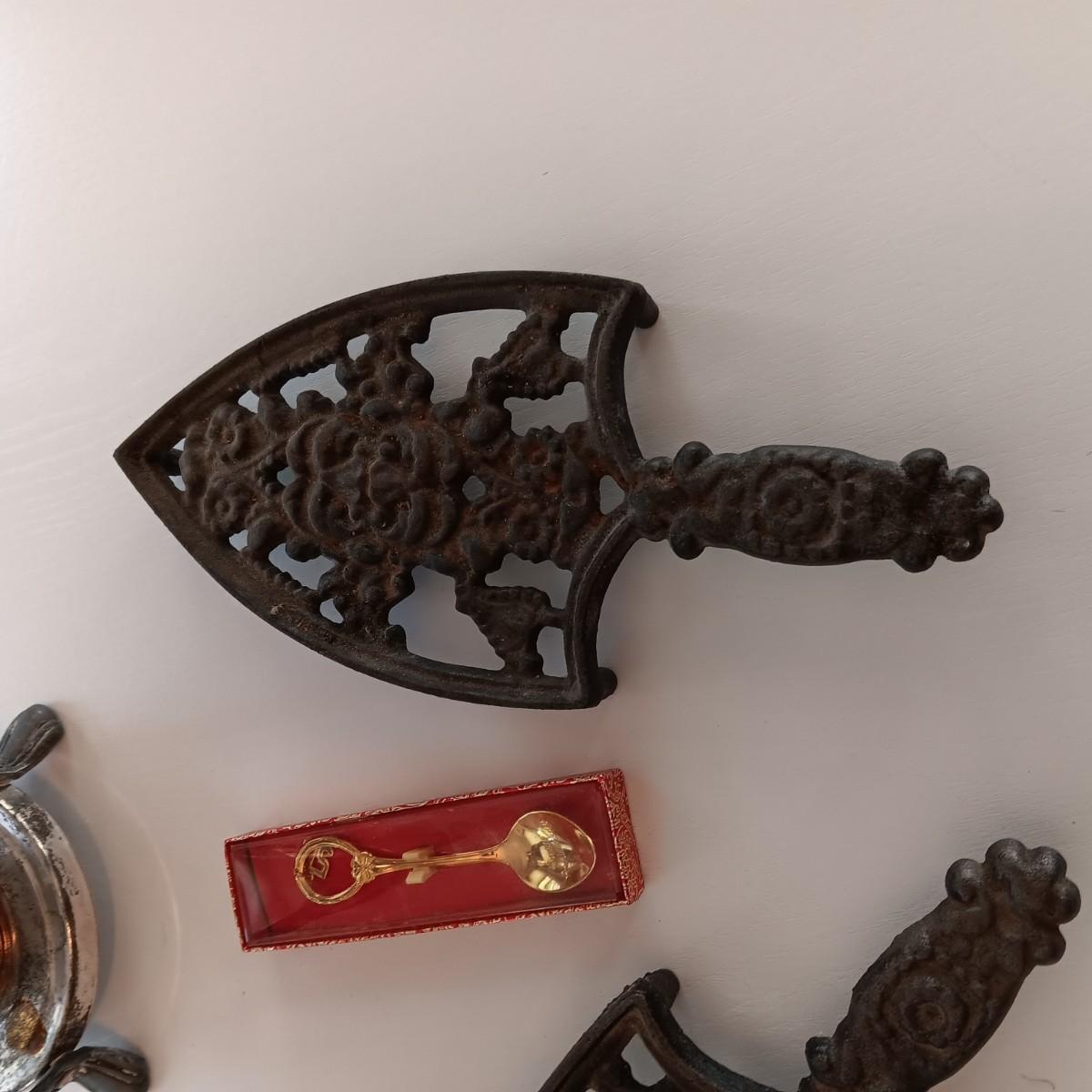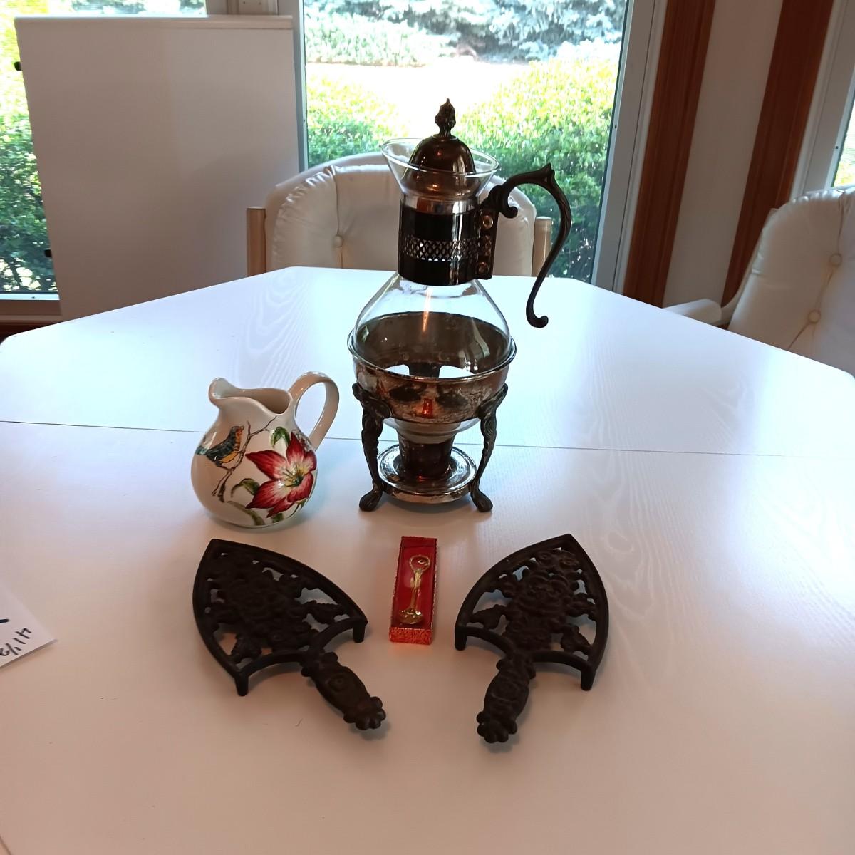 FANCY CARAFE, SMALL PITCHER, 2 CAST IRON TRIVETS