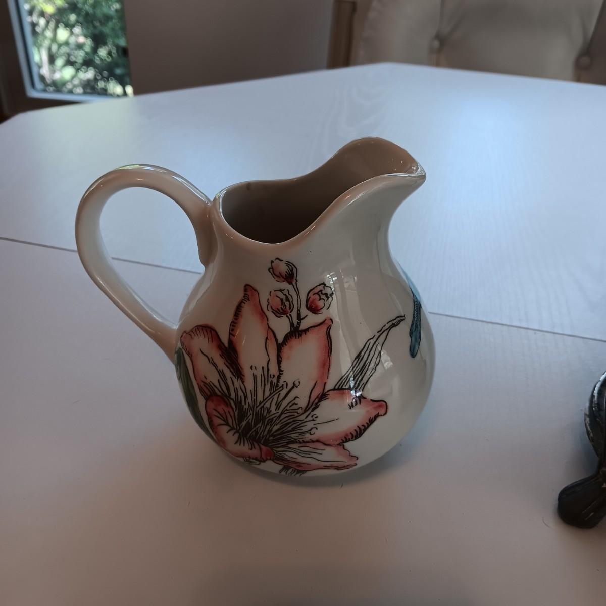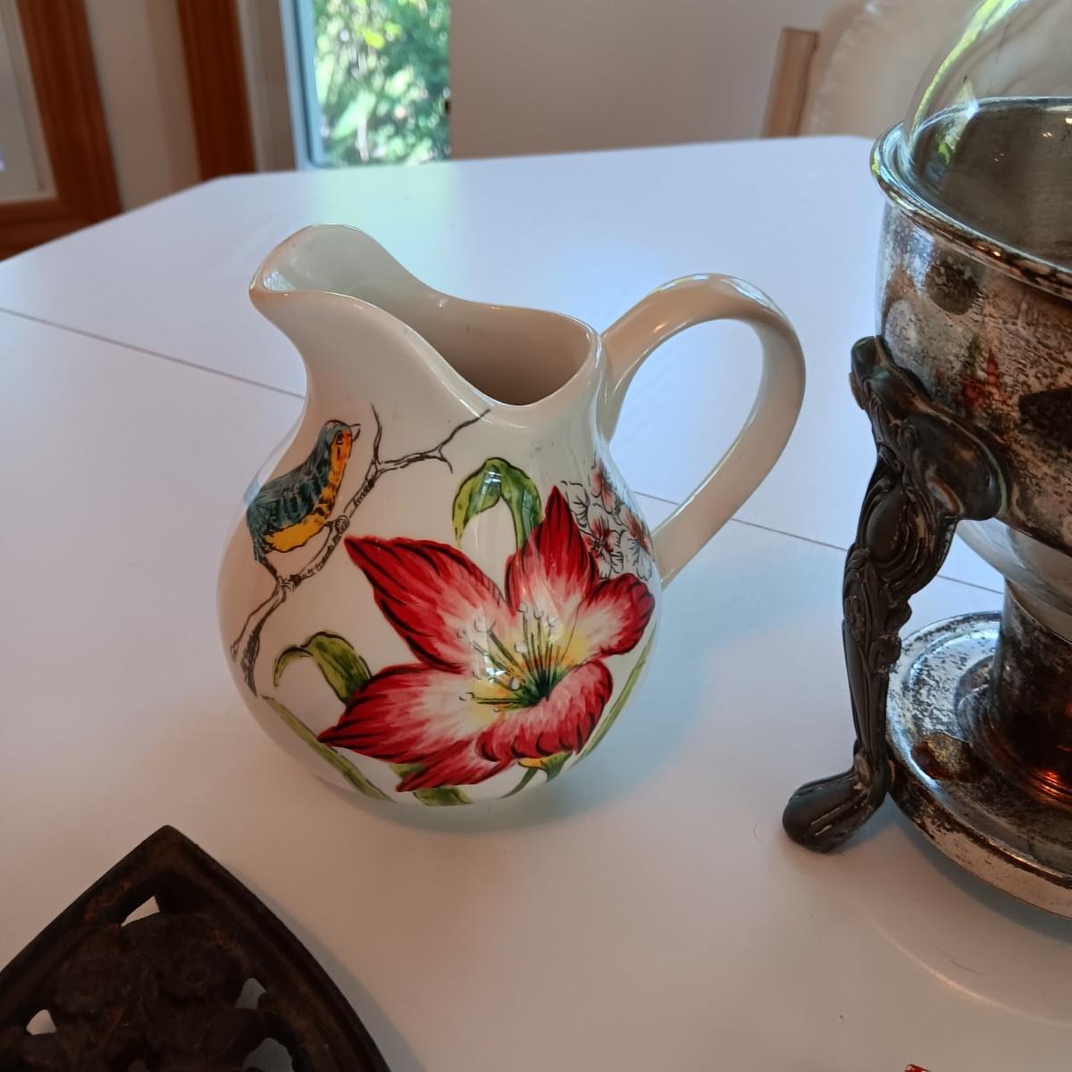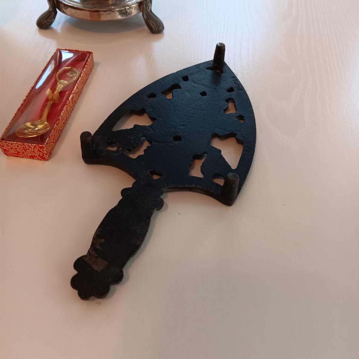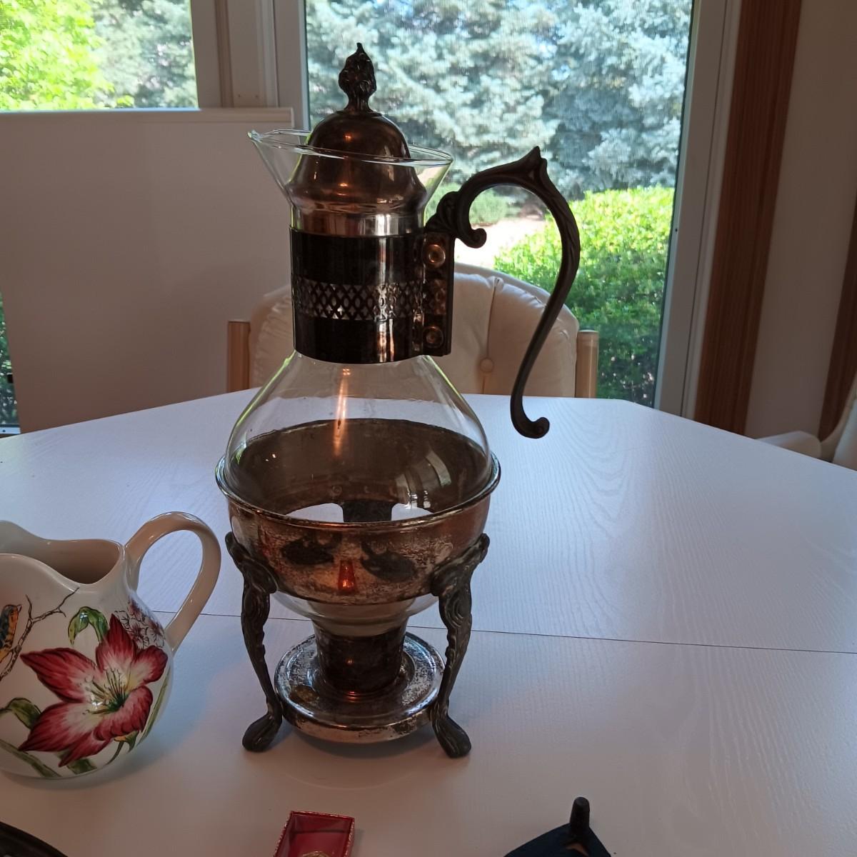 FANCY CARAFE, SMALL PITCHER, 2 CAST IRON TRIVETS