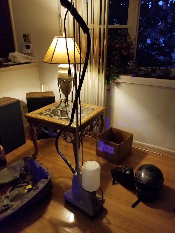 End Table, Lamp, Helmet, Steam Cleaner, Fisher spkrs, Gray Vase w/Faux flowers