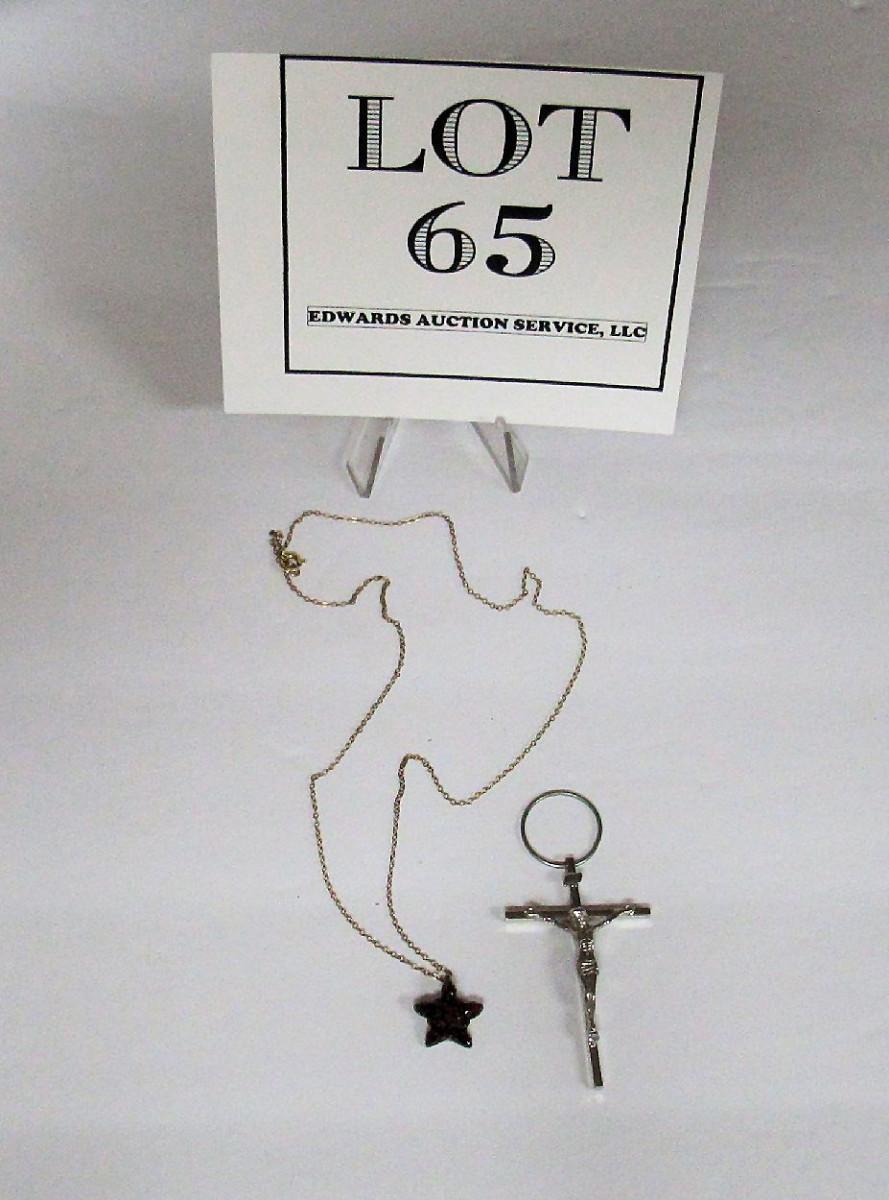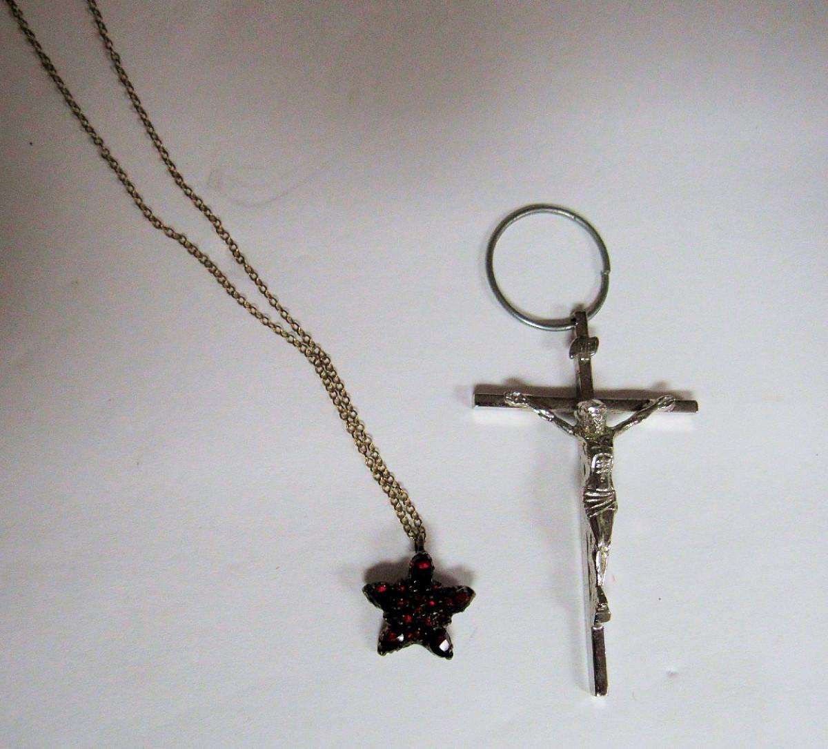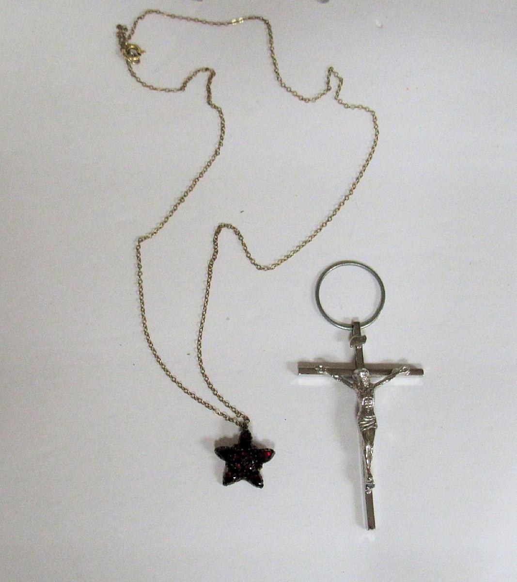 The cross is silver 1/20 12K GF and is very nice and detailed. The necklace is marked 1/20 12K GF and has almost garnet looking red rhinestones, very pretty. Some jewelry needs a very good cleaning. We did not check stones for chips or looseness. Shipping is available at shipping cost plus $5.00 handling fee on one box, $10.00 handling fee on two boxes, $15.00 handling fee on 3 boxes. Helps cover shipping materials and labor cost.